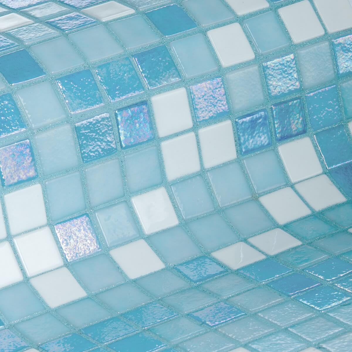 Tussen de stukjes glas in, zitten kunststof puntjes. Dit zijn de verbindingen om het glas als een mozaïek bij elkaar te houden. Het grote voordeel hiervan ten opzichte van regulier glasmozaïek welke verwerkt zijn om matjes is dat de Iris | Sky eenvoudig op maat te maken is in de verwerking.
