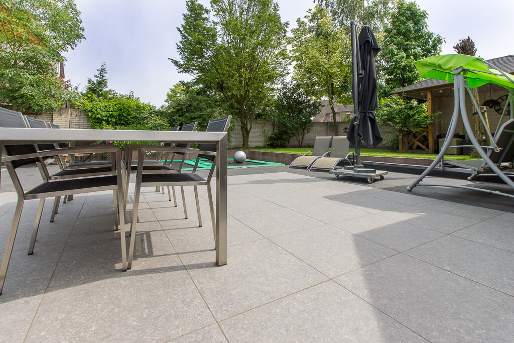 Voor binnen wilde de familie Pelz ontzettend graag een Belgisch hardsteen look. Er is uiteindelijk gekozen voor de Belgisch Hardsteen Look Keramiek Donker Gezoet. Voor het terras viel de keuze op de Nuovo Belgio Blue Rubbed.
