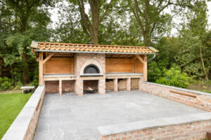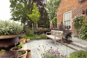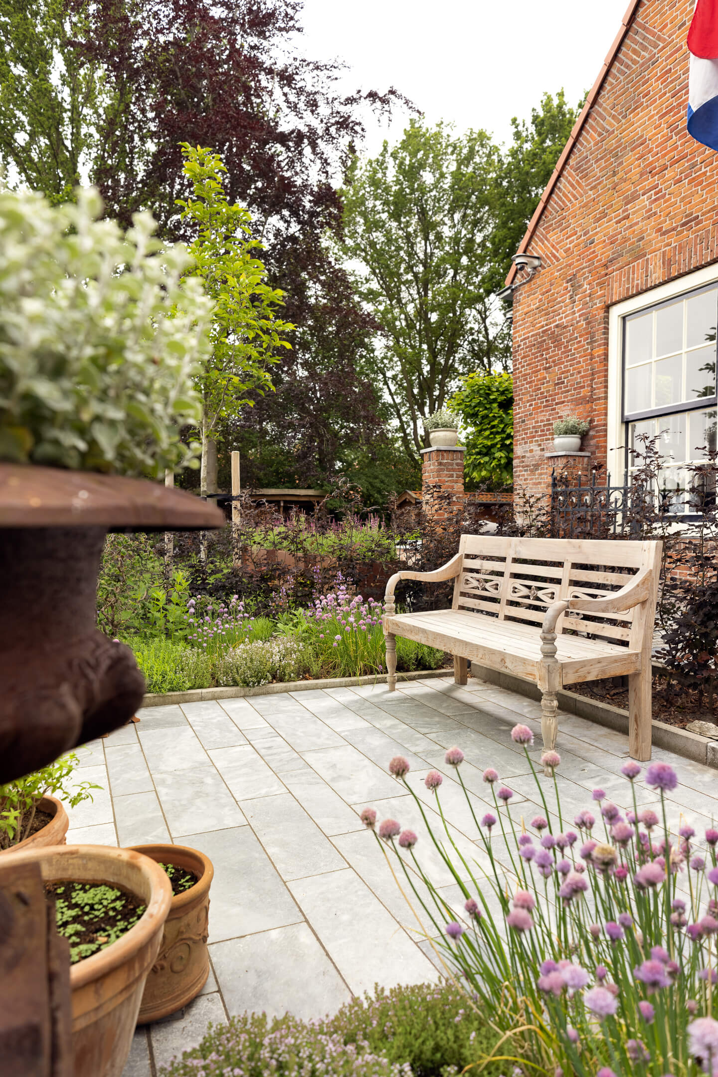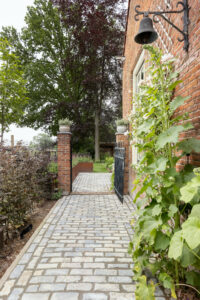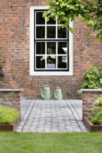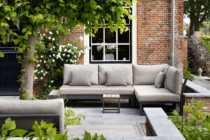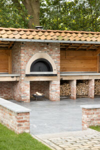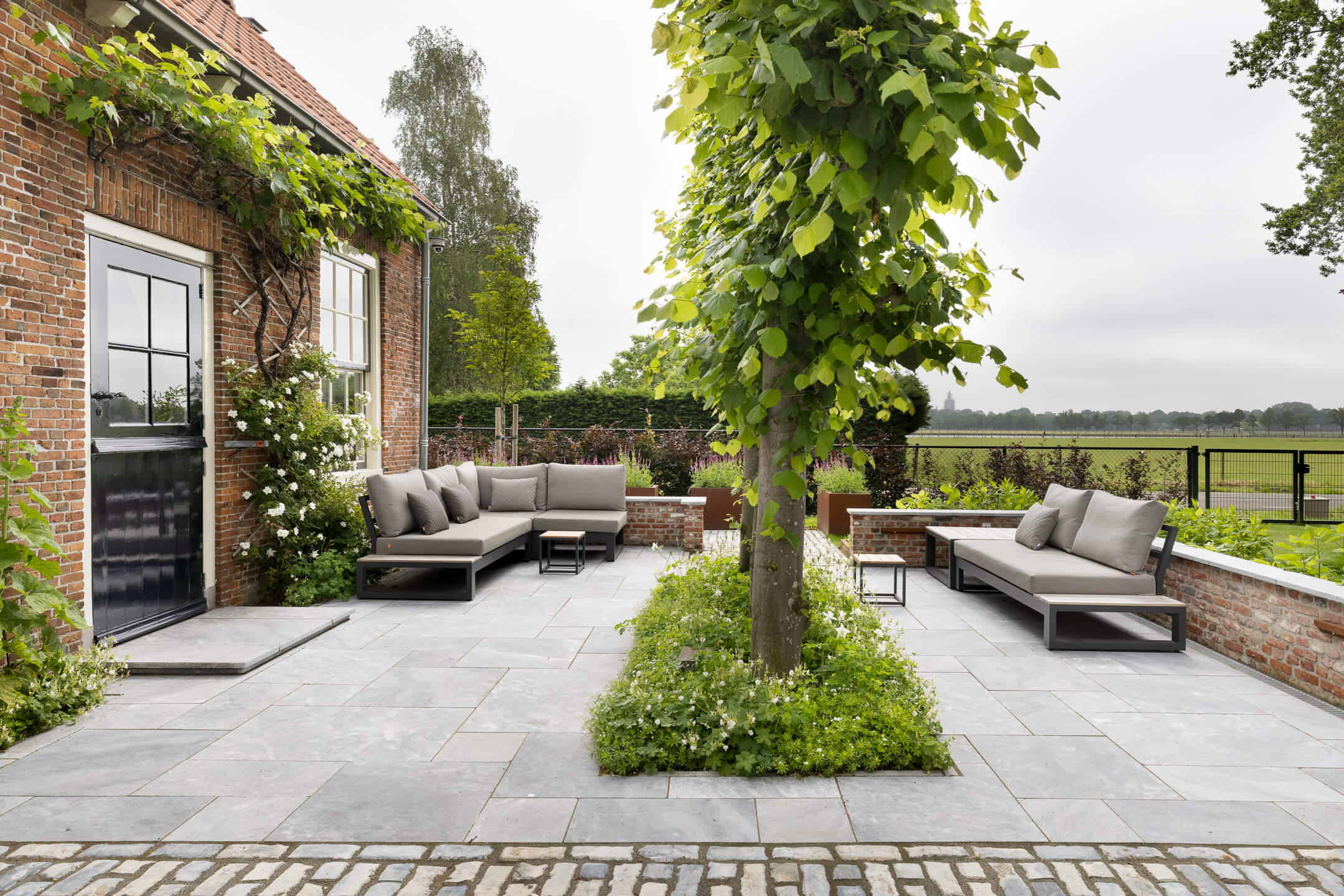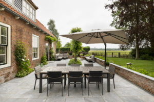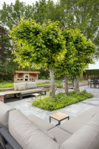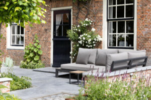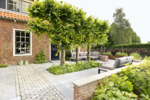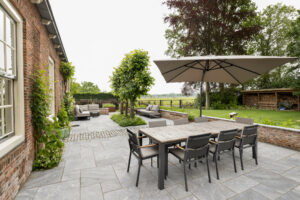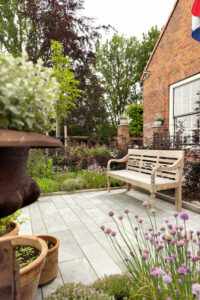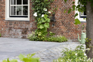 Hier is gekozen voor de Antique Blue light en de Scoria Bricks. De Antique Blue light is gekozen wegens het lichte karakter van de steen, en ook de mogelijkheden qua diverse formaten. Zo is in samenspraak met de klant echt gespeeld met de formaten van de stenen om zo een speelse doch overzichtelijke brabantse tuin de creëren.