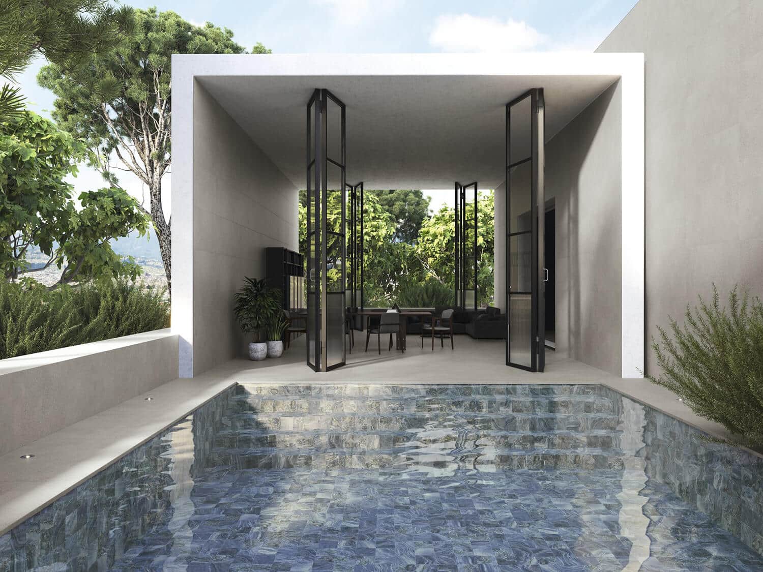 Afgeleid van de serie betonlooks met een neutrale uitstraling, hebben we sinds kort deze stijlvolle Armonia Grigia in ons assortiment. Naar aanleiding van een project welke we in Zeeland hebben uitgevoerd met dit materiaal, hebben we besloten deze 100x100cm tegels standaard aan te bieden. De luxe uitstraling en het feit dat de tegel gemakkelijk te combineren is met vrijwel alle kleuren in de tuin, maakt het een veelzijdige keuze. Het mooie aan deze serie is de mogelijkheid om deze buitentegel door te leggen naar de aansluitende binnenruimte als binnentegel. Tevens wordt de ‘Armonia Grigia’ veelal gecombineerd met bijvoorbeeld zwembaden met glasmozaïek.
