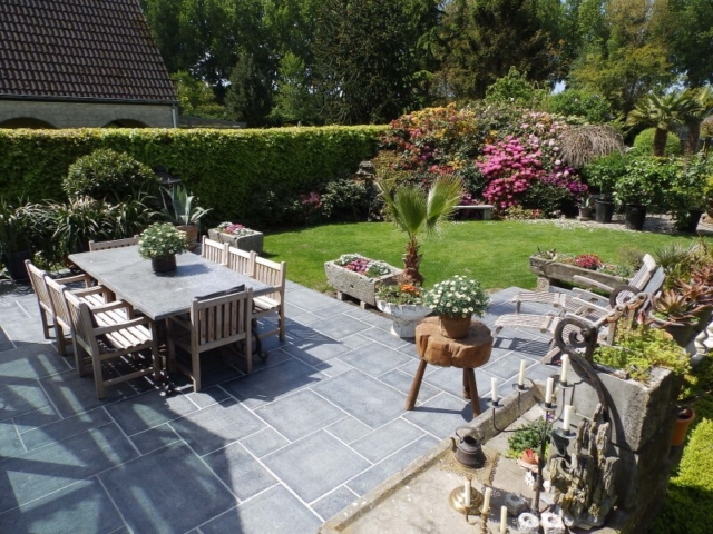 Onze Asian Blue Old Country Style is een zeer bijzondere terrastegel met een authentieke, nostalgische uitstraling. Deze hardstenen terrastegels worden namelijk met de hand verouderd. Het binnenvlak van de tegels wordt gebouchardeerd. En de buitenste rand van ca. 5-7 cm wordt gefrijnd. Dit geeft een prachtig eindresultaat!