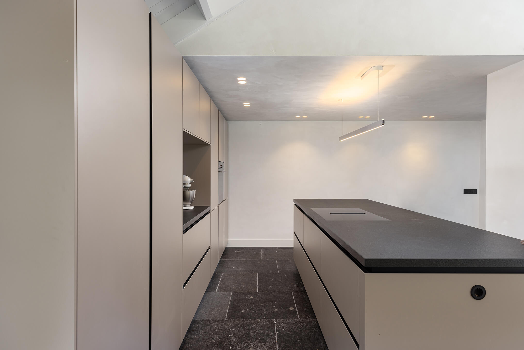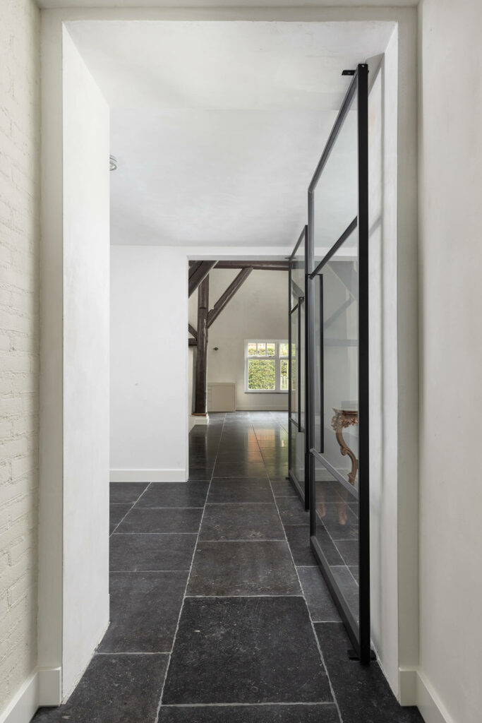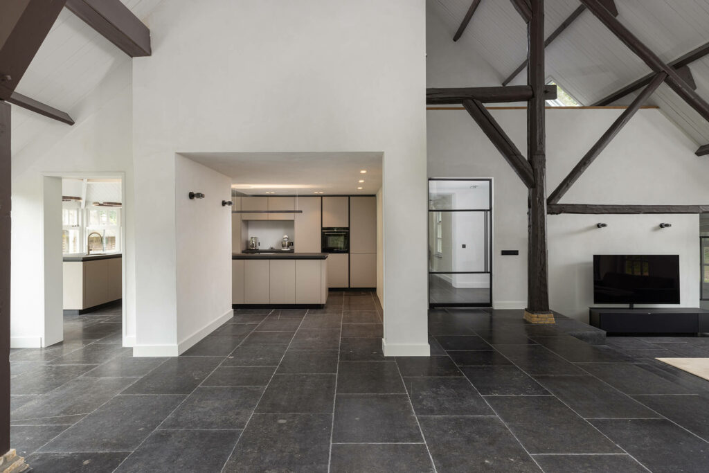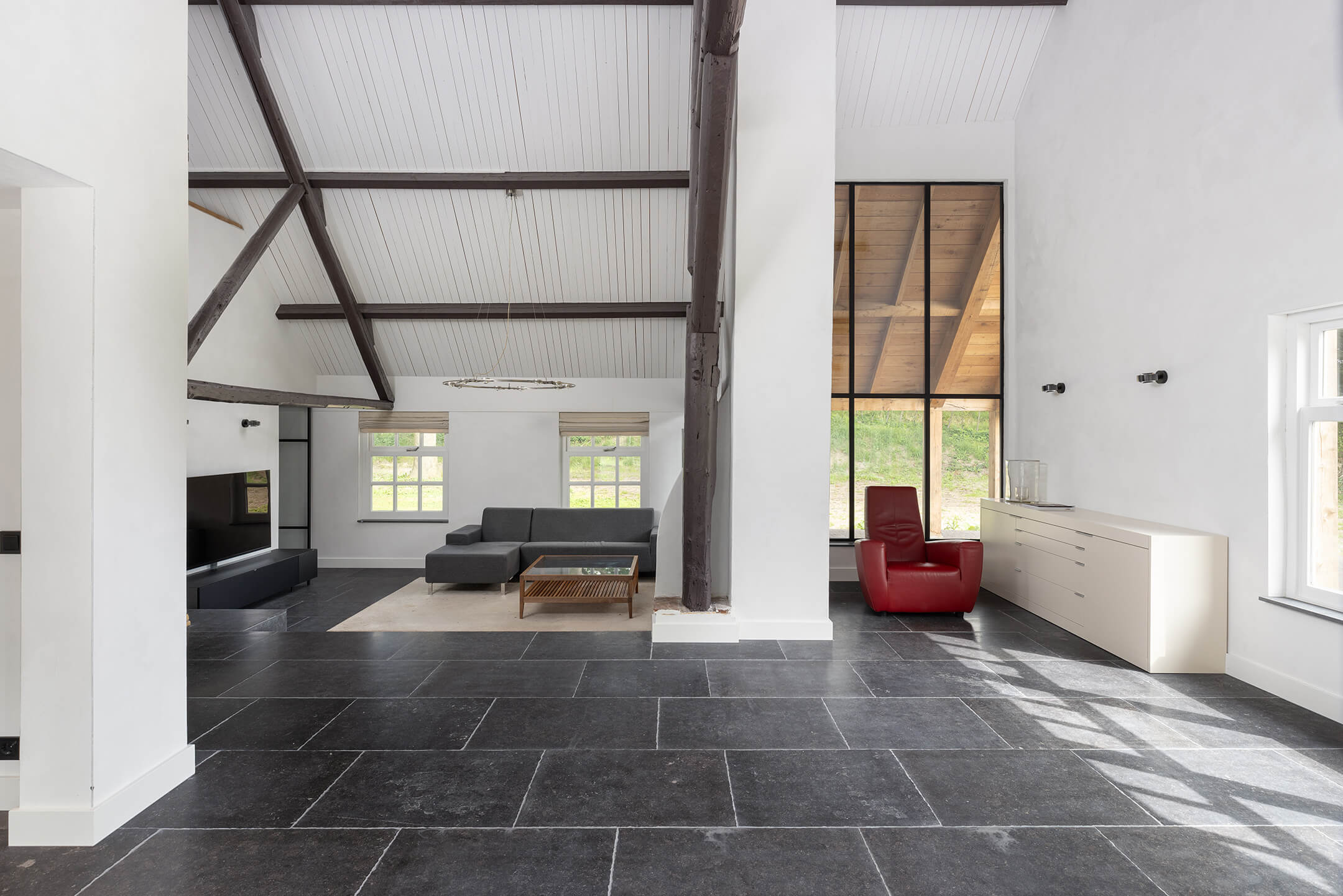 Geheel in stijl en met respect voor de bouwstijl van het huis is hier gekozen voor een Belgisch hardsteen vloer. Aangezien de vloer niet te verouderd mocht zijn, is hier gekozen voor onze Belgisch hardsteen “Anvers Antique”. Deze unieke afwerking staat bekend om zijn mat en blauw geschuurde oppervlak en gebroken zijdes. Een perfecte combinatie waardoor deze steen zowel een landelijk, als moderne uitstraling heeft.