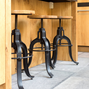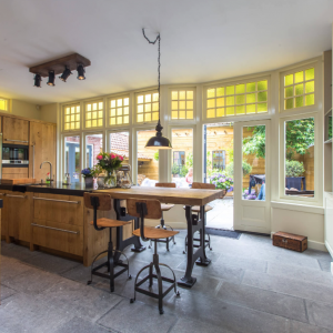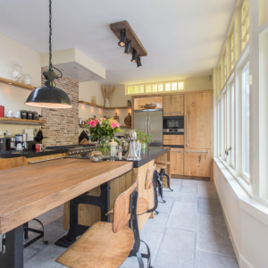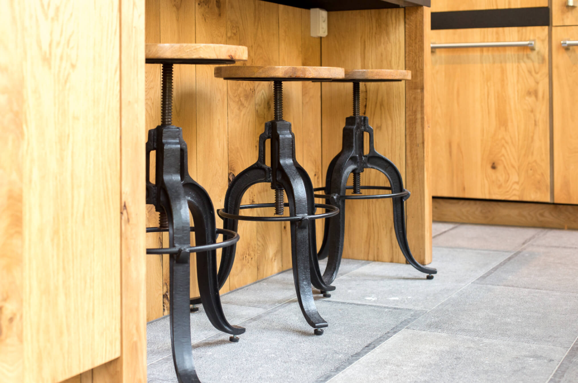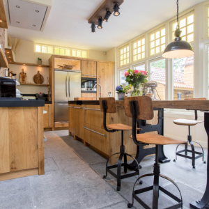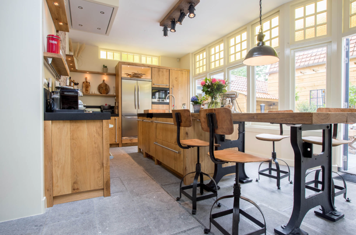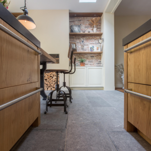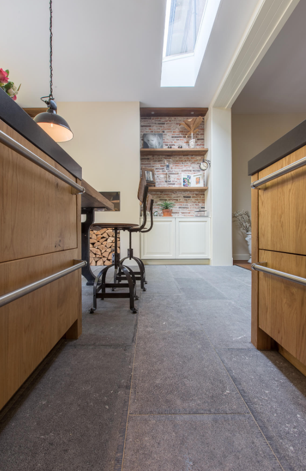 De verschillende natuurlijke materialen lijken elkaar aan te vullen. Het blauw grijze van de Belgische hardsteen is de perfecte combinatie met hout. Van donker geolied hout tot een mooie lichte eiken vloer.