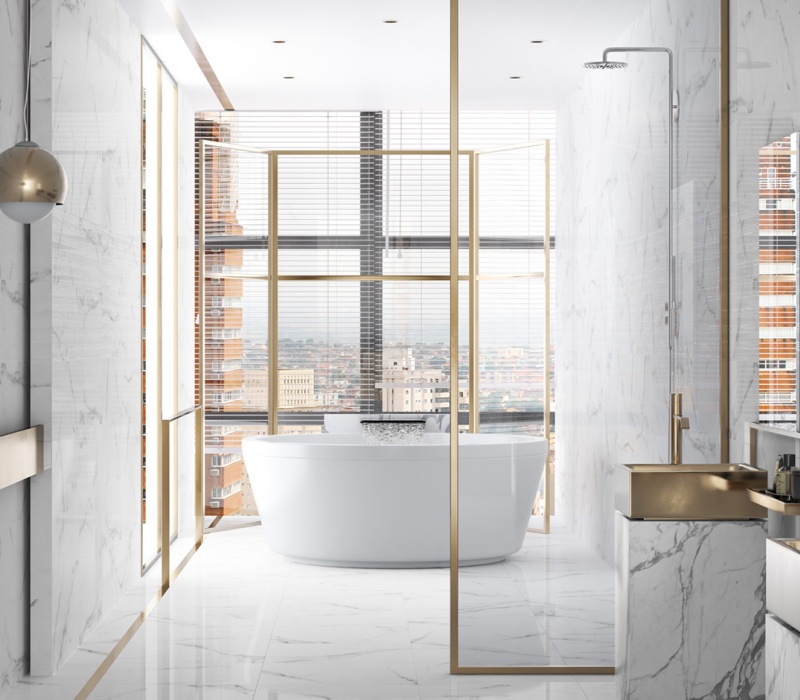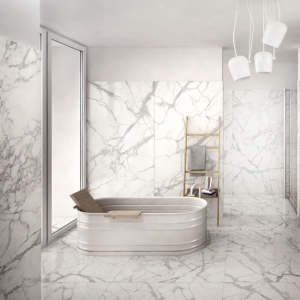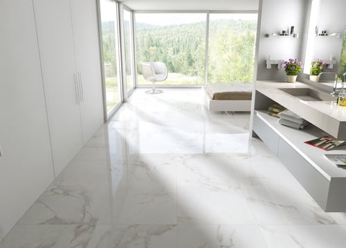 Zeker in bijv. de badkamer kan een keramische Bianco Carrara tegel een uitkomst bieden. Geen vlekjes, bestand tegen alle schoonmaakmiddelen en geen kalkaanslag.