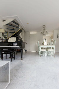 Doordat de Bianco Carrara gezoet is, heeft hij een lichte eiglans. Dit zorgt er ook direct voor dat de vloer een stuk meer vergevingsgezind is. De lichte loop sporen die in de loop van de tijd in deze vloeren zichtbaar worden, versterken alleen het karakter van de vloer maar.