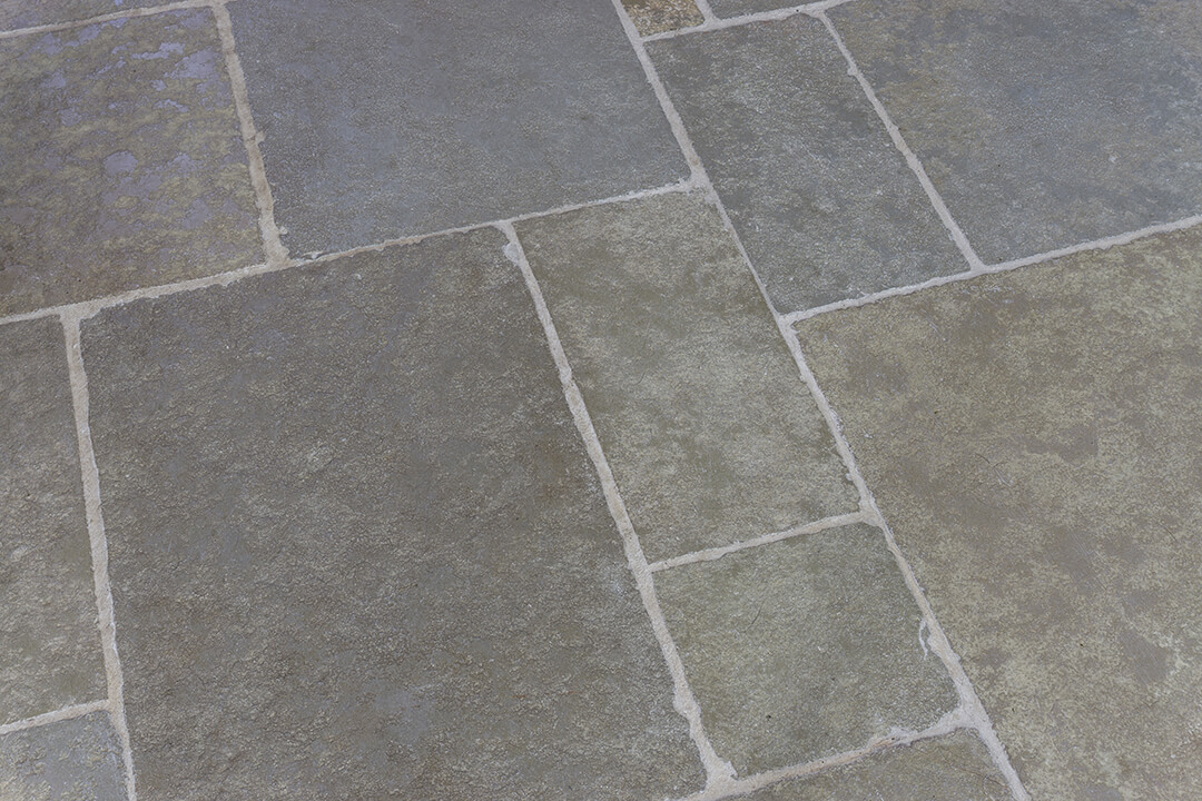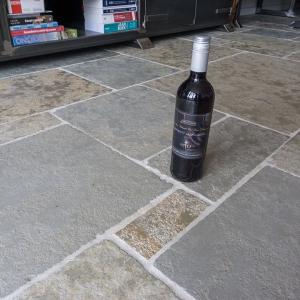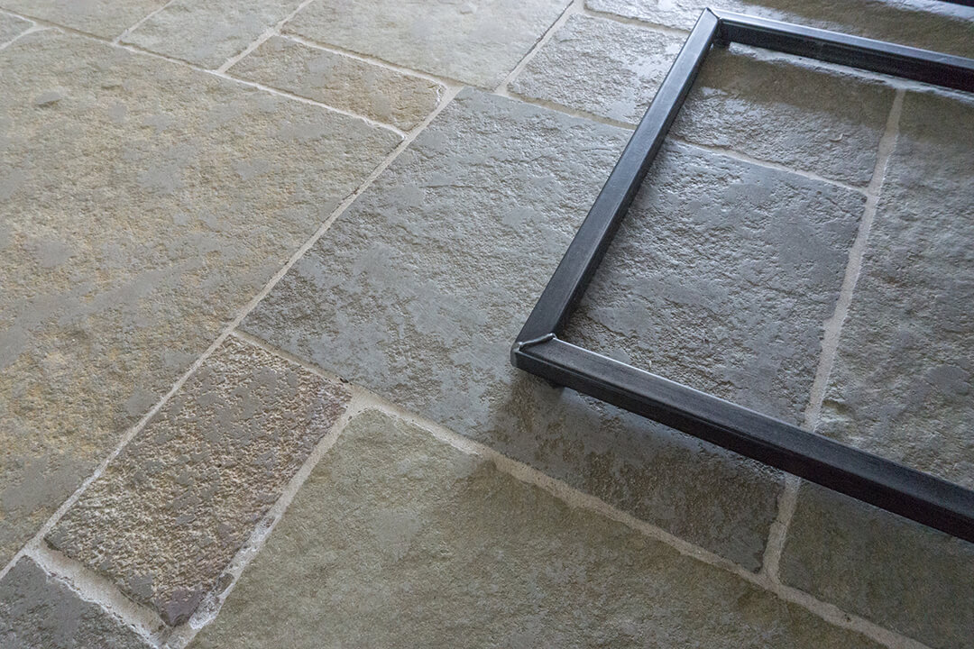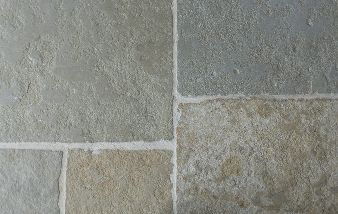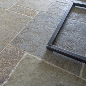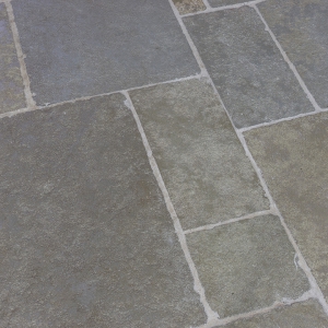 De Bourgondische Dallen Bourgogne Blanc is met de hand stoer en robuust verouderd. Het is daardoor een échte Bourgondische leefvloer.