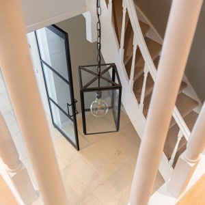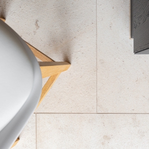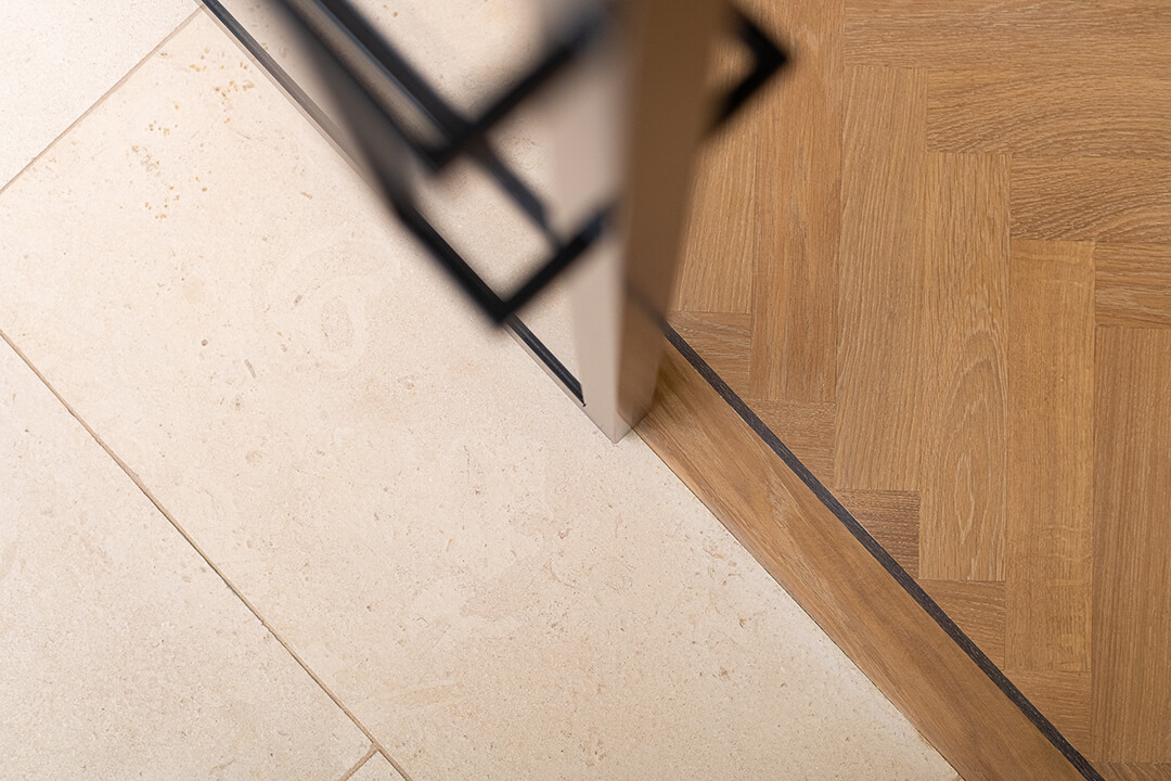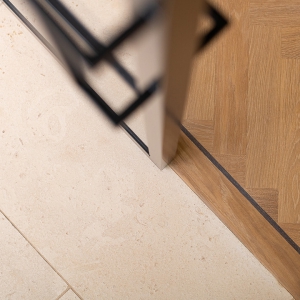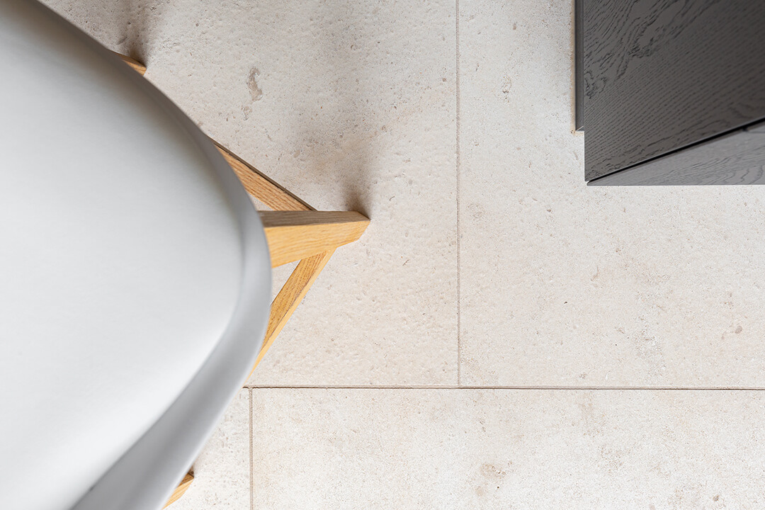 Deze prachtige Franse kalksteen met zijn subtiele strakke afwerking komt schitterend tot zijn recht in dit strakke, stijlvolle interieur.