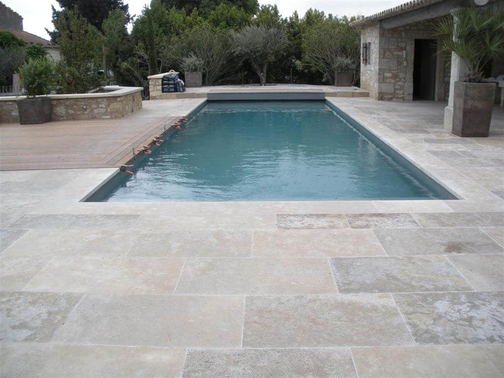 De Vieux Medoc Patiné is een unieke terrastegel voor bij een zwembad. Dit komt vooral door de kleuraccenten in de Vieux Medoc. De grijs/ beige tinten in deze Franse kalksteen hebben een warme maar robuuste uitstraling. De afwerking is eveneens indrukwekkend. Doordat deze tegels handmatig verouderd worden oogt de vloer stoer en doorleefd.