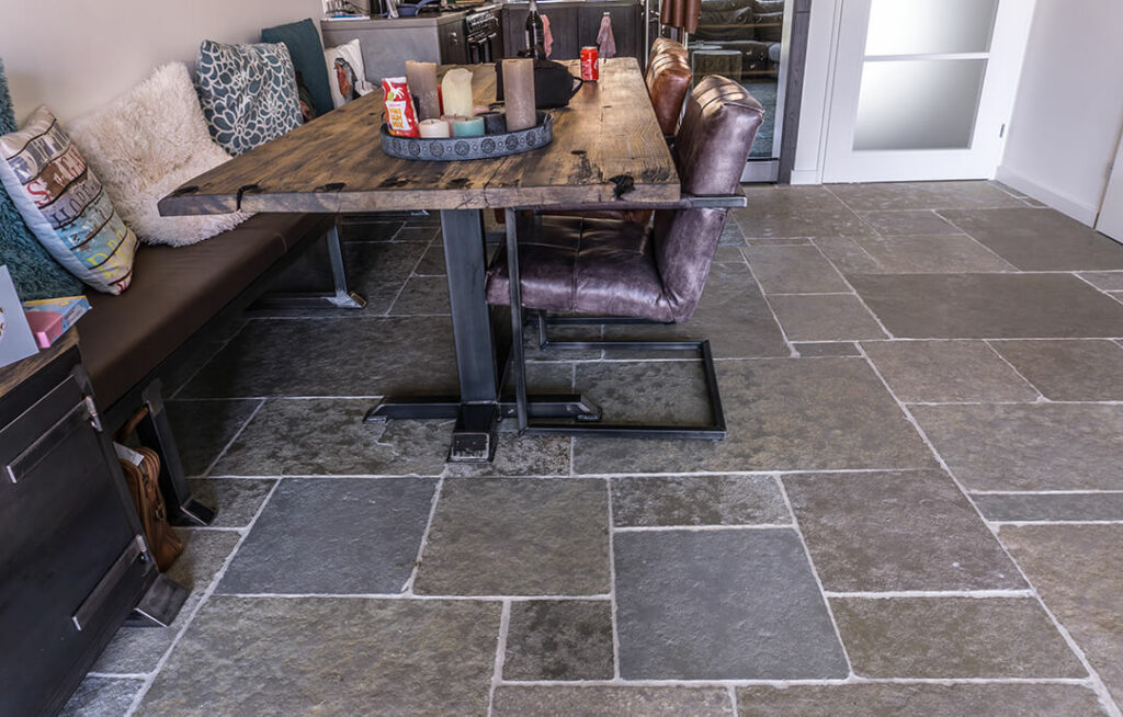 De Noires Bourgogne is een prachtige antraciet kleurige kalksteen vloer, die tegel voor tegel met de hand verouderd is. Het gemêleerde oppervlak van deze steen zorgt voor een sfeervolle uitstraling en een zorgeloos onderhoud.