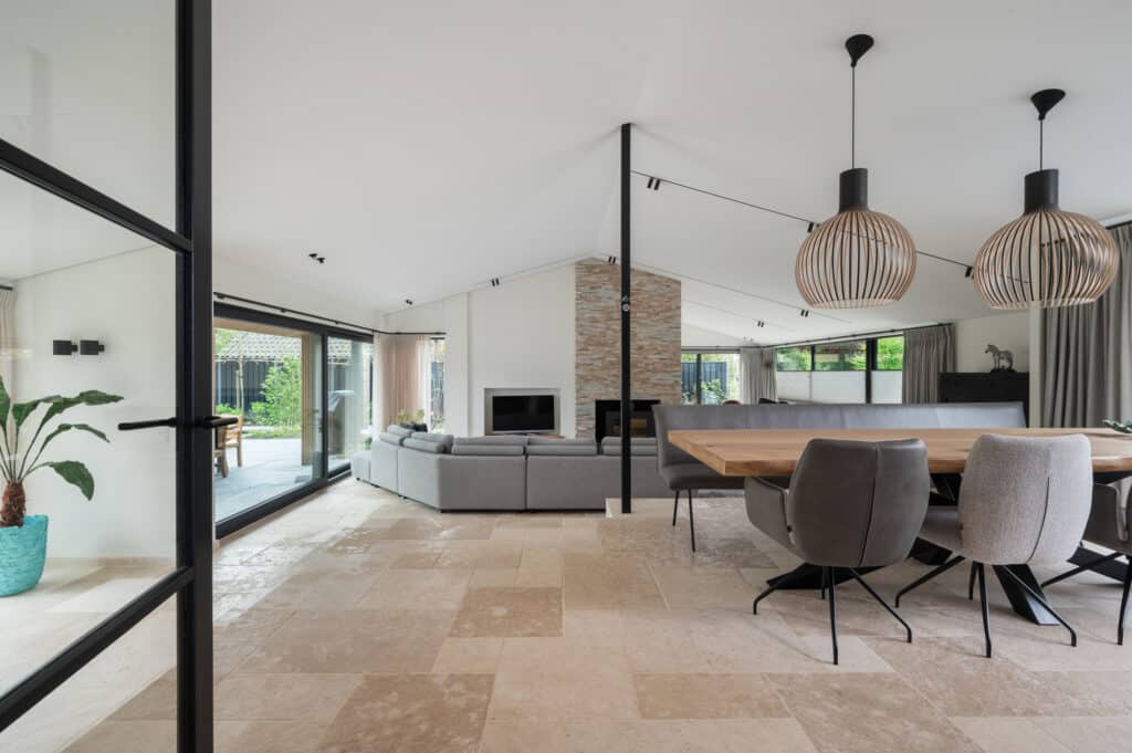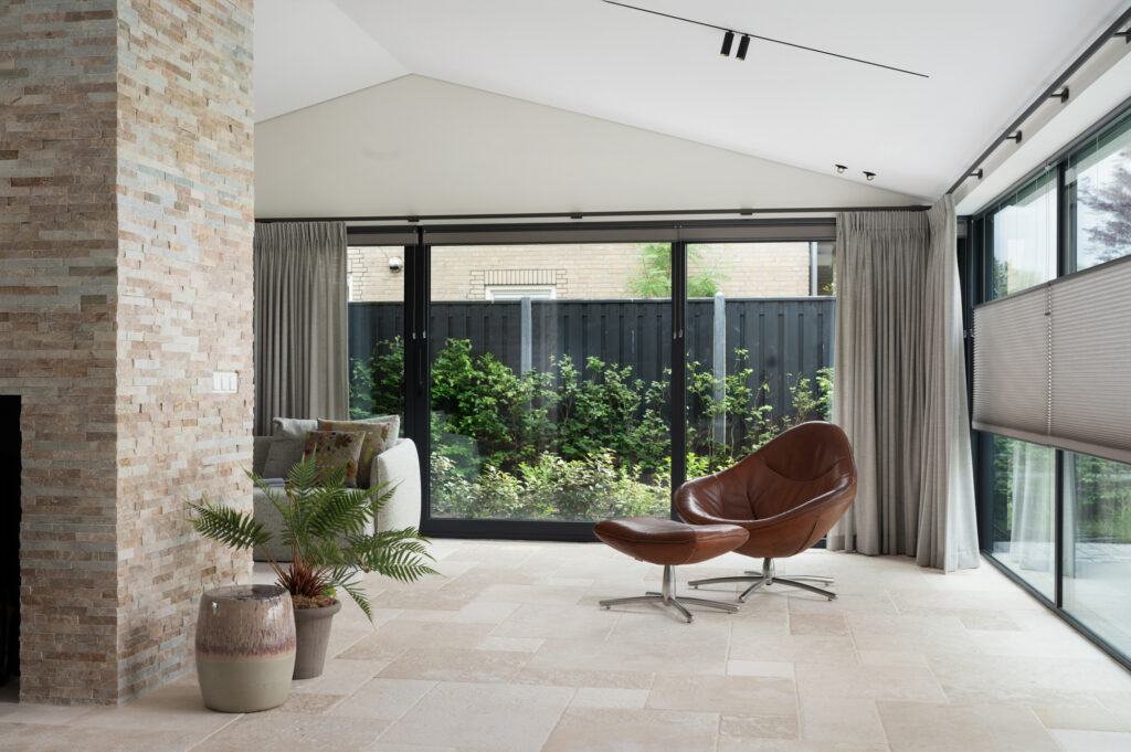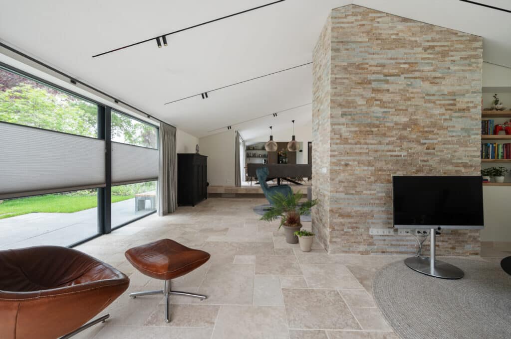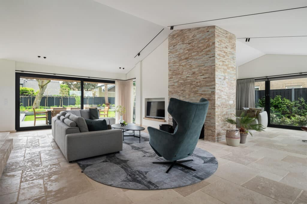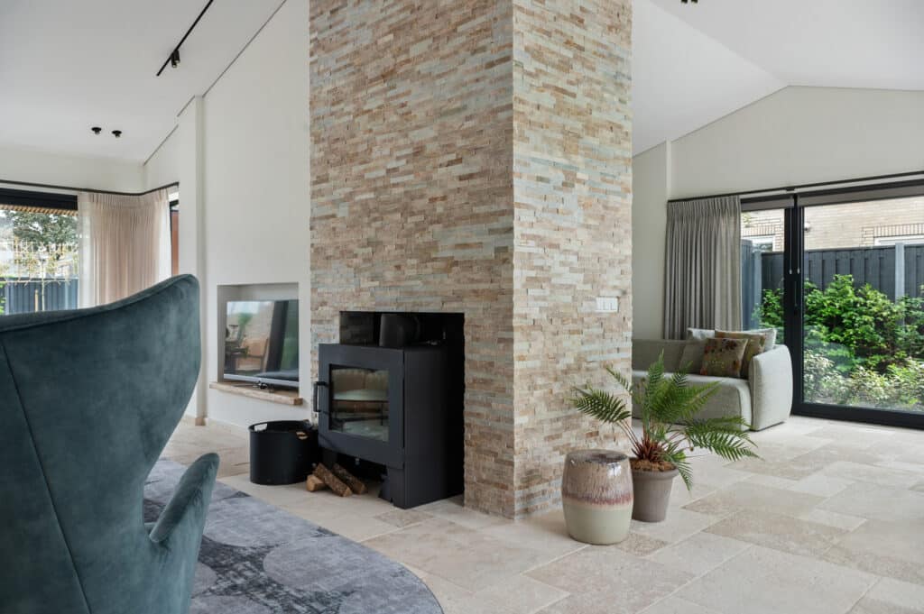 Voor de bekleding van de schouw in het centrum van de woonruimte hebben we een prachtige kwartsiet geselecteerd die perfect aansluit bij de vloer. Deze kwartsiet is verwerkt in Stonepanels met een breukruw oppervlak voor een stoere en robuuste uitstraling.