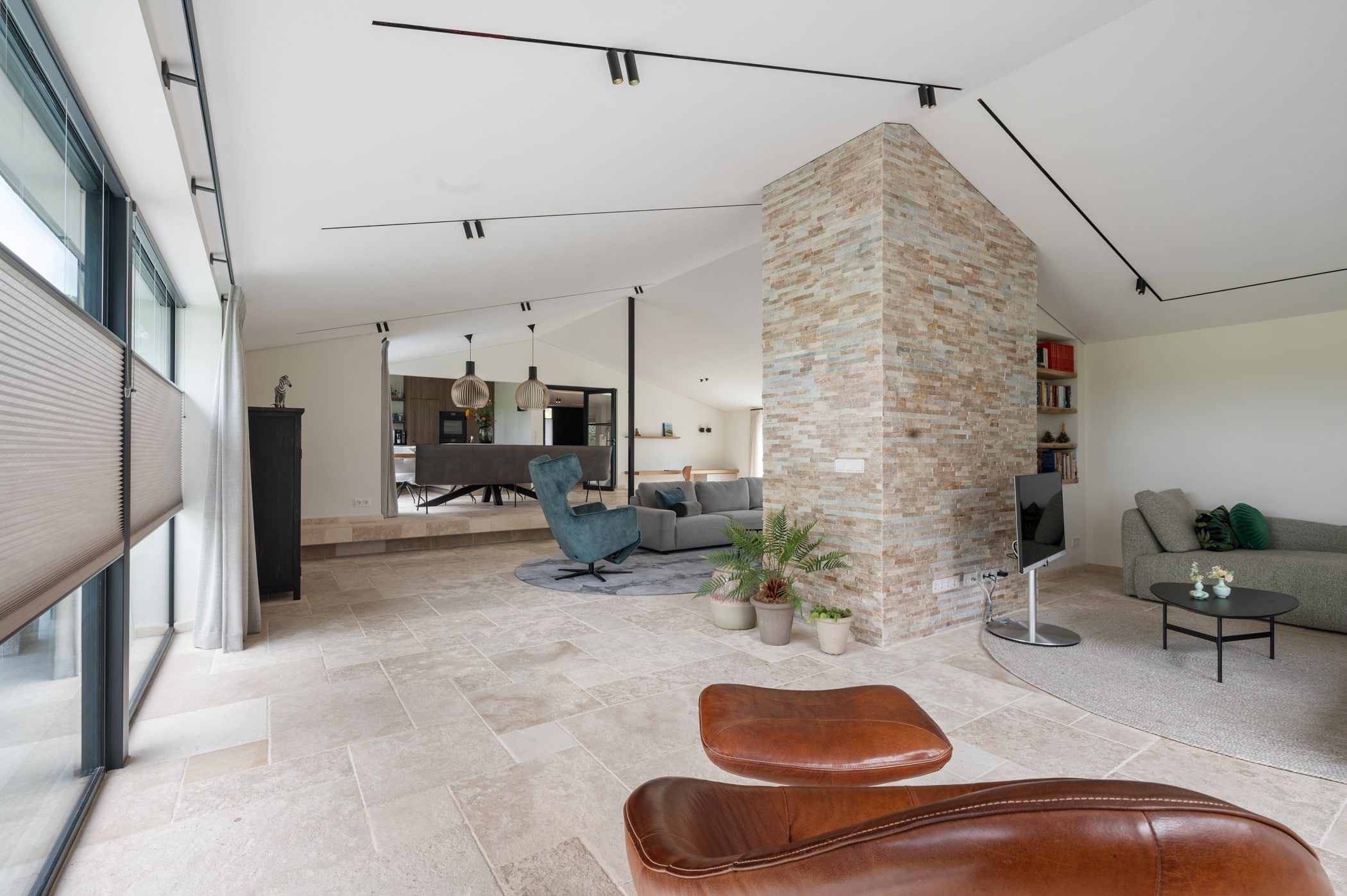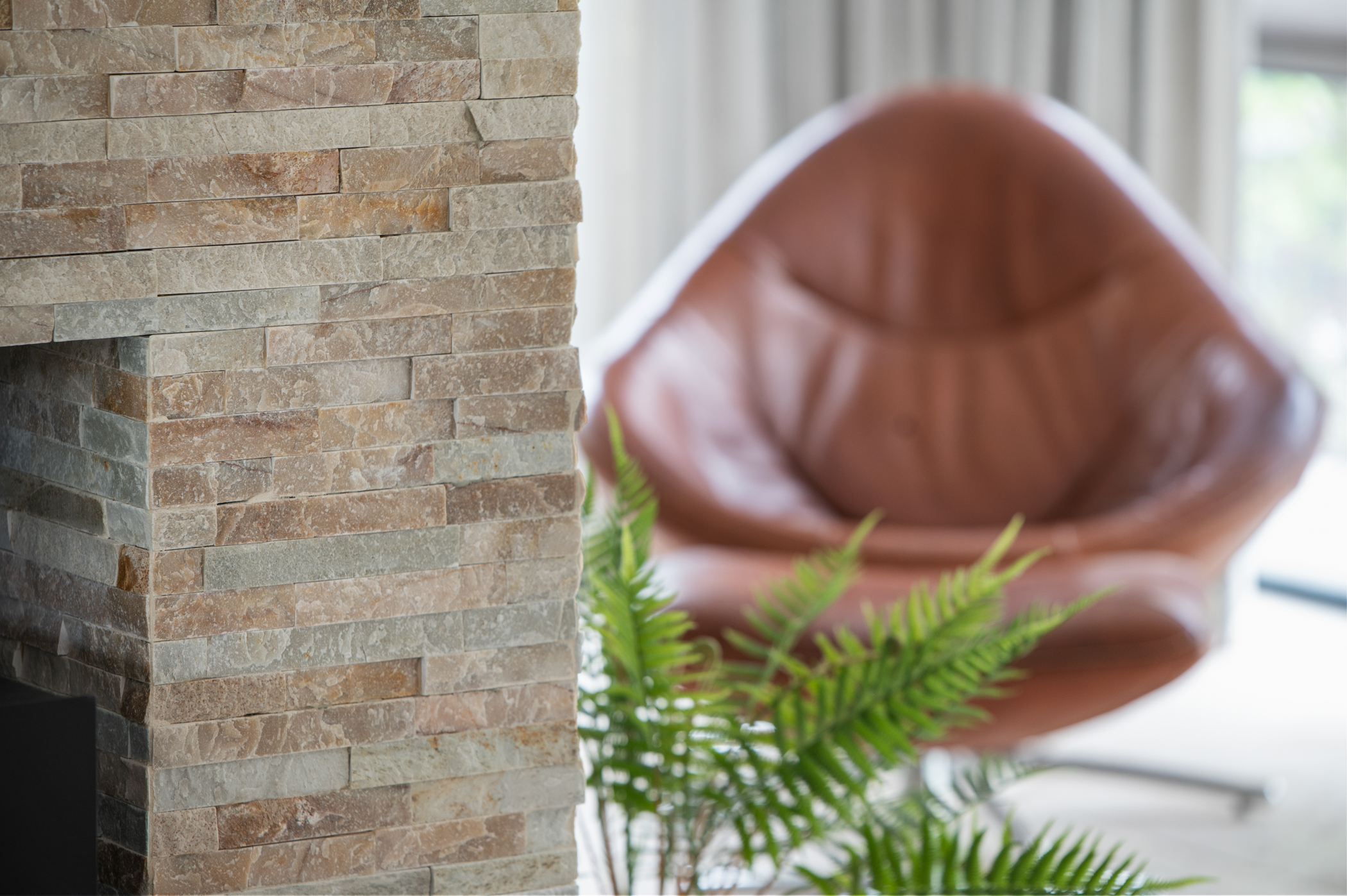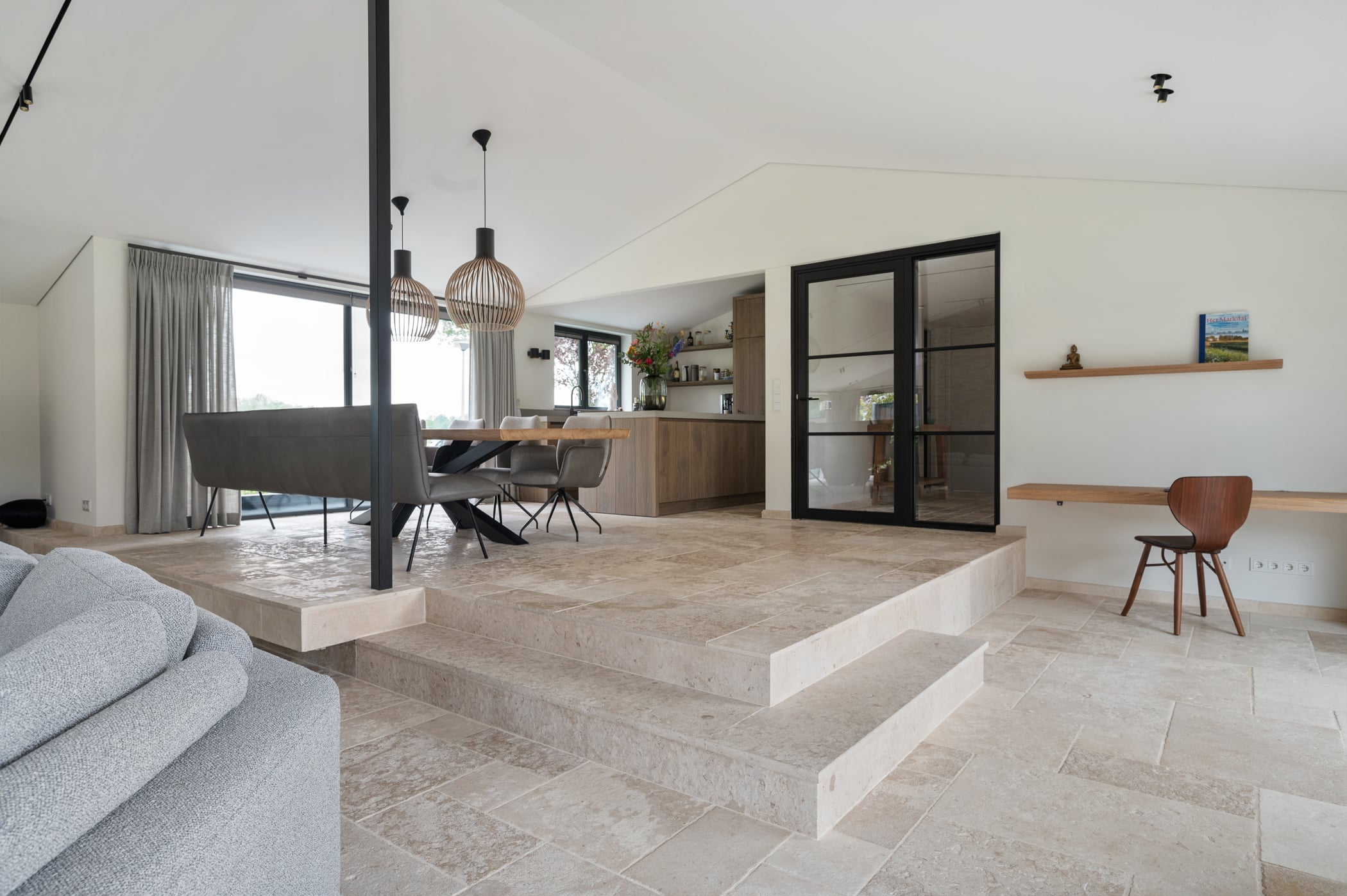 Voor de bekleding van de schouw in het centrum van de woonruimte hebben we een prachtige kwartsiet geselecteerd die perfect aansluit bij de vloer. Deze kwartsiet is verwerkt in Stonepanels met een breukruw oppervlak voor een stoere en robuuste uitstraling.