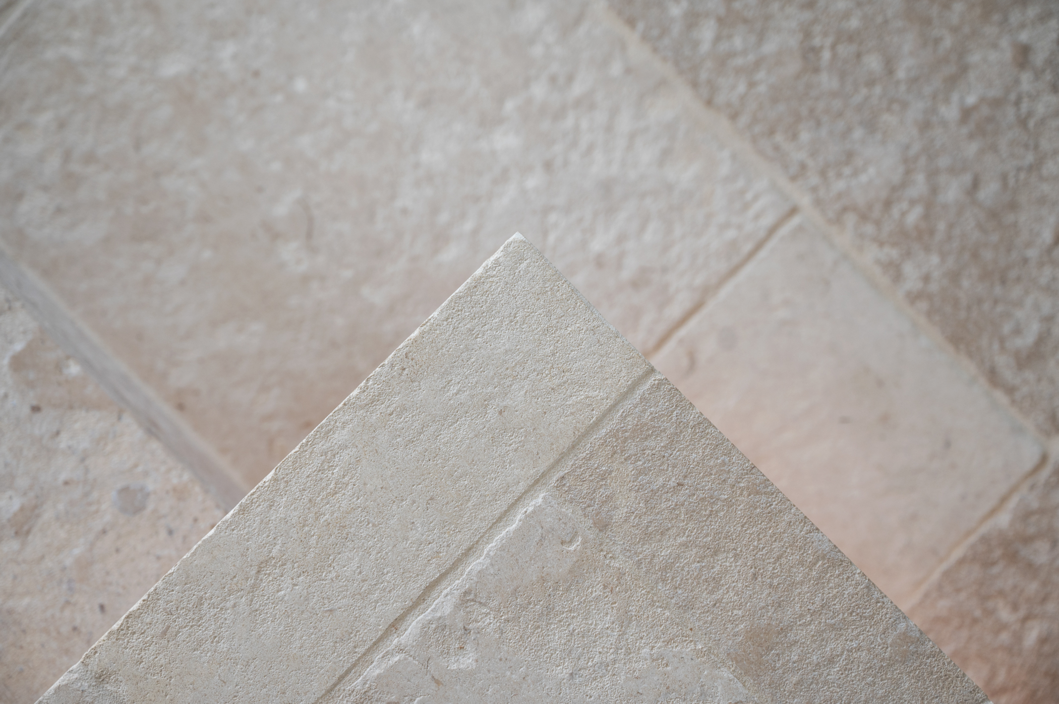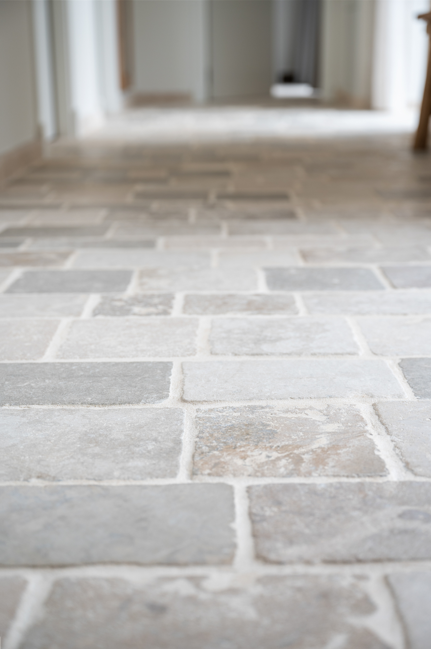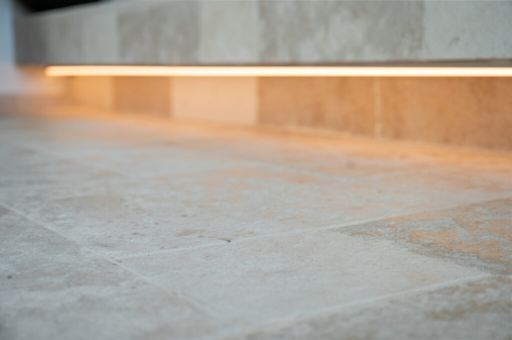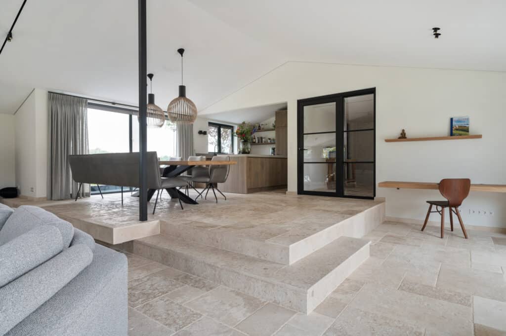 In de zoektocht naar de juiste materialen kwamen we al snel terecht bij onze Bourgondische Dallen “Patine de la maison”. De warme kleurschakeringen in combinatie met de subtiel verouderde afwerking van deze tegels, sloot precies aan bij de gewenste uitstraling van het toekomstige interieur. Qua formaat is er gekozen voor een Romaans verband. Dit verband heeft een speelse uitstraling en zorgt voor een perfecte verdeling van de kleuren die in deze Franse kalksteen voorkomen.