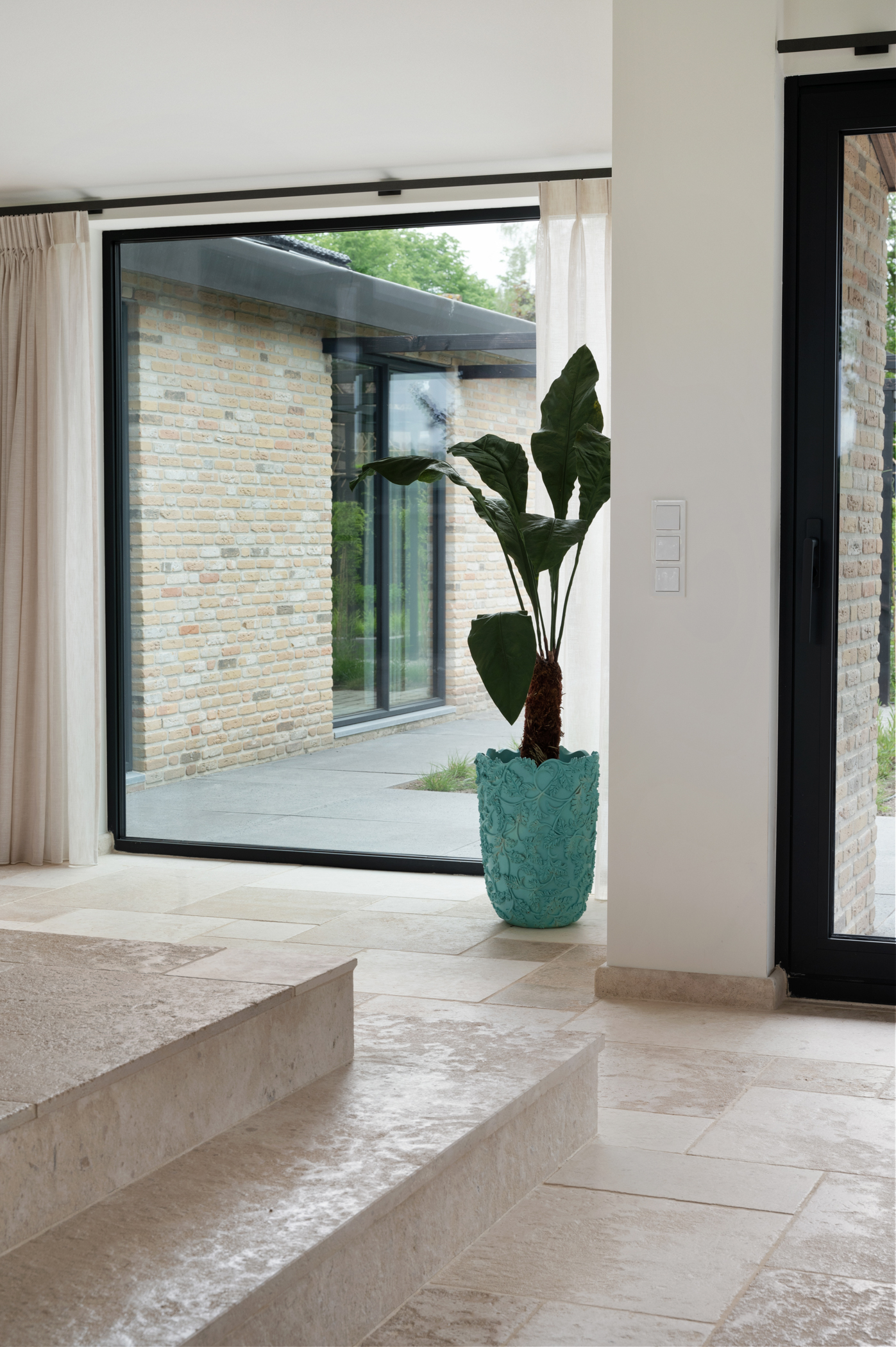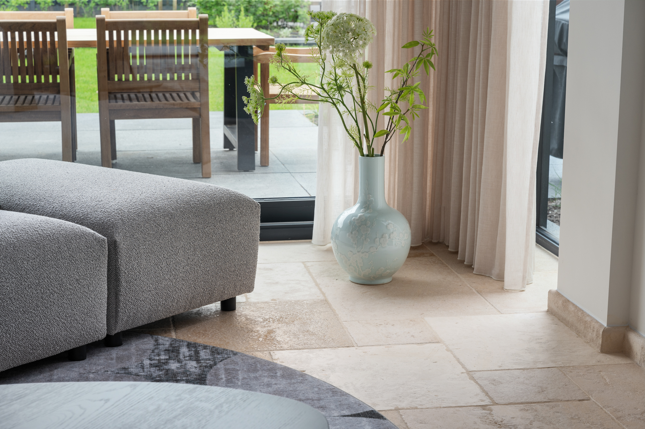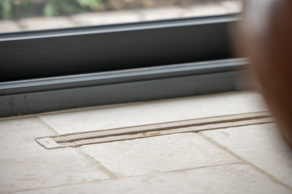 In de zoektocht naar de juiste materialen kwamen we al snel terecht bij onze Bourgondische Dallen “Patine de la maison”. De warme kleurschakeringen in combinatie met de subtiel verouderde afwerking van deze tegels, sloot precies aan bij de gewenste uitstraling van het toekomstige interieur. Qua formaat is er gekozen voor een Romaans verband. Dit verband heeft een speelse uitstraling en zorgt voor een perfecte verdeling van de kleuren die in deze Franse kalksteen voorkomen.