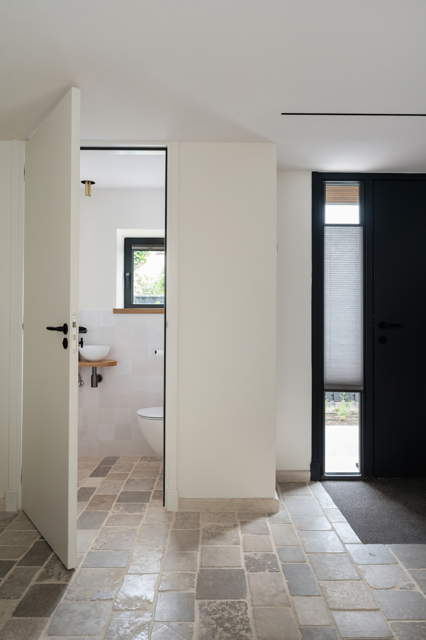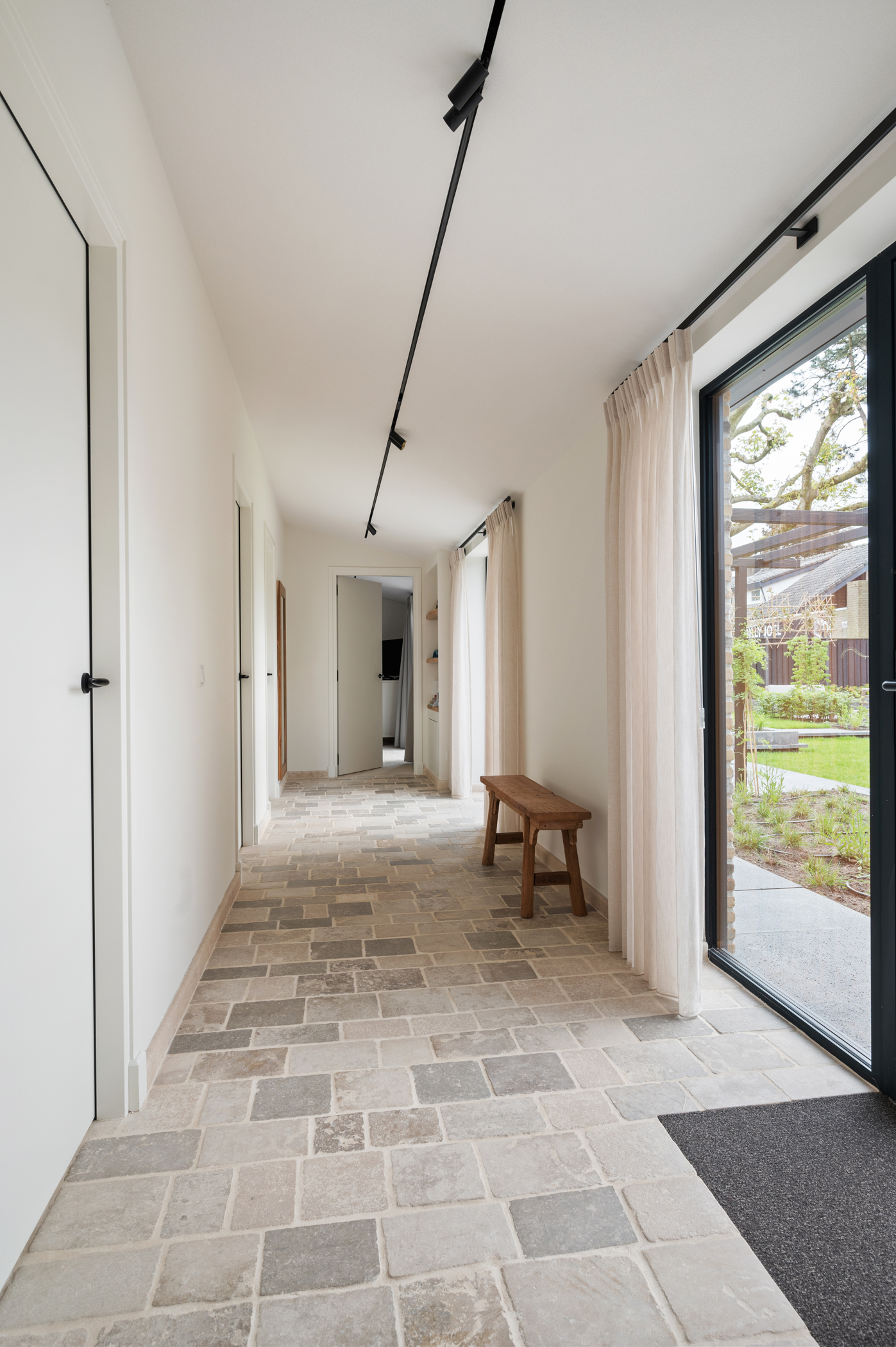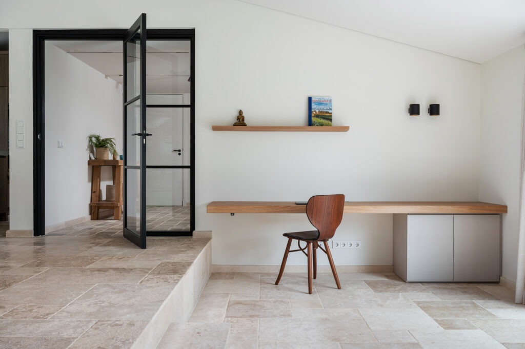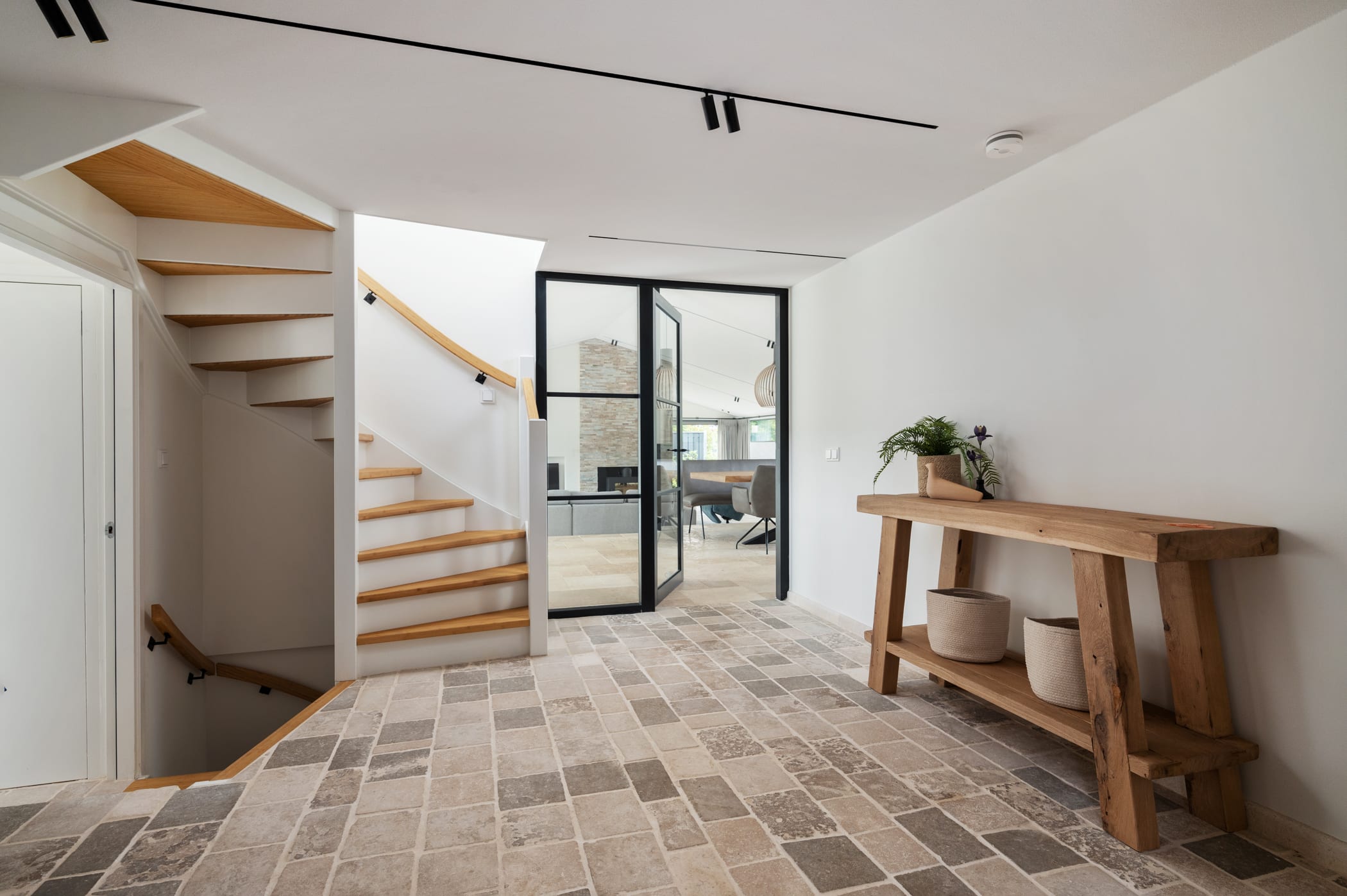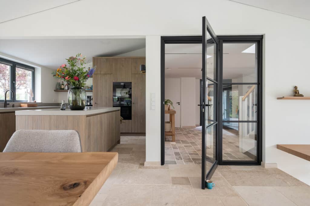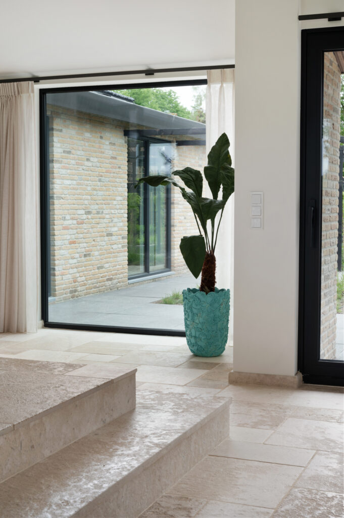 De hal en de gang zijn voor zien van kleinere Bourgondische Dallen, genaamd “Paves” Deze Paves hebben we laten vervaardigen uit dezelfde Franse kalksteen als de Bourgondische dallen in de rest van het huis. Een schitterende combinatie.