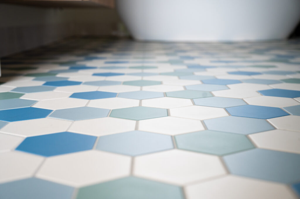 De badkamer is voorzien van hexagon Winckelmans tegels in verschillende kleuren. Een keuze van mevrouw die best spannend was. Maar wat een eindresultaat! Zeker in combinatie met onze handgemaakte Friese Witjes die hier als wandtegels zijn geplaatst.