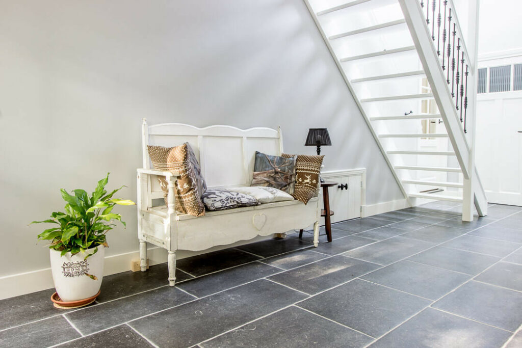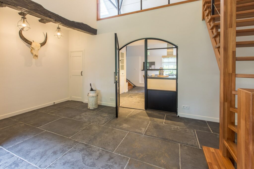 Door deze Belgische hardsteen op deze manier te bewerken krijgt de hardsteen een mooie lichte kleur en oogt hij zeer rustiek. De Belgisch Hardsteen Manueel Verouderd, Lichte Schuring is een vloer die weinig onderhoud vraagt en de perfecte vloer voor in een landelijke setting.