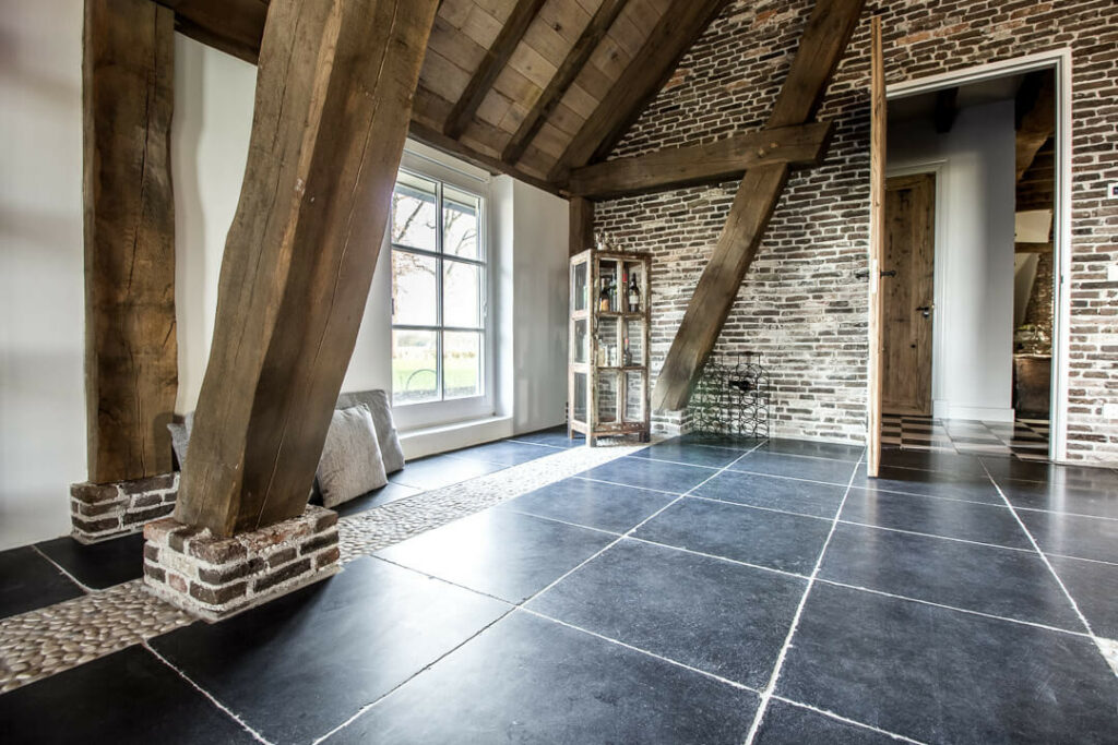 De Belgisch Hardsteen Manueel Verouderd, Donker Geborsteld heeft de uitstraling van een oude kerkvloer en wordt dan ook met regelmaat gebruikt in monumentale panden. Een prachtige Bourgondische vloer voor in een authentiek en / of landelijk interieur.