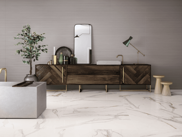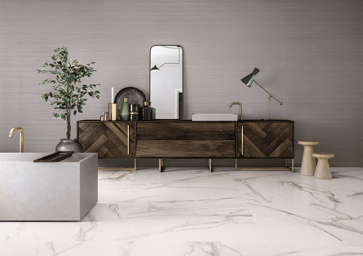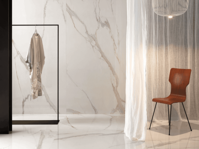 De Calacatta Gold, met zijn aders is geïnspireerd door de laatste trends waarin goud een hoofdrol speelt in het hedendaagse kleurenpalet.