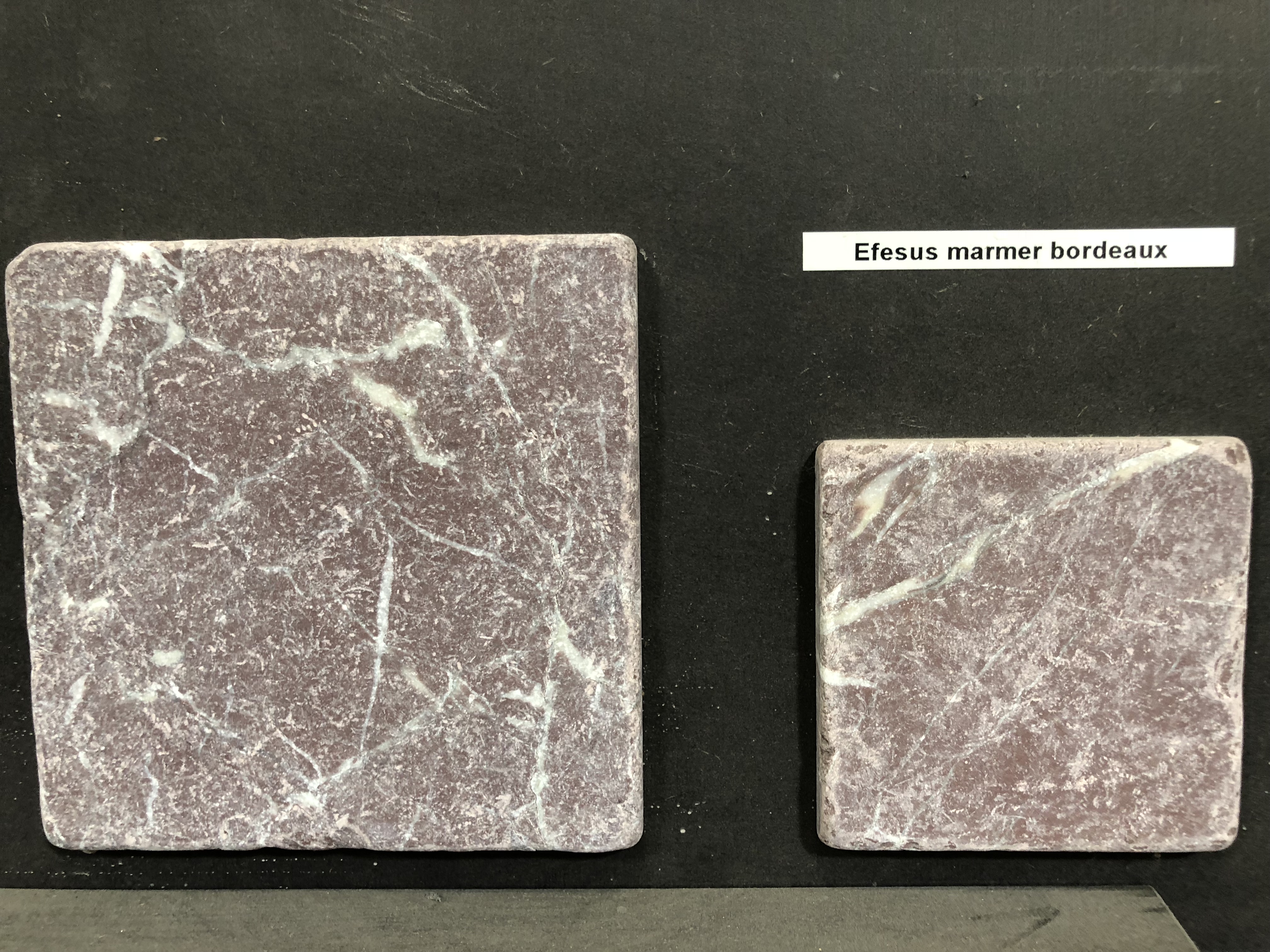 De Efesus Stone Collectie is een bijzondere natuursteen collectie van getrommelde marmer & travertin soorten. De Efesus Stone Marmer Bordeaux is één van de meest opvallende uit deze serie vanwege zijn prachtige Bordeaux rode kleur.