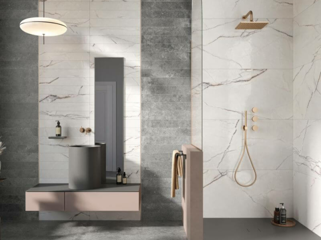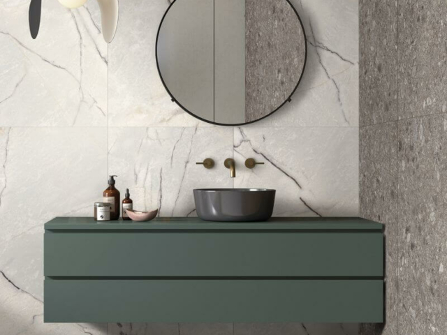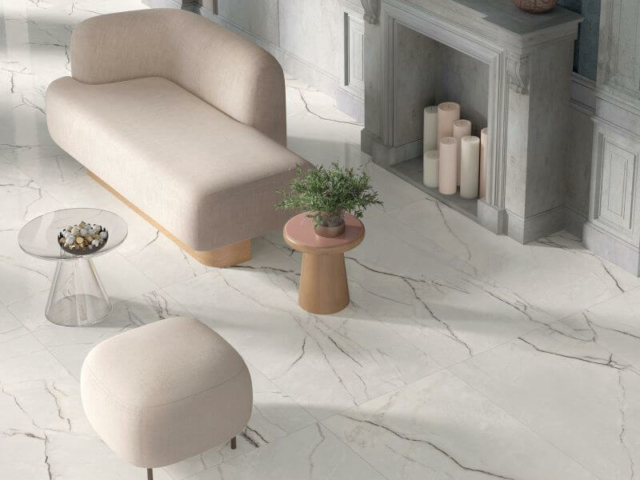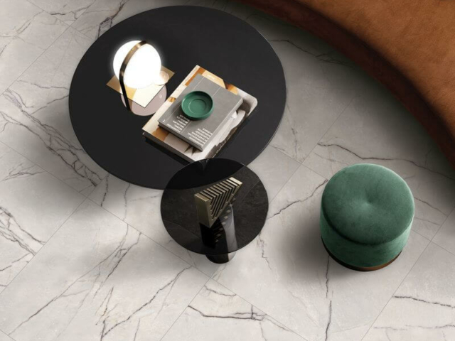 Portugese marmerinvloeden verwerkt in een chique keramische imitatie.