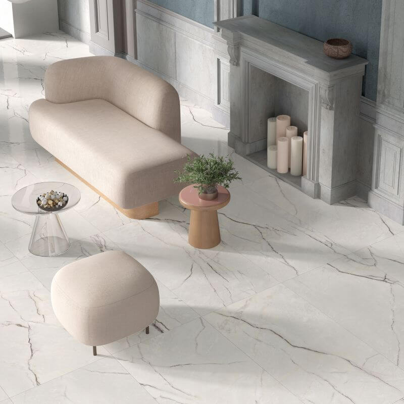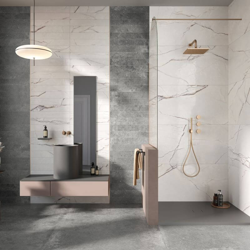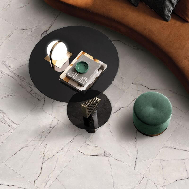Doordat deze tegel de eigenschap heeft dat het geen vuil en vocht absorbeert is hij zeer makkelijk in gebruik en tevens toepasbaar in iedere gewenste ruimte. Of het nu een ‘natte ruimte’ betreft zoals een badkamer/ wellness, of een moderne woonkeuken, het zou in dit geval altijd passen. De kleurtonen welke in de tegels terugkomen zorgen ervoor dat het veelal gecombineerd kan worden met bijvoorbeeld wit-, grijs- of (mat)zwarte kleurentinten of zelfs diverse houtsoorten. De witte (net van het wit af) boventoon is geselecteerd in combinatie met een subtiele grijzige gloed en de aderselectie bevatten antraciet-, goudbruin- en grijstinten.