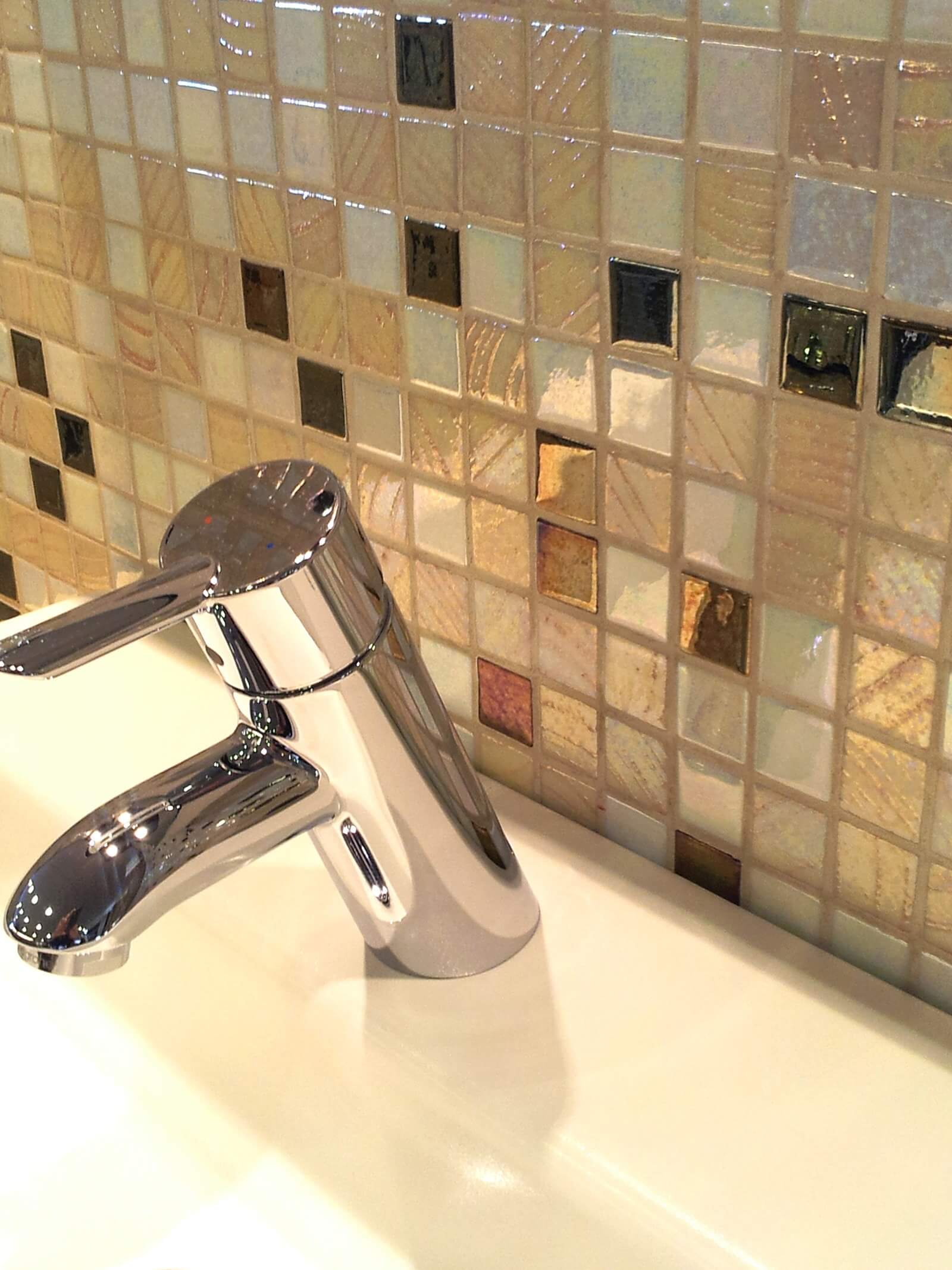 Door de warme combinatie van licht geel wit en goud bruin mix van metallic kleuren past deze mozaiek perfect bij zowel landelijke als moderne ruimtes.