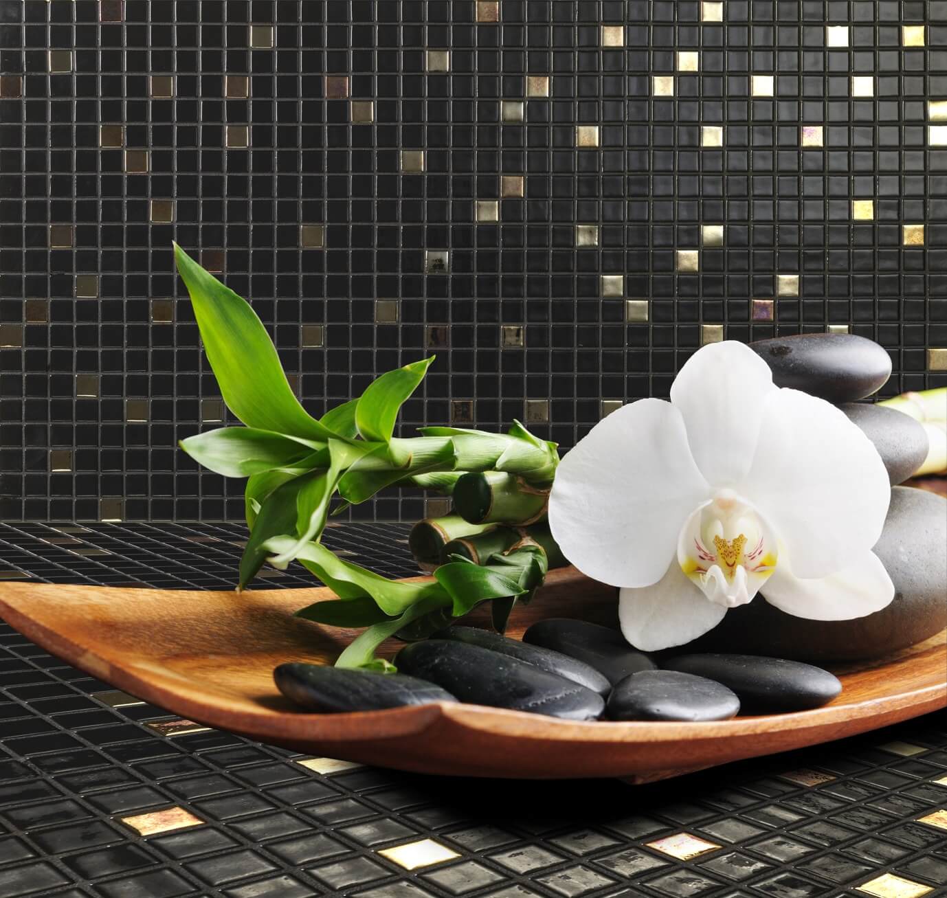 Door de warme combinatie van donkere goudbruine zwarte en gouden mix van metallic kleuren past deze mozaiek perfect bij zowel landelijke als moderne ruimtes.