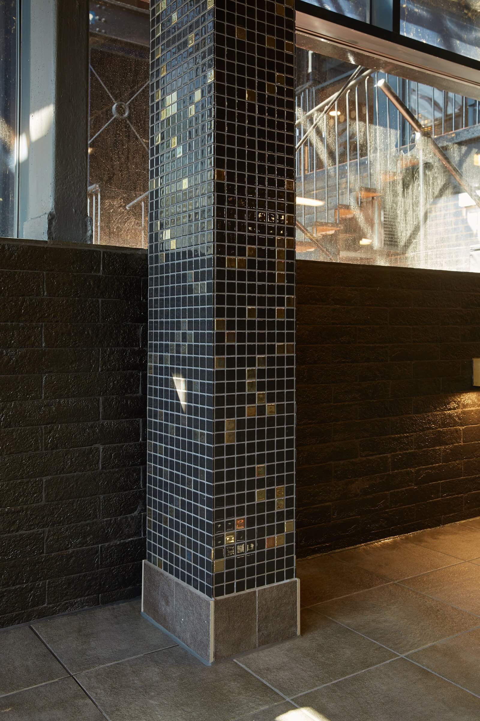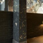 Tussen de stukjes glas in, zitten kunststof puntjes. Dit zijn de verbindingen om het glas als een mozaïek bij elkaar te houden. Het grote voordeel hiervan ten opzichte van regulier glasmozaïek welke verwerkt zijn om matjes is dat De Cocktail | Eclipse eenvoudig op maat te maken is in de verwerking.