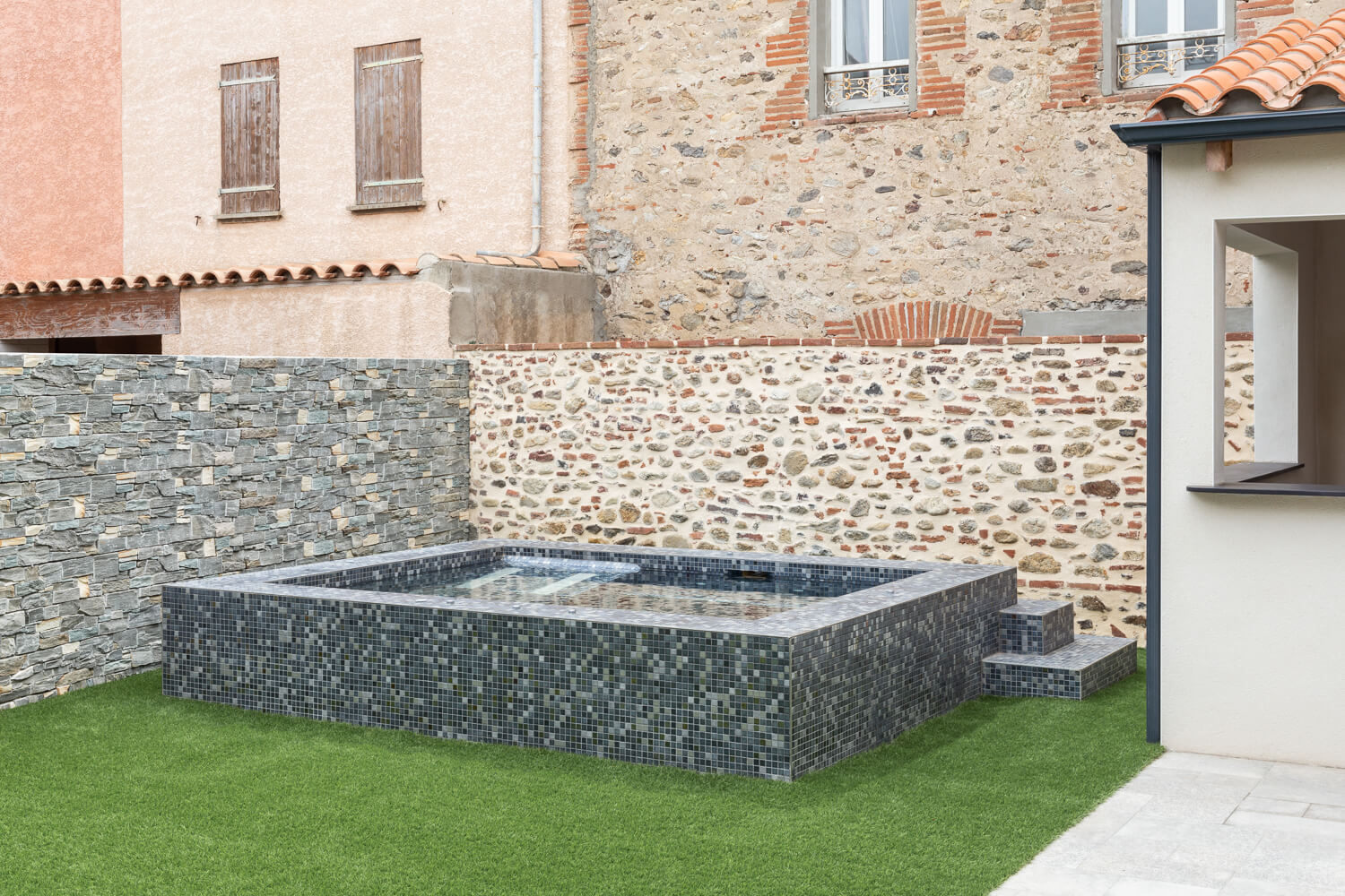 De Gin Fizz uit de Cocktail collectie van Ezarri is een mooie mix van lichtgrijs metallic donkerblauwe stukken Glasmozaïek welke perfect combineert perfect met elk ander materiaal.