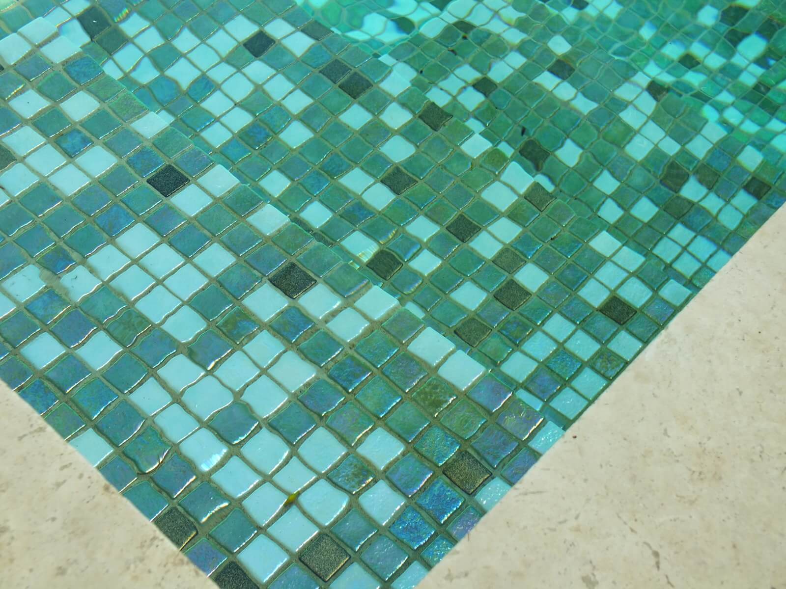 Tussen de stukjes glas in, zitten kunststof puntjes. Dit zijn de verbindingen om het glas als een mozaïek bij elkaar te houden. Het grote voordeel hiervan ten opzichte van regulier glasmozaïek welke verwerkt zijn om matjes is dat De Cocktail | Grasshopper eenvoudig op maat te maken is in de verwerking.