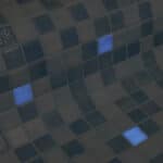 Tussen de stukjes glas in, zitten kunststof puntjes. Dit zijn de verbindingen om het glas als een mozaïek bij elkaar te houden. Het grote voordeel hiervan ten opzichte van regulier glasmozaïek welke verwerkt zijn om matjes is dat de Fosfo | Aquila eenvoudig op maat te maken is in de verwerking.