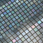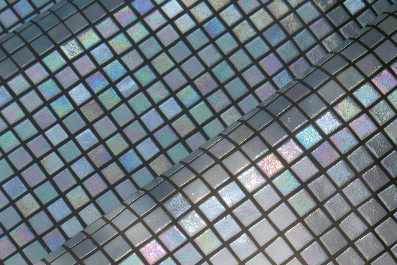Tussen de stukjes glas in, zitten kunststof puntjes. Dit zijn de verbindingen om het glas als een mozaïek bij elkaar te houden. Het grote voordeel hiervan ten opzichte van regulier glasmozaïek welke verwerkt zijn om matjes is dat de Iris | Cuarzo eenvoudig op maat te maken is in de verwerking.