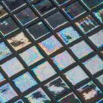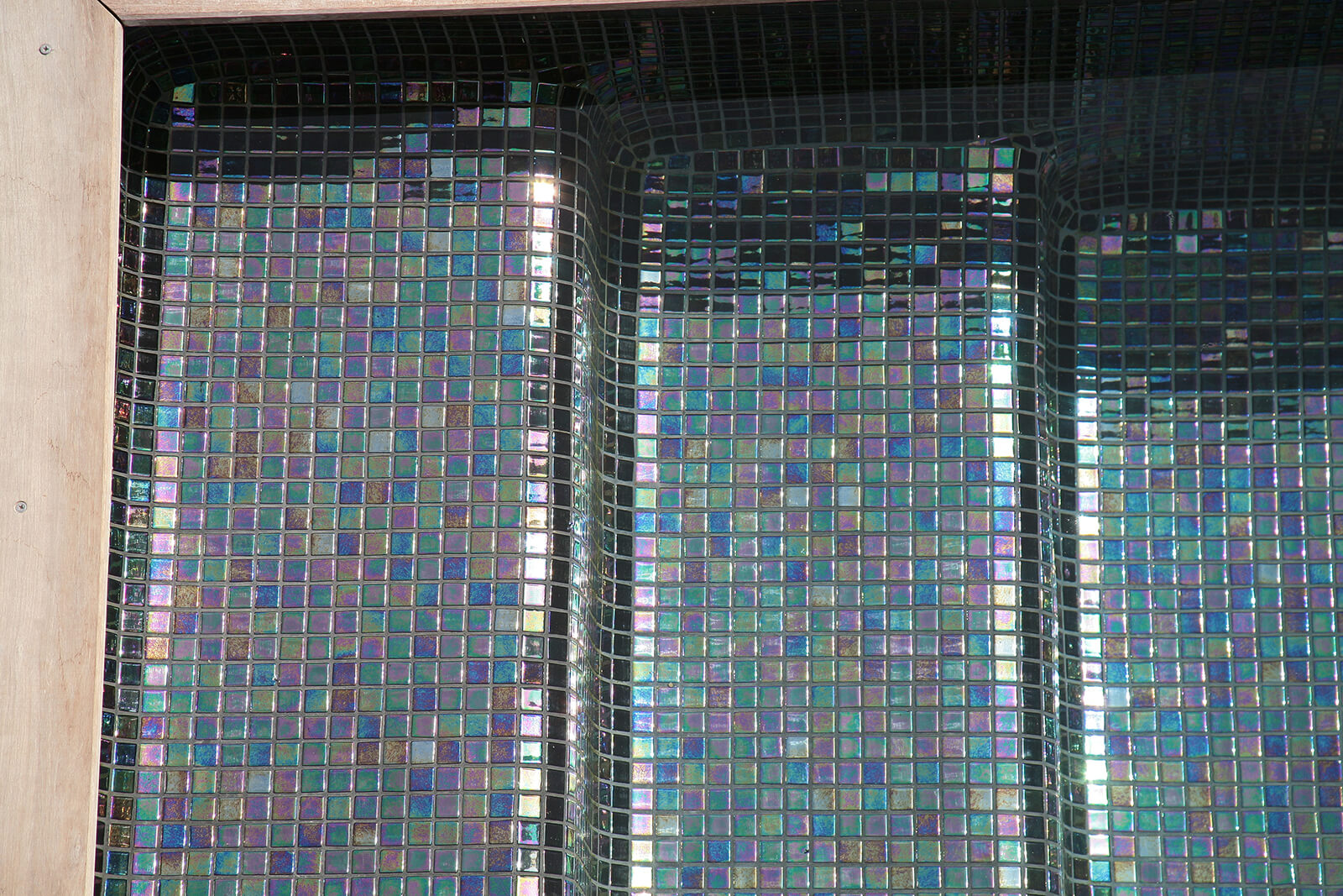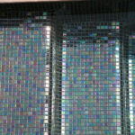 Tussen de stukjes glas in, zitten kunststof puntjes. Dit zijn de verbindingen om het glas als een mozaïek bij elkaar te houden. Het grote voordeel hiervan ten opzichte van regulier glasmozaïek welke verwerkt zijn om matjes is dat de Iris | Ebano eenvoudig op maat te maken is in de verwerking.