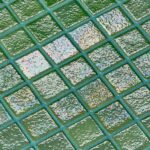 Tussen de stukjes glas in, zitten kunststof puntjes. Dit zijn de verbindingen om het glas als een mozaïek bij elkaar te houden. Het grote voordeel hiervan ten opzichte van regulier glasmozaïek welke verwerkt zijn om matjes is dat de Iris | Green Pearl eenvoudig op maat te maken is in de verwerking.