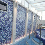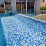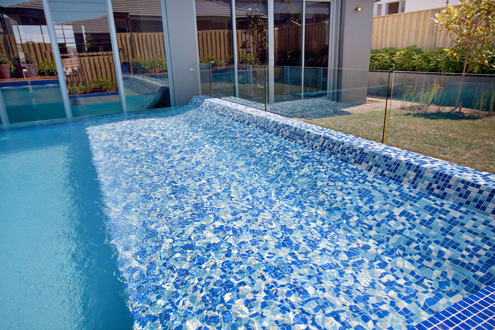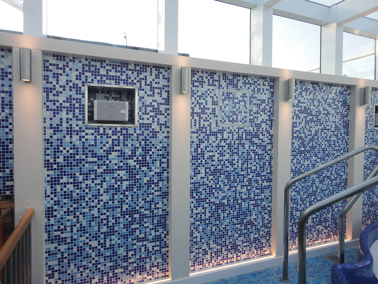 De Oasis uit de Iris collectie van Ezarri met zijn donkerblauw, blauw en witte stukken Glasmozaïek welke perfect combineert met elk ander materiaal.
