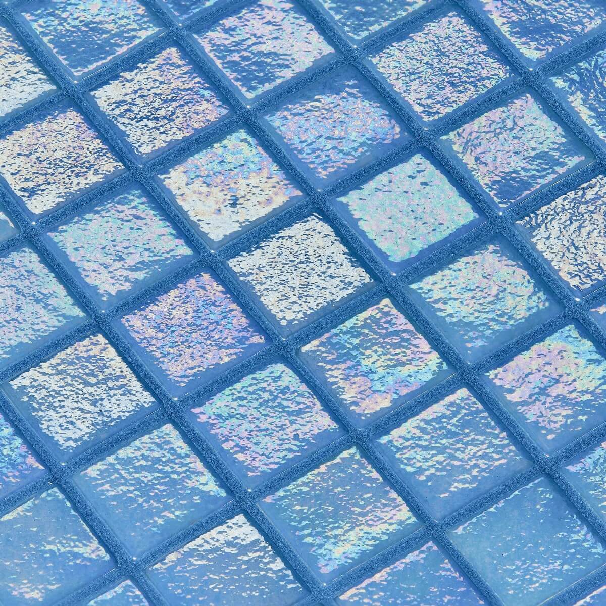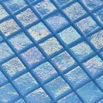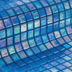 Tussen de stukjes glas in, zitten kunststof puntjes. Dit zijn de verbindingen om het glas als een mozaïek bij elkaar te houden. Het grote voordeel hiervan ten opzichte van regulier glasmozaïek welke verwerkt zijn om matjes is dat de Iris | Ocean eenvoudig op maat te maken is in de verwerking.