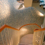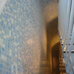 Tussen de stukjes glas in, zitten kunststof puntjes. Dit zijn de verbindingen om het glas als een mozaïek bij elkaar te houden. Het grote voordeel hiervan ten opzichte van regulier glasmozaïek welke verwerkt zijn om matjes is dat de Iris | Sky eenvoudig op maat te maken is in de verwerking.