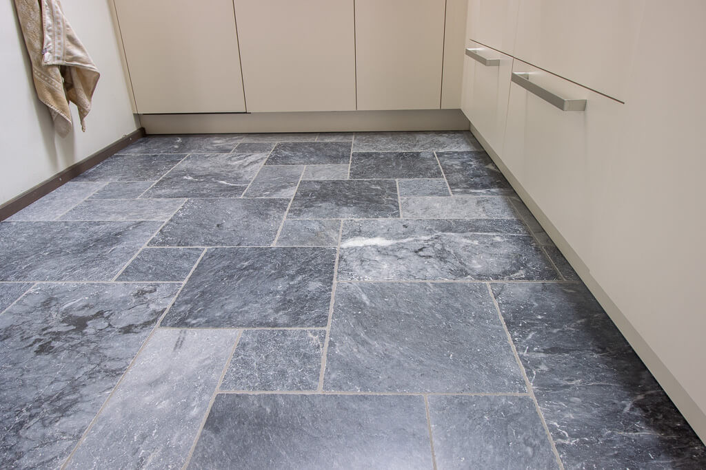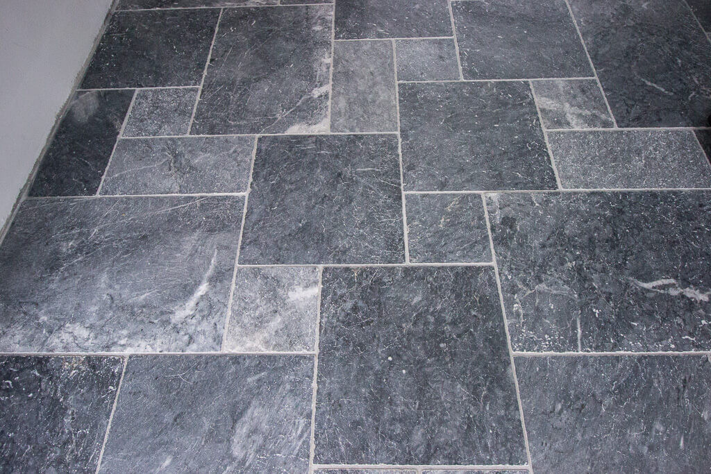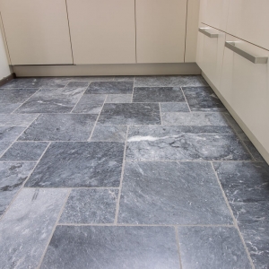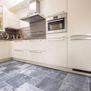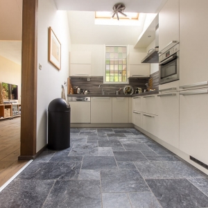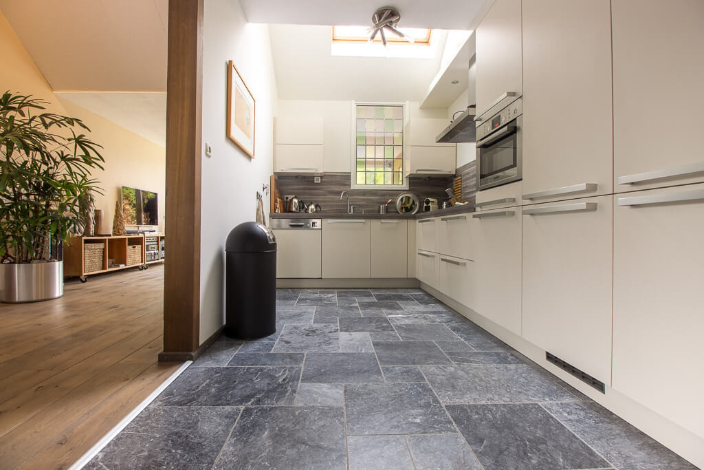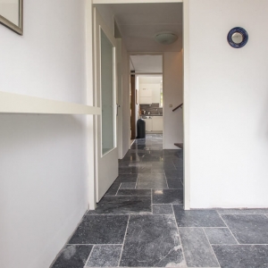 De familie Brouwer wilde in een deel van hun nieuwe huis graag de houten vloer vervangen voor een natuurstenen vloer. Na een bezoekje aan onze showroom, waar we met de familie langs allerlei verschillende tegels zijn gelopen, is de keuze gevallen op de Antique Blue Light “Soft Finish”.