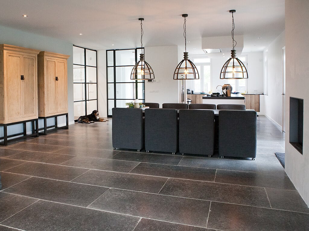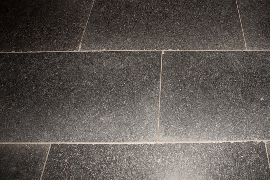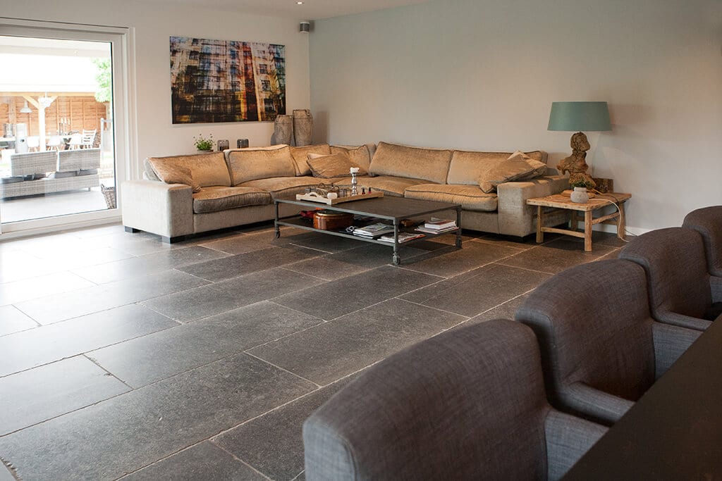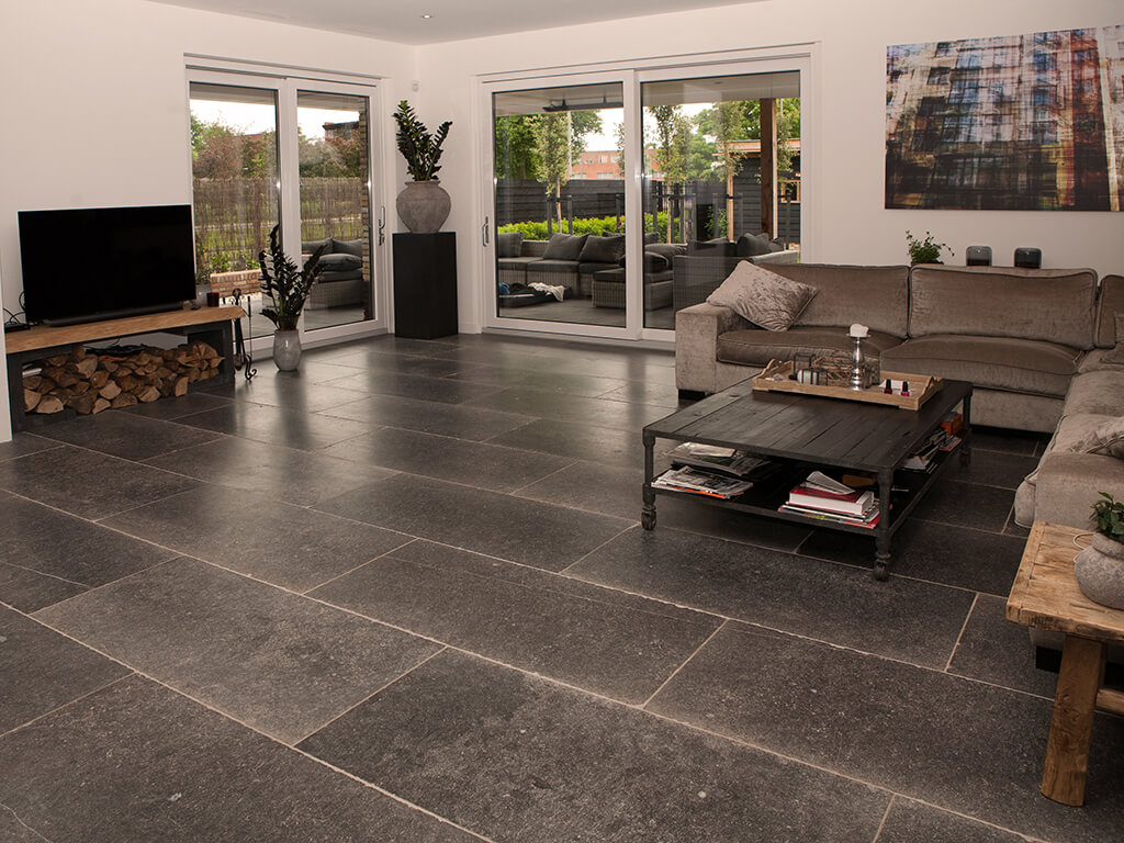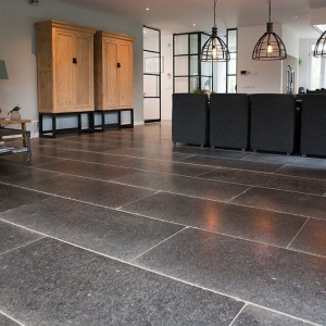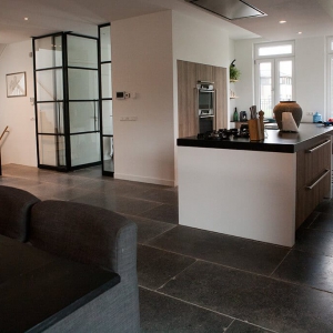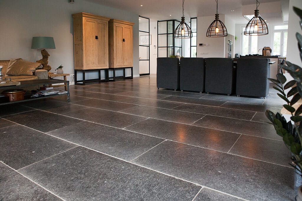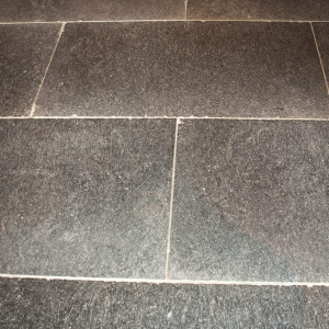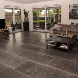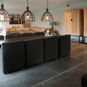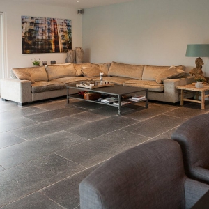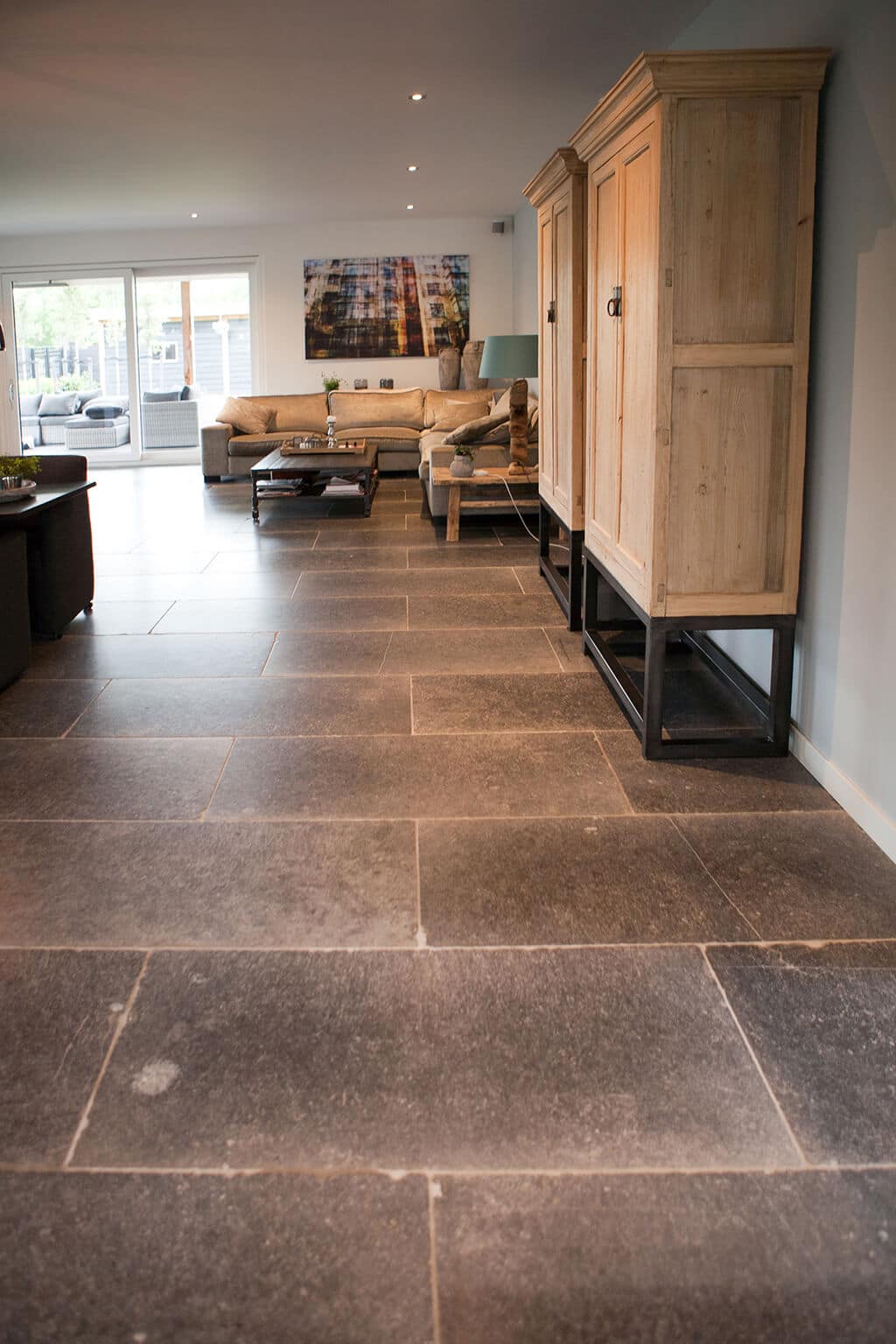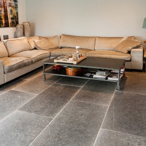Bij binnenkomst viel het oog direct op de Belgisch Hardsteen “Manueel Verouderd, Lichte Schuring”. Een prachtig afgewerkte Belgische Hardsteen met een blauw grijze kleur.