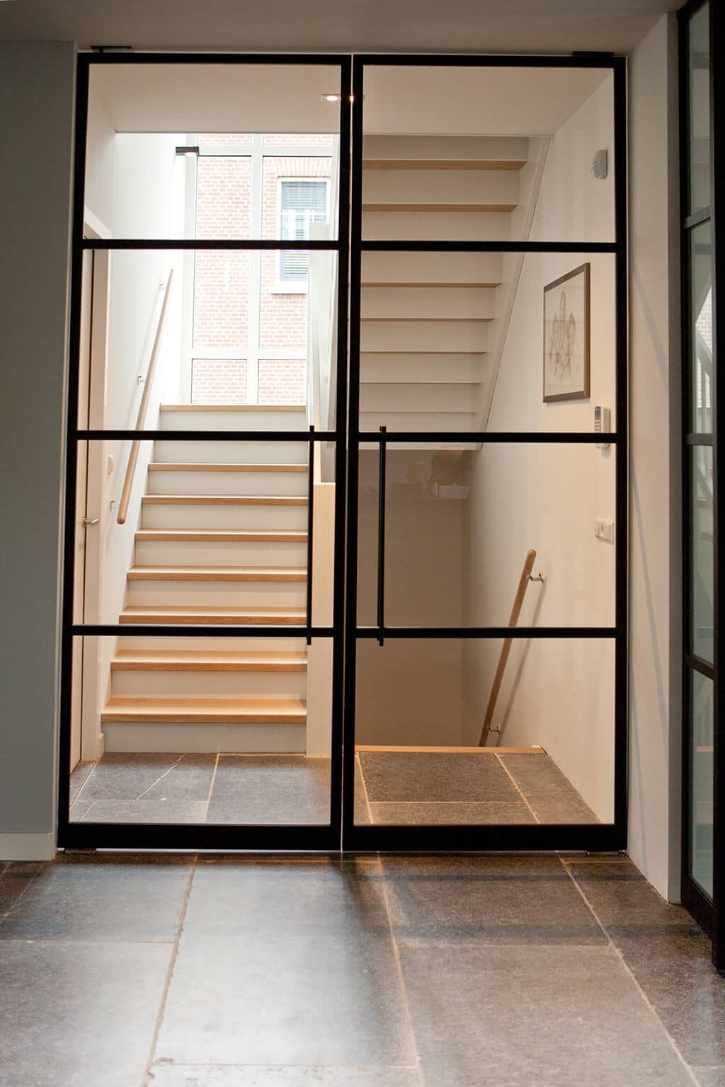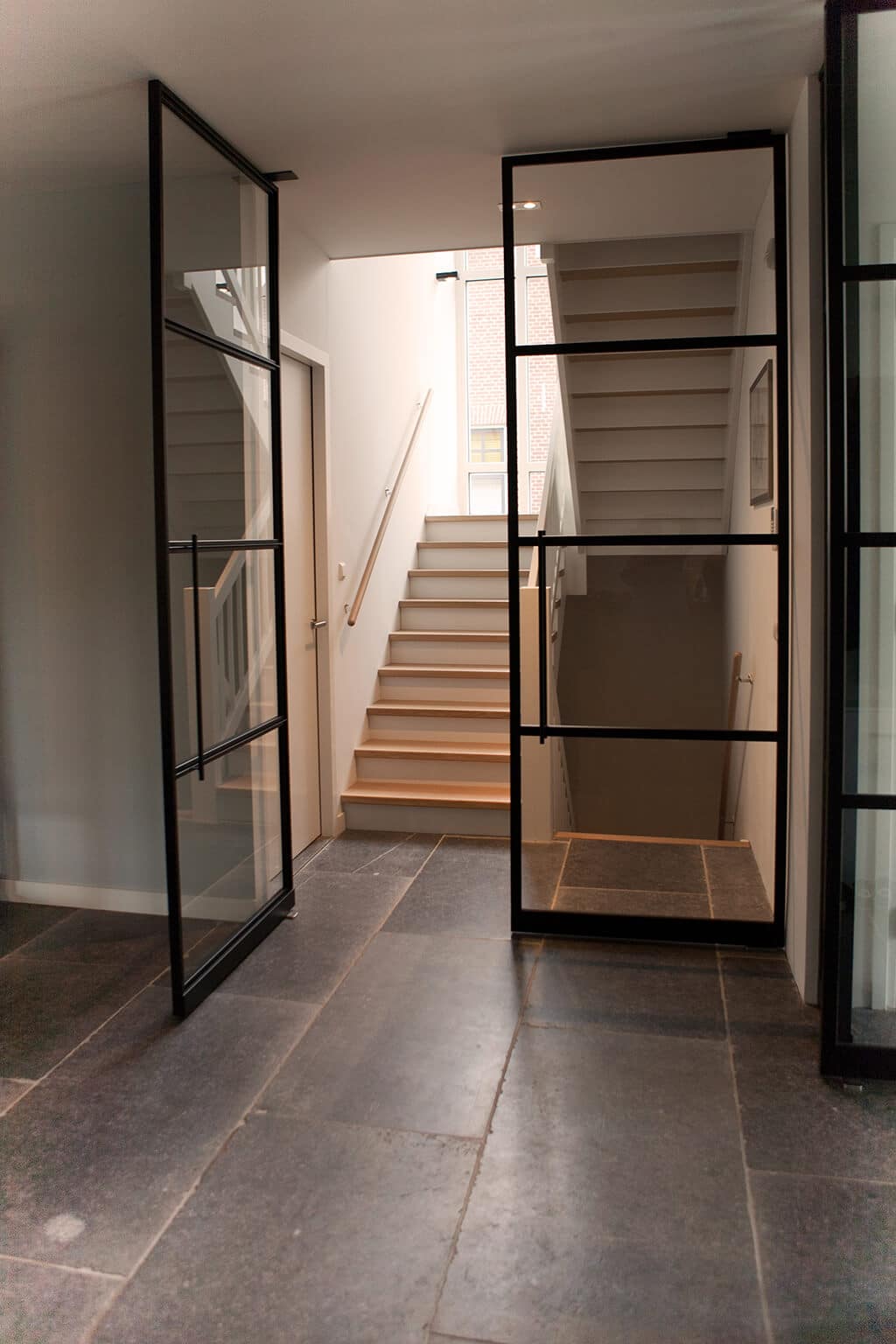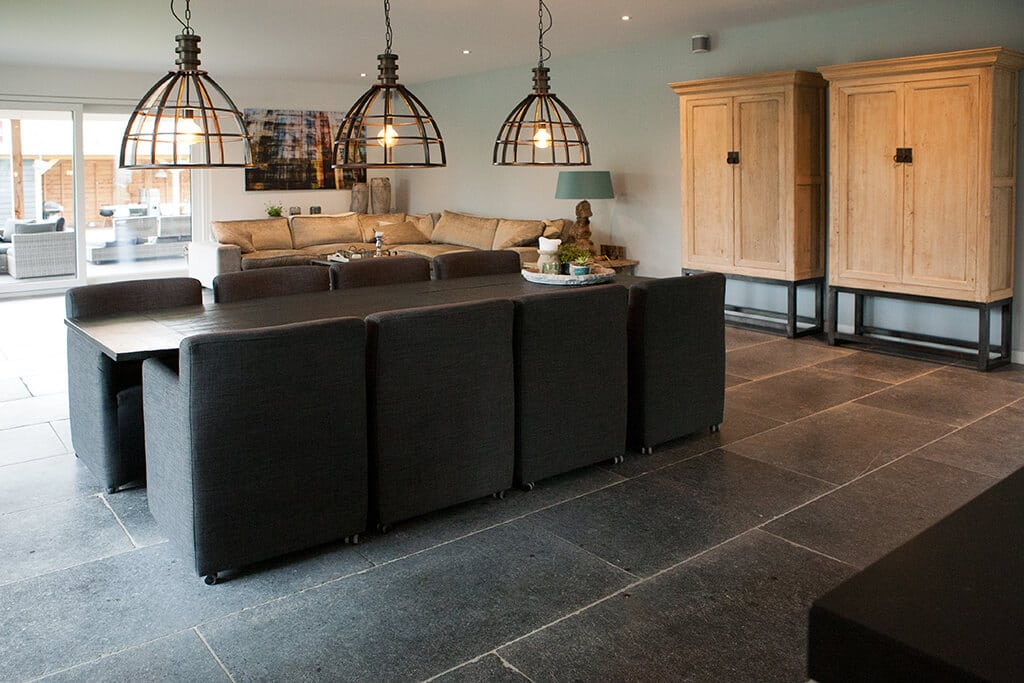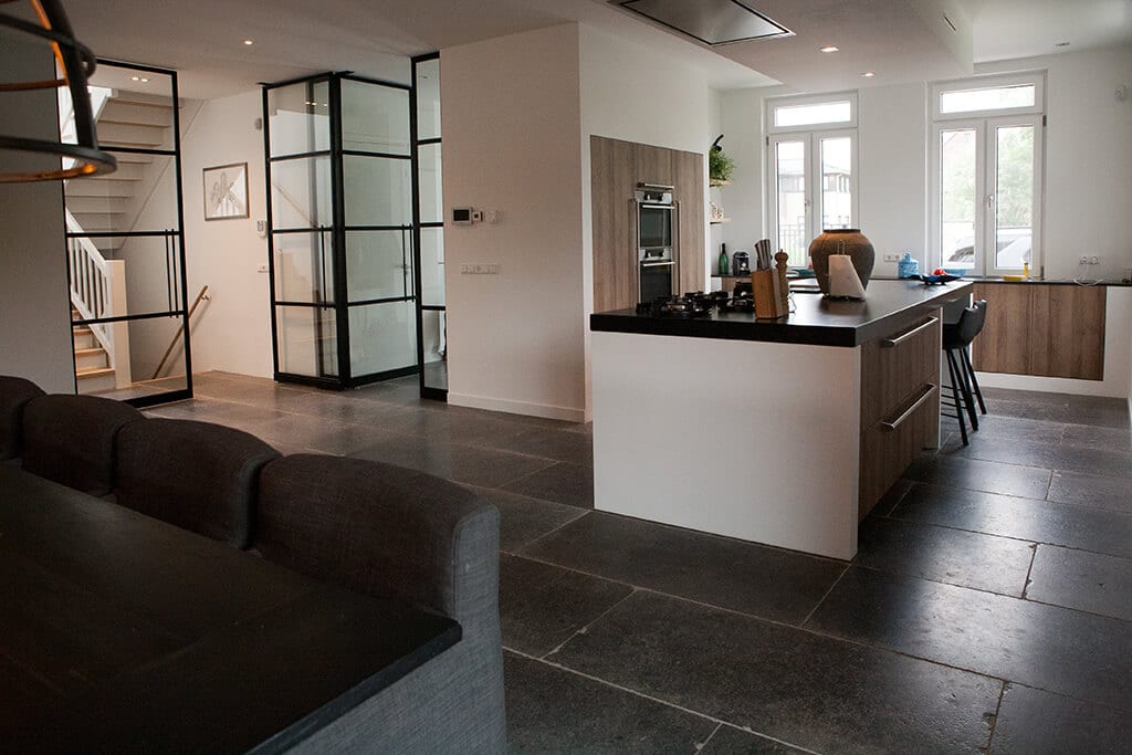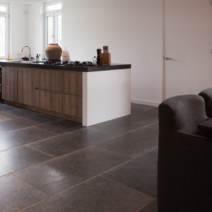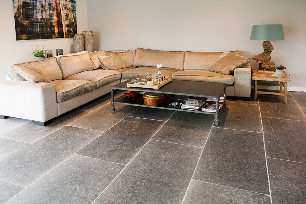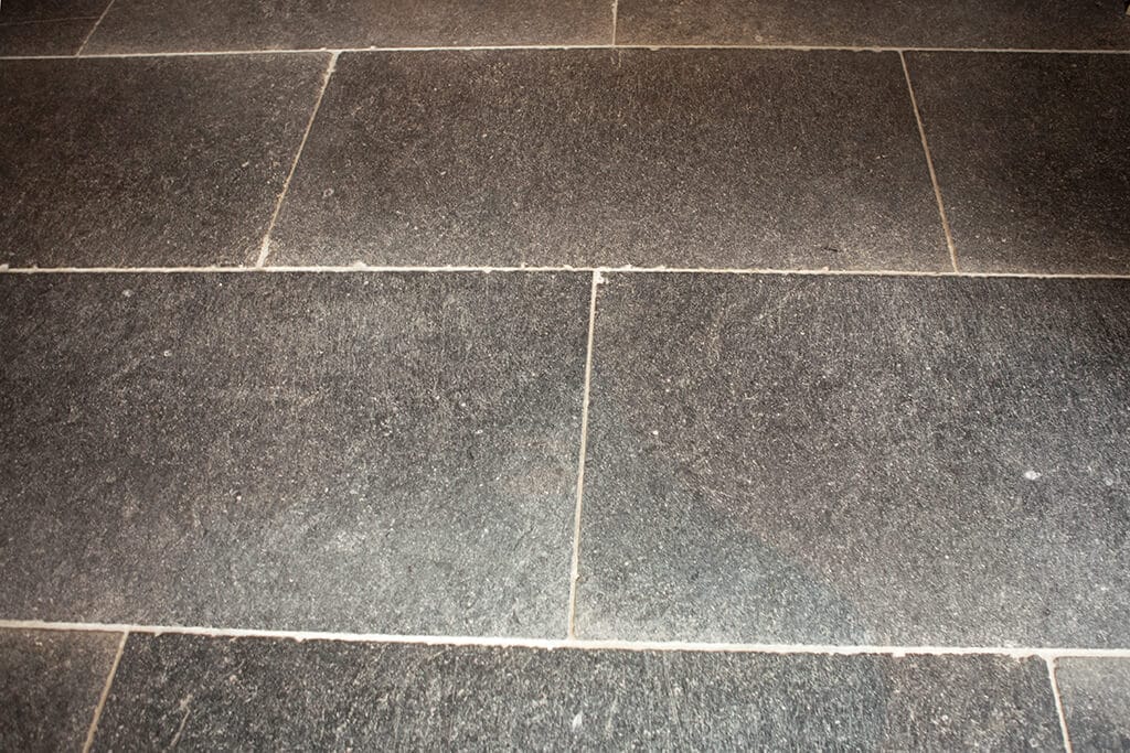 Bij binnenkomst viel het oog direct op de Belgisch Hardsteen “Manueel Verouderd, Lichte Schuring”. Een prachtig afgewerkte Belgische Hardsteen met een blauw grijze kleur.