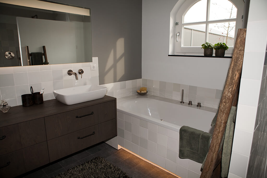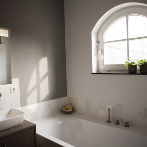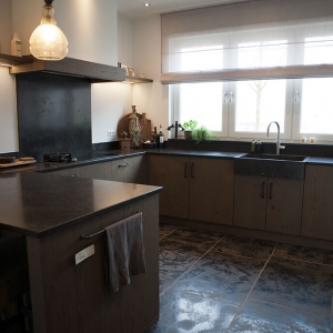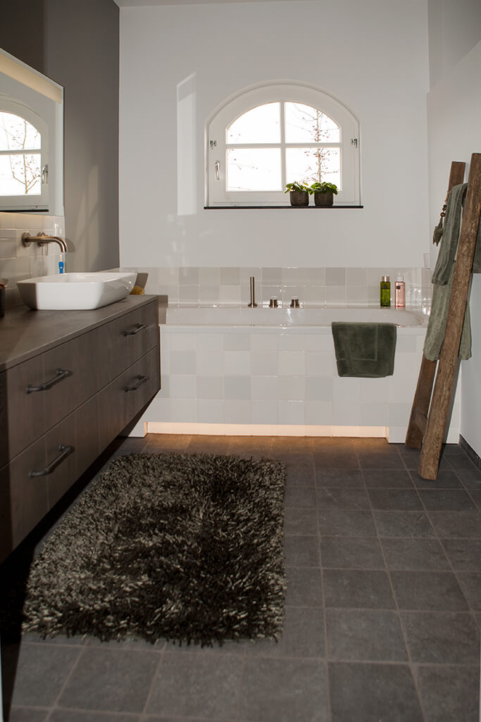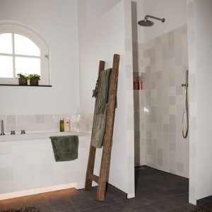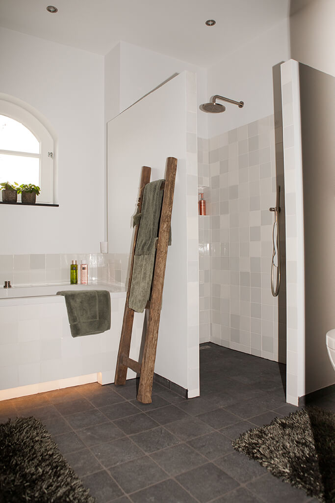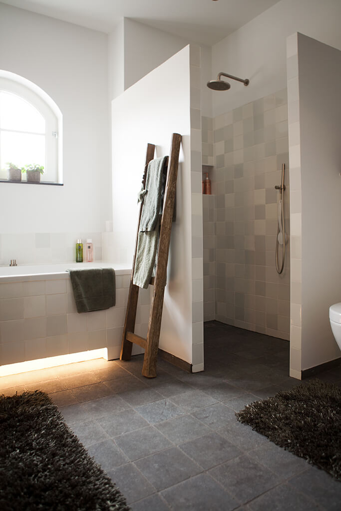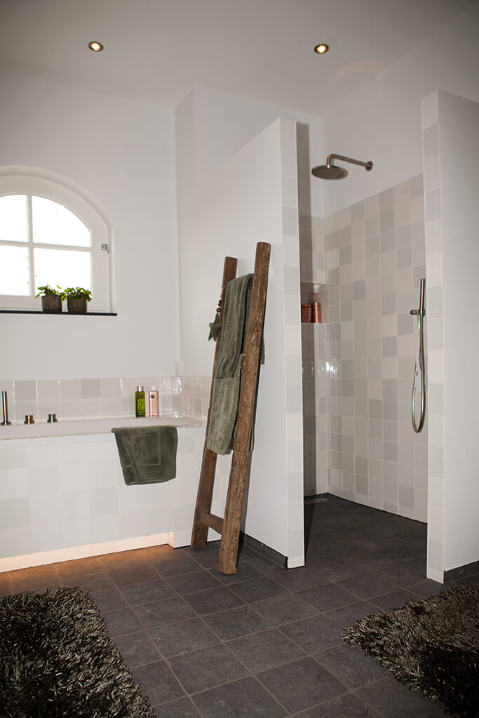 Voor de natte ruimtes hebben we gekozen voor ambachtelijke Friese witjes in een lichte kleurenmix. Deze zijn plaatselijk / functioneel toegepast op de plaatsen waar veelvuldig water wordt gebruikt. Op de vloer hebben we hier gekozen voor een Belgisch hardsteen look keramiek in de maat 20x20cm. Deze tegeltjes zijn getrommeld waardoor ze perfect aansluiten bij de rest van de materialen.