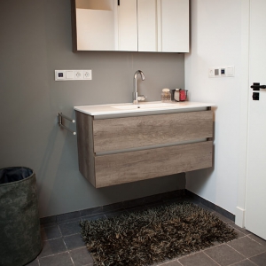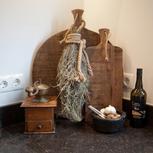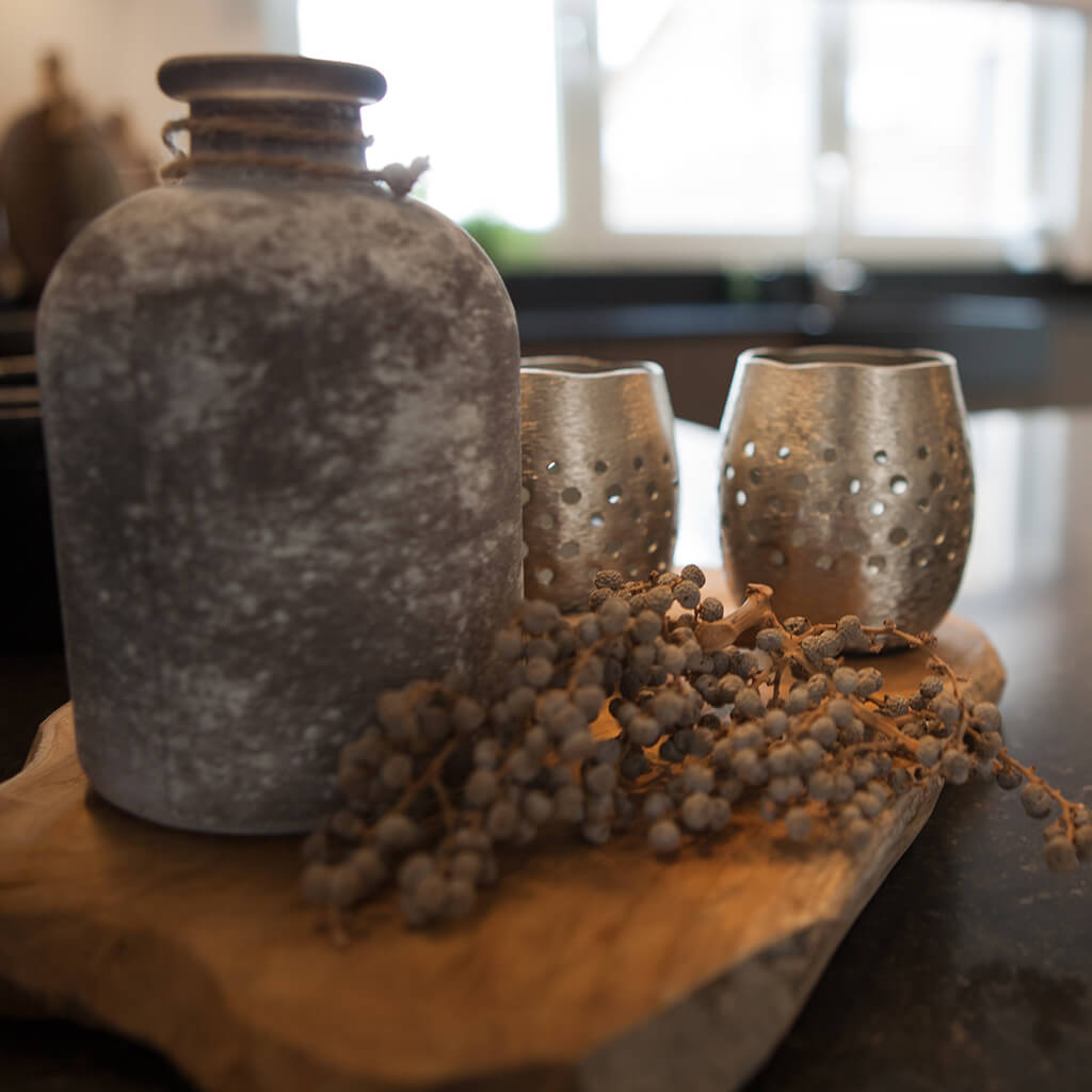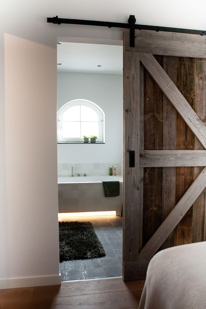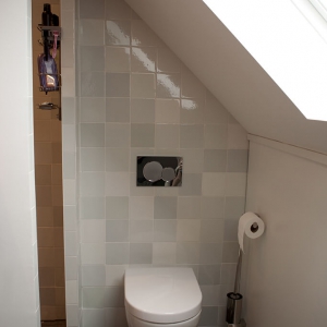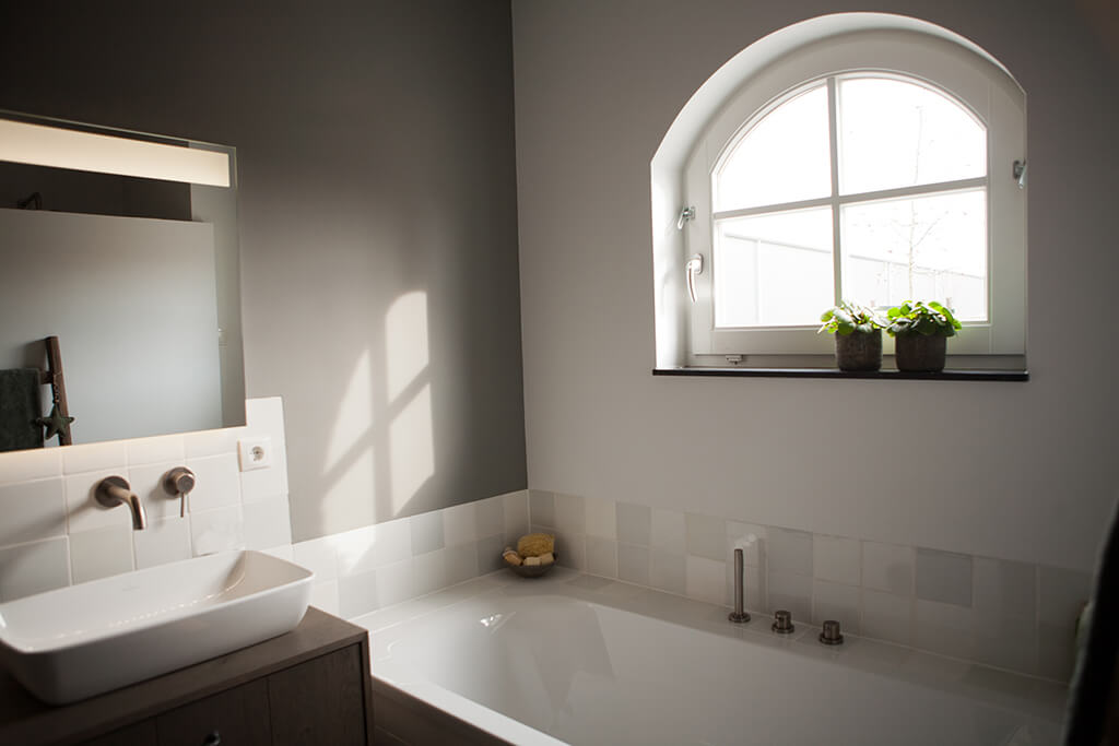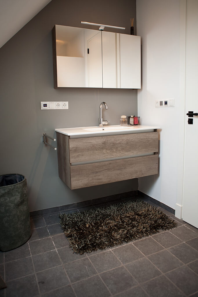 Voor de natte ruimtes hebben we gekozen voor ambachtelijke Friese witjes in een lichte kleurenmix. Deze zijn plaatselijk / functioneel toegepast op de plaatsen waar veelvuldig water wordt gebruikt. Op de vloer hebben we hier gekozen voor een Belgisch hardsteen look keramiek in de maat 20x20cm. Deze tegeltjes zijn getrommeld waardoor ze perfect aansluiten bij de rest van de materialen.
