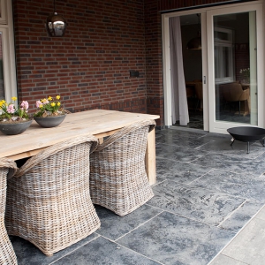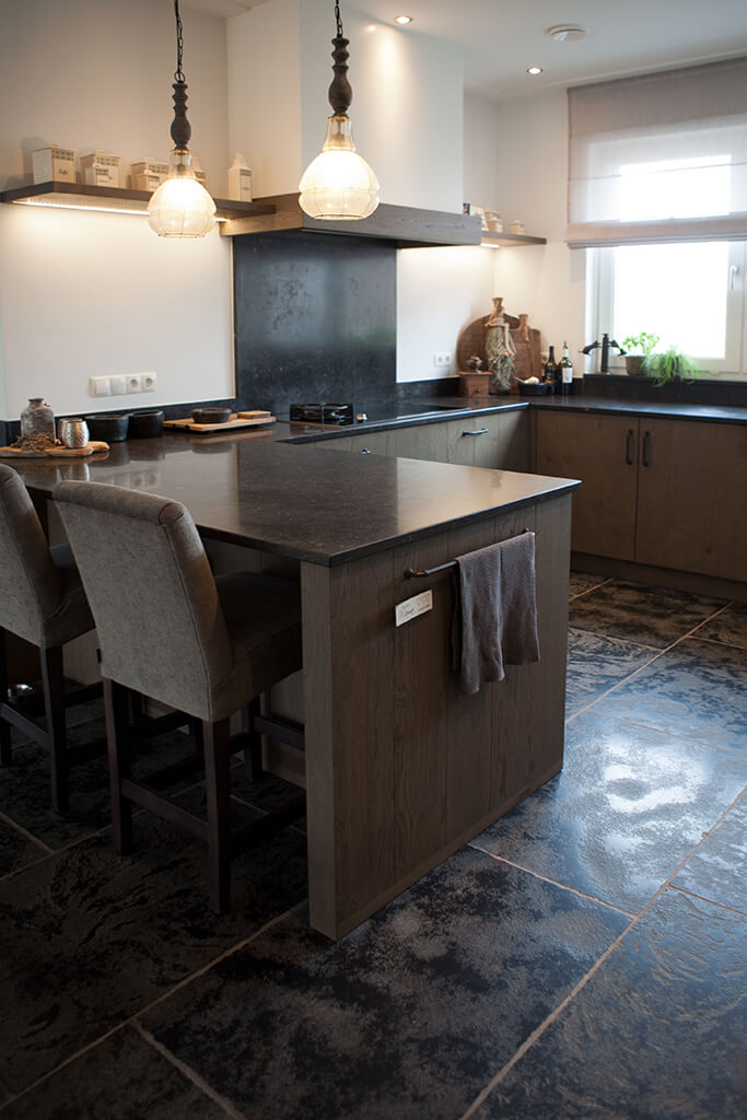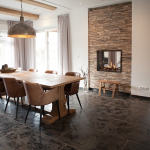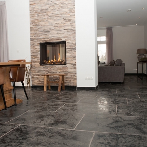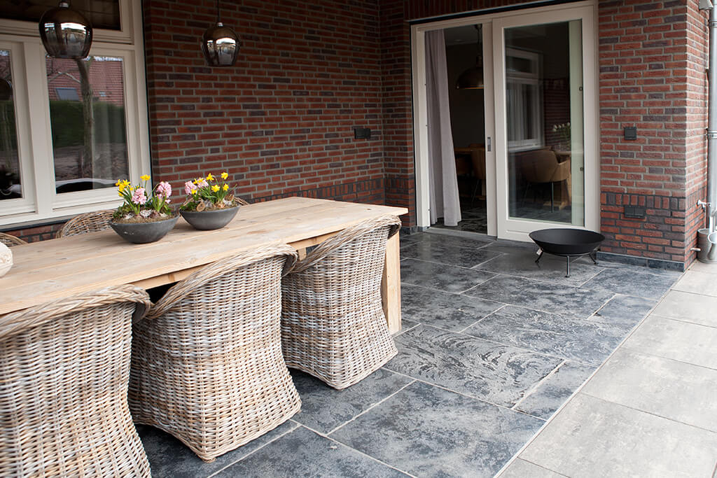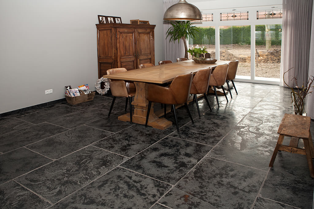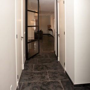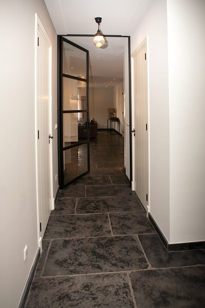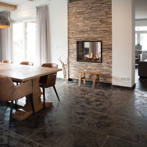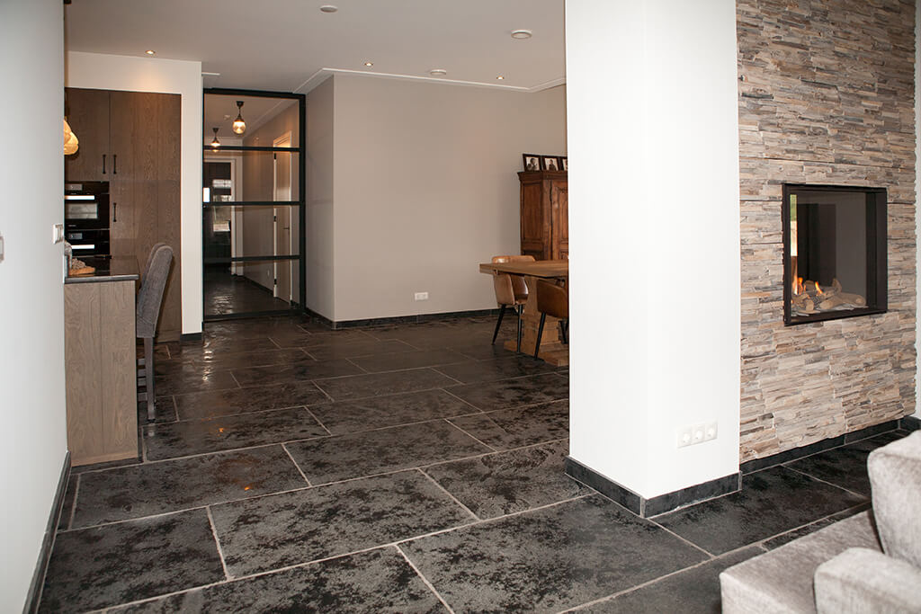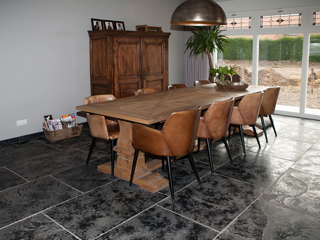 Voor wat betreft de vloer was het belangrijk dat het materiaal zowel binnen als buiten te gebruiken was. Daarnaast wilden deze mensen een harde vloer die gemakkelijk in het onderhoud is. Het perfecte materiaal werd gevonden in onze Bourgondische Dallen “Noires Bourgogne” in platen van 90x60x2 cm. Een prachtig handmatig verouderd materiaal dat keihard is en ook perfect te gebruiken op een terras.