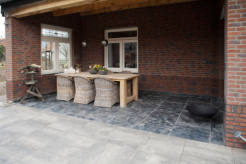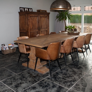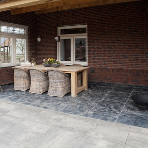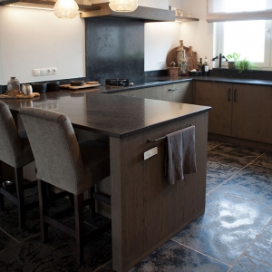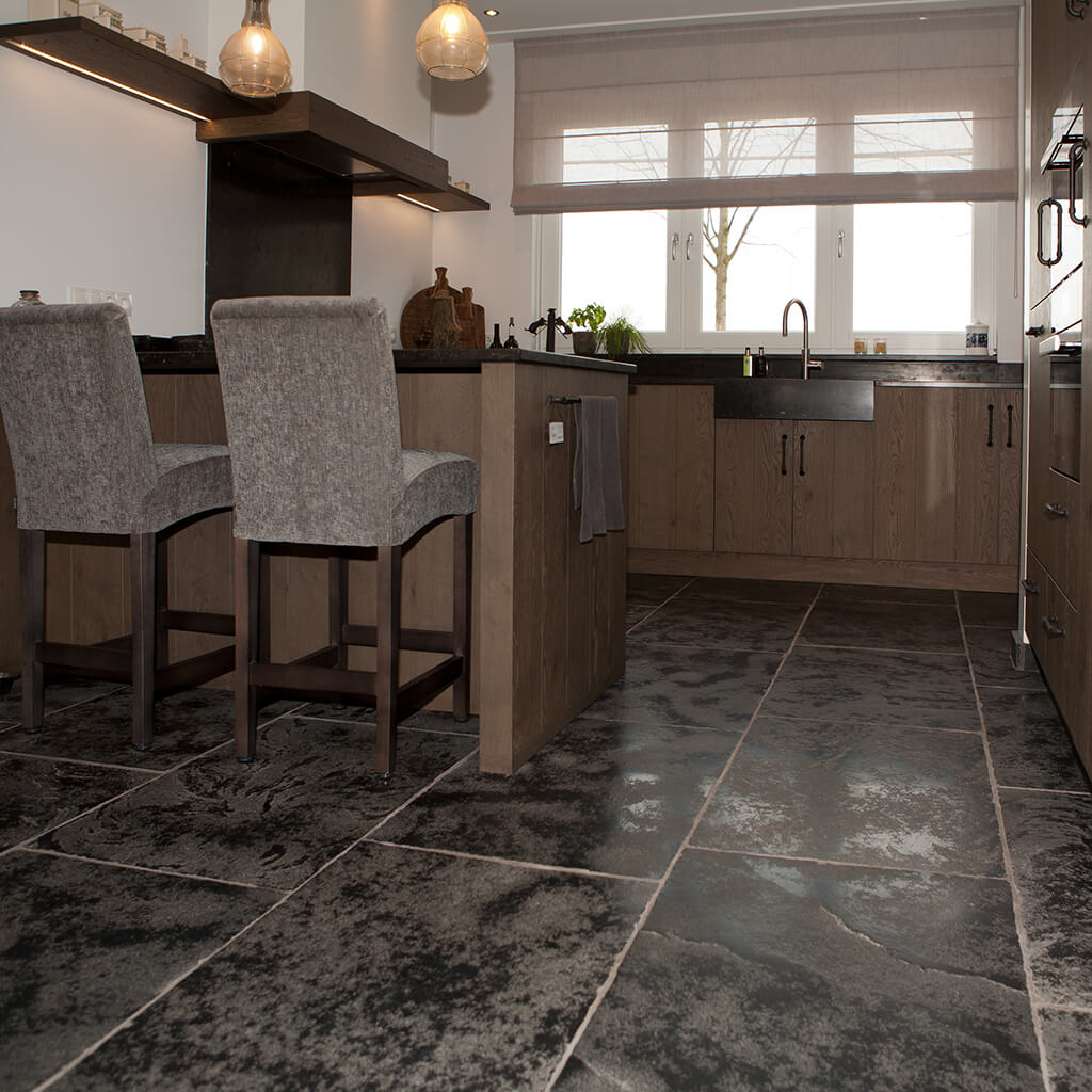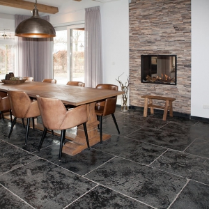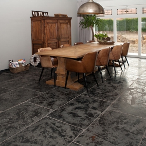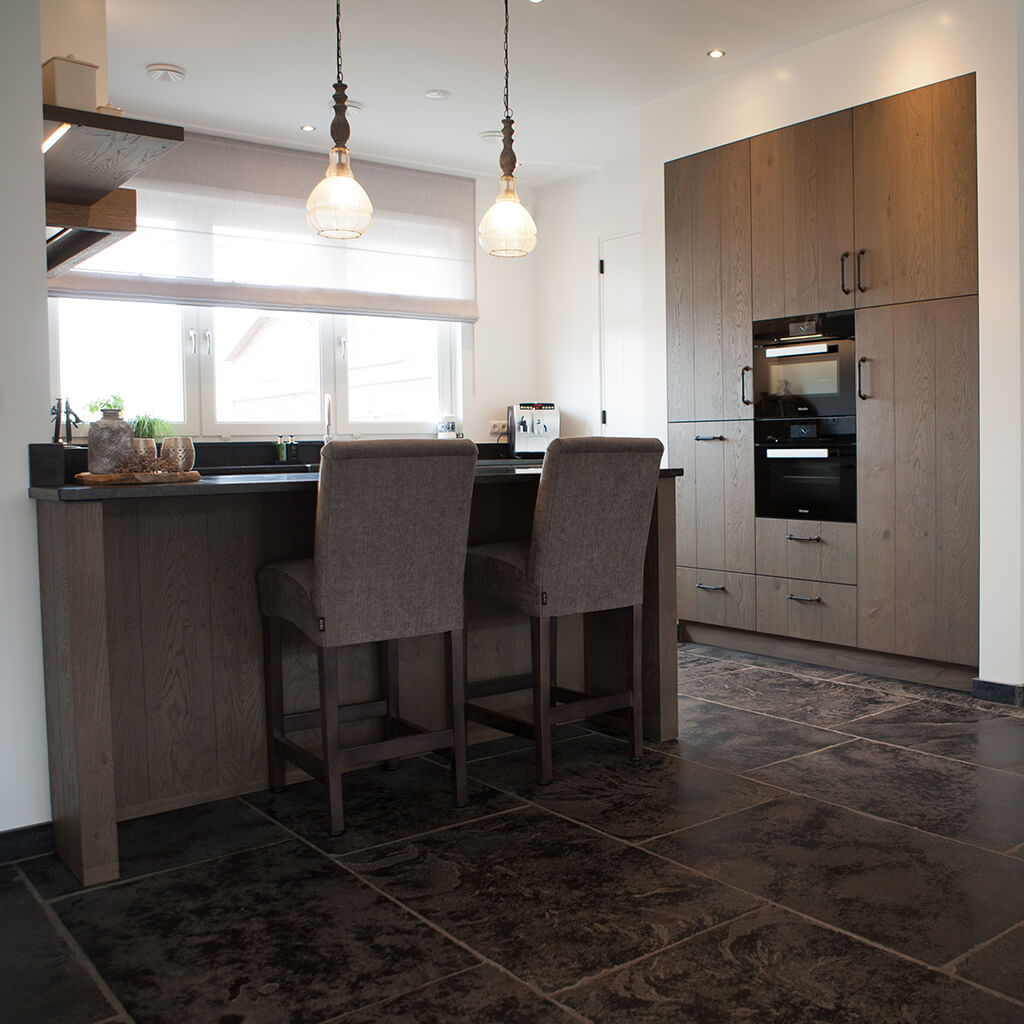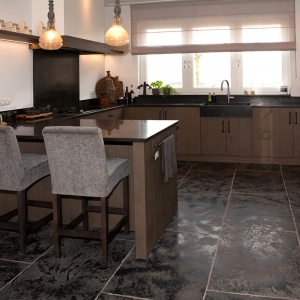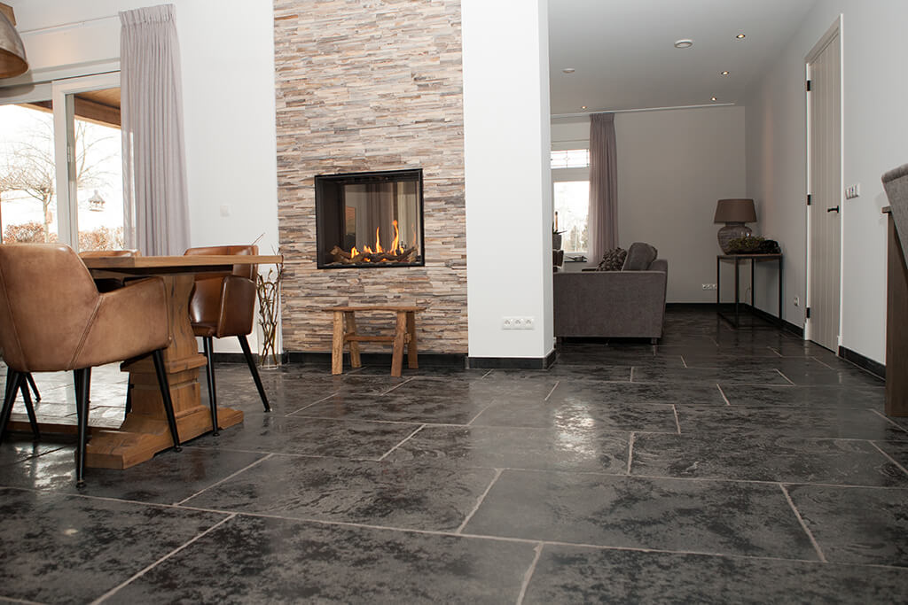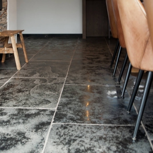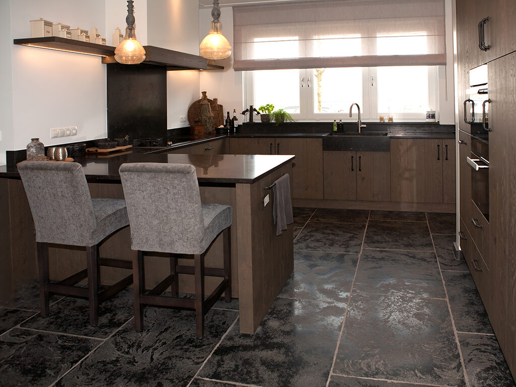 Voor wat betreft de vloer was het belangrijk dat het materiaal zowel binnen als buiten te gebruiken was. Daarnaast wilden deze mensen een harde vloer die gemakkelijk in het onderhoud is. Het perfecte materiaal werd gevonden in onze Bourgondische Dallen “Noires Bourgogne” in platen van 90x60x2 cm. Een prachtig handmatig verouderd materiaal dat keihard is en ook perfect te gebruiken op een terras.
