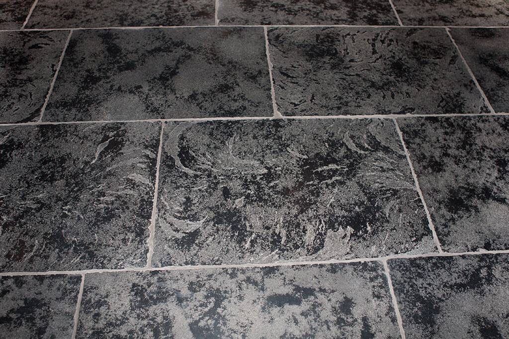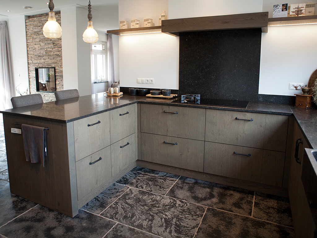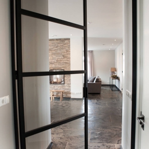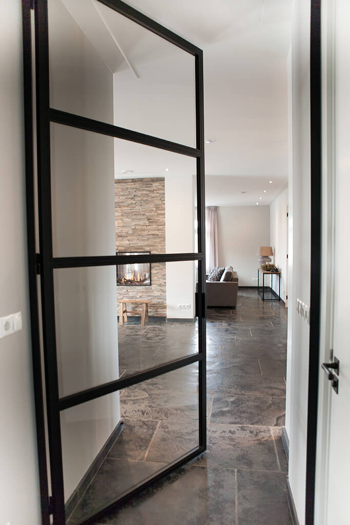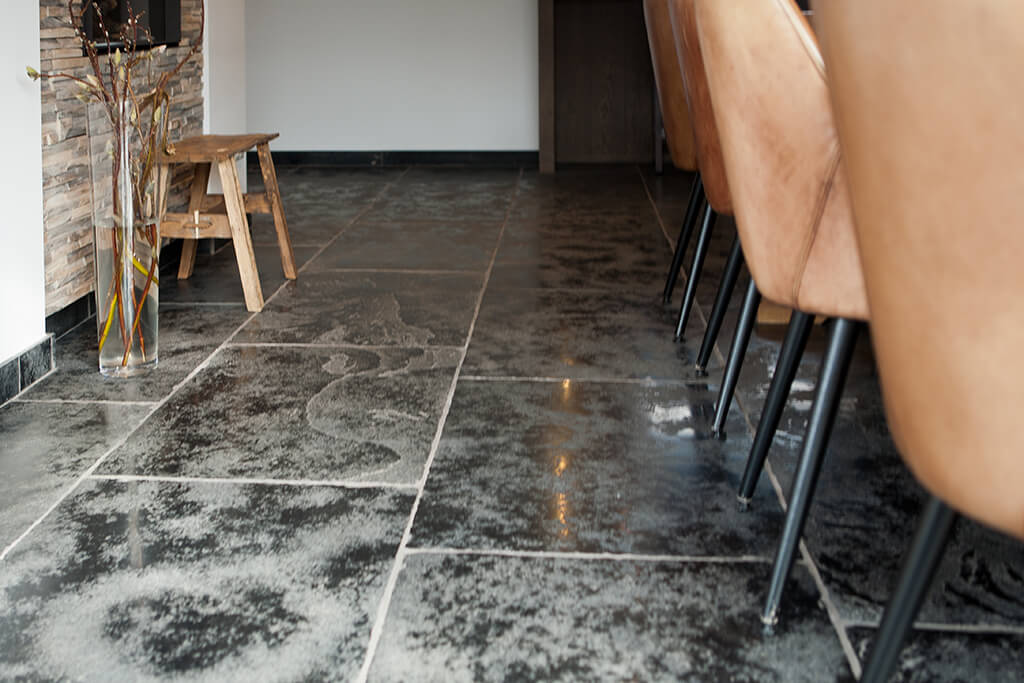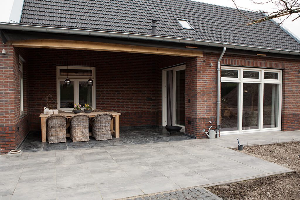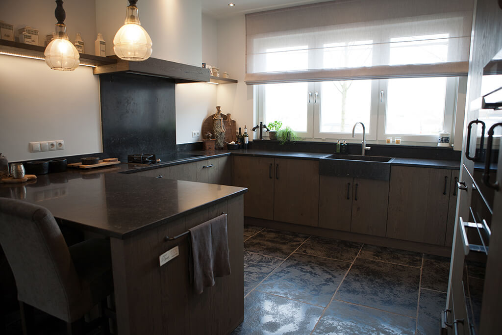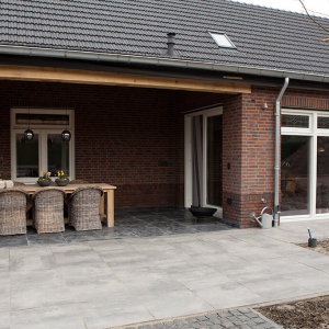 Voor wat betreft de vloer was het belangrijk dat het materiaal zowel binnen als buiten te gebruiken was. Daarnaast wilden deze mensen een harde vloer die gemakkelijk in het onderhoud is. Het perfecte materiaal werd gevonden in onze Bourgondische Dallen “Noires Bourgogne” in platen van 90x60x2 cm. Een prachtig handmatig verouderd materiaal dat keihard is en ook perfect te gebruiken op een terras.
