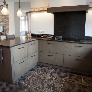 Deze familie was een tijdje op zoek naar de juiste materialen voor hun nieuwe landelijke woning. Het betrof hier een volledige benedenverdieping, diverse natte ruimtes en een terras.