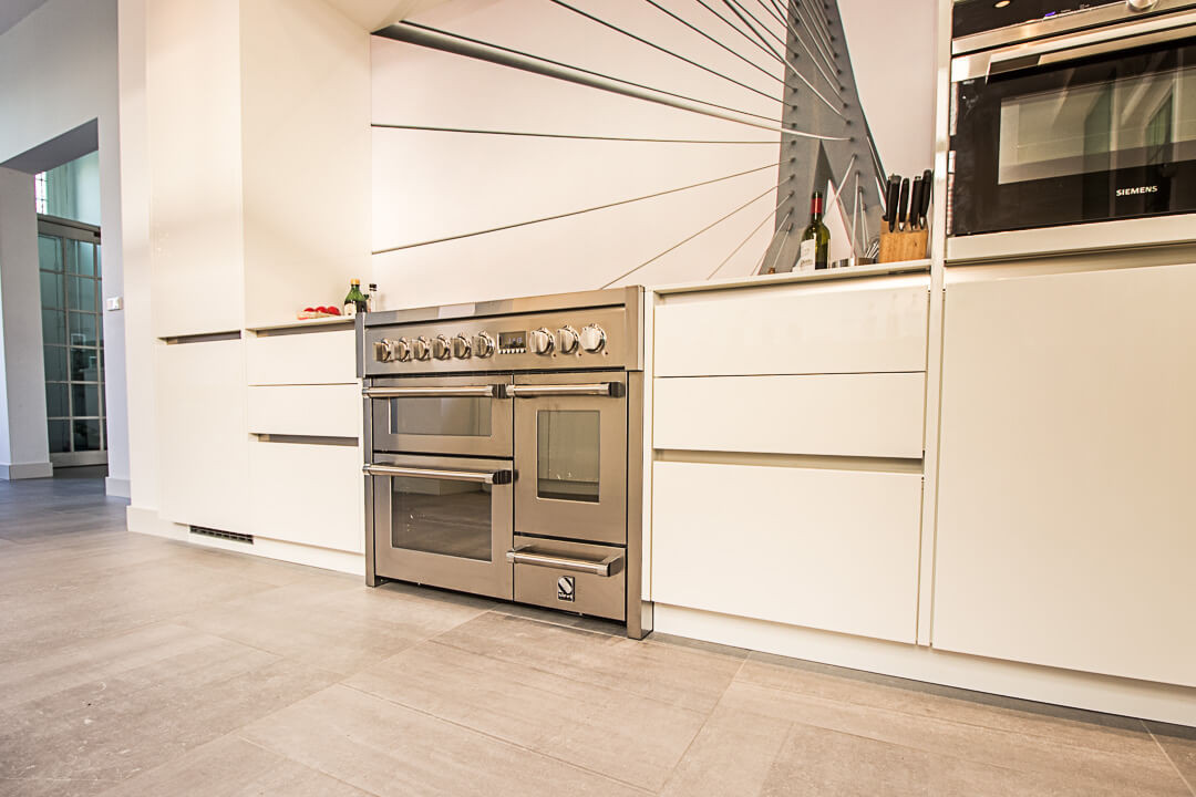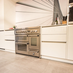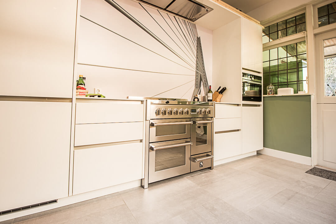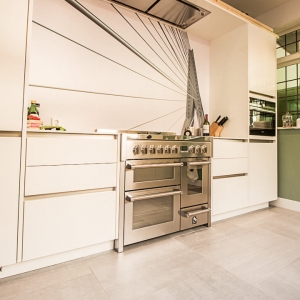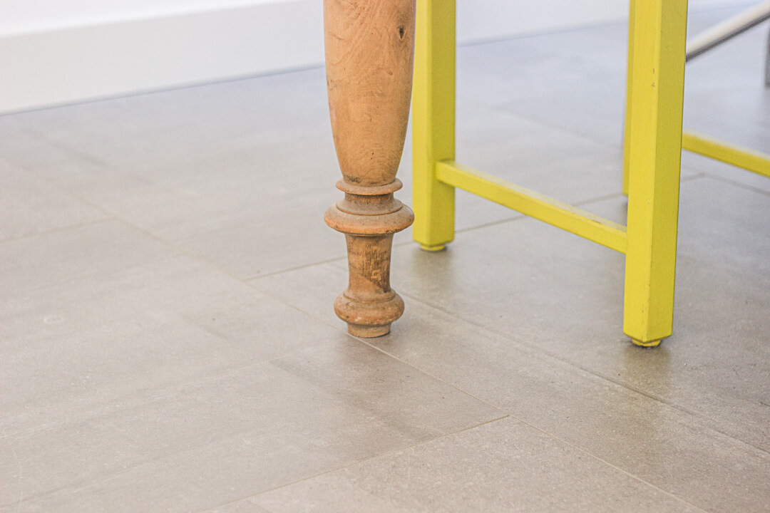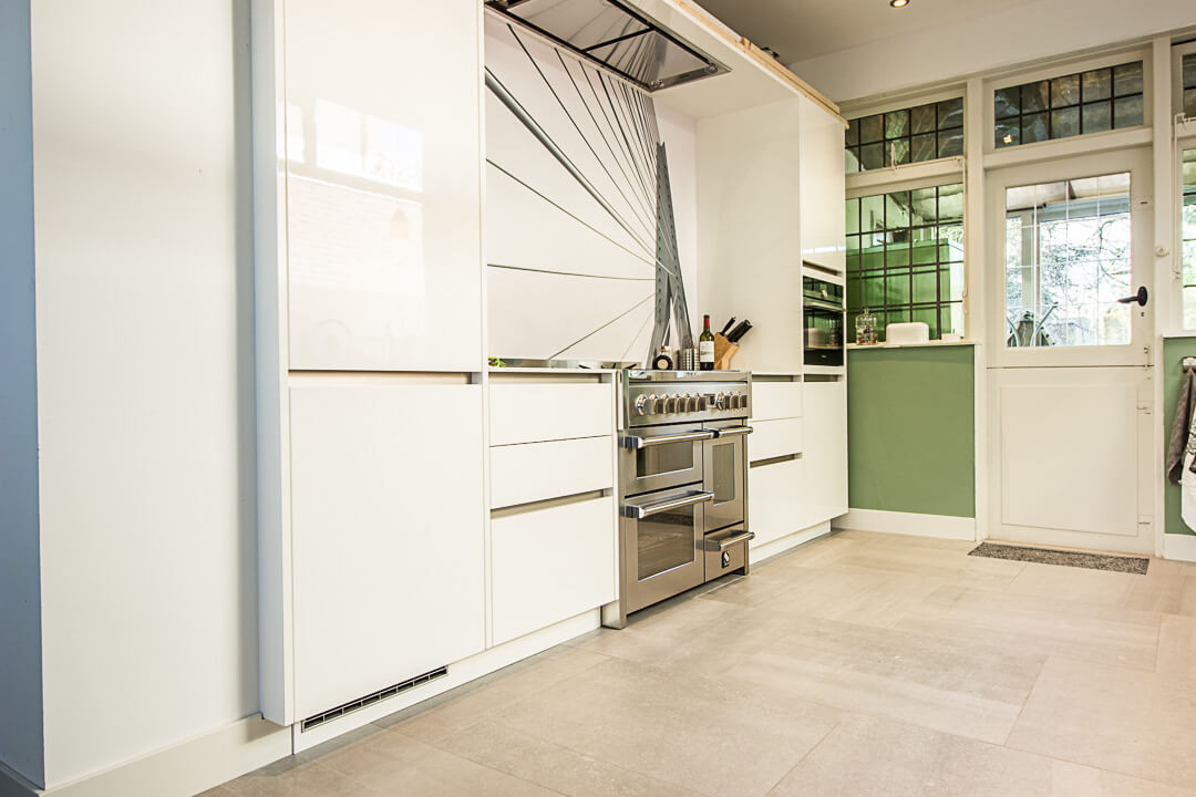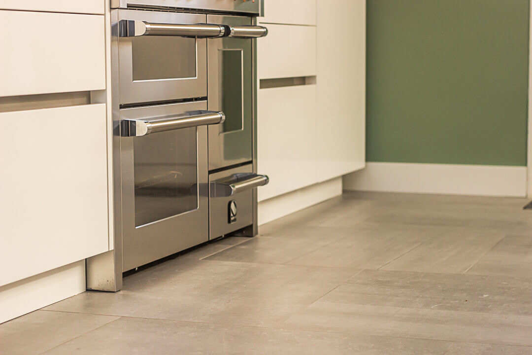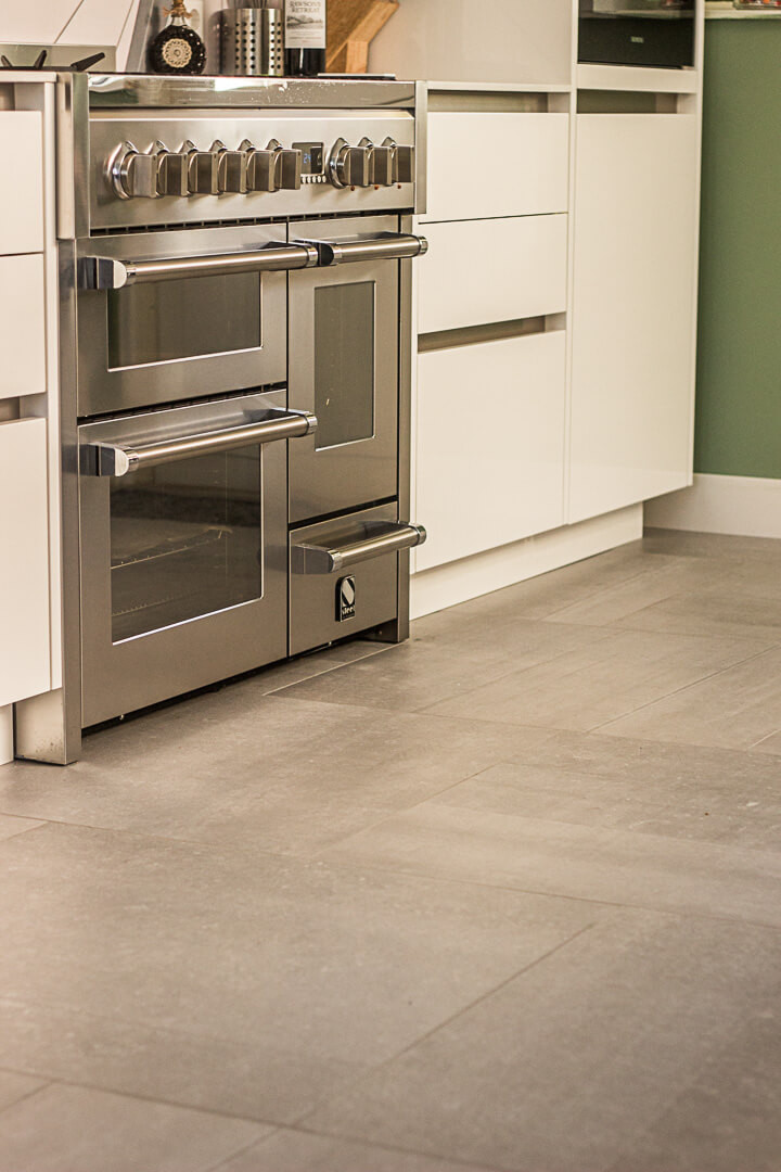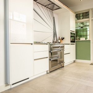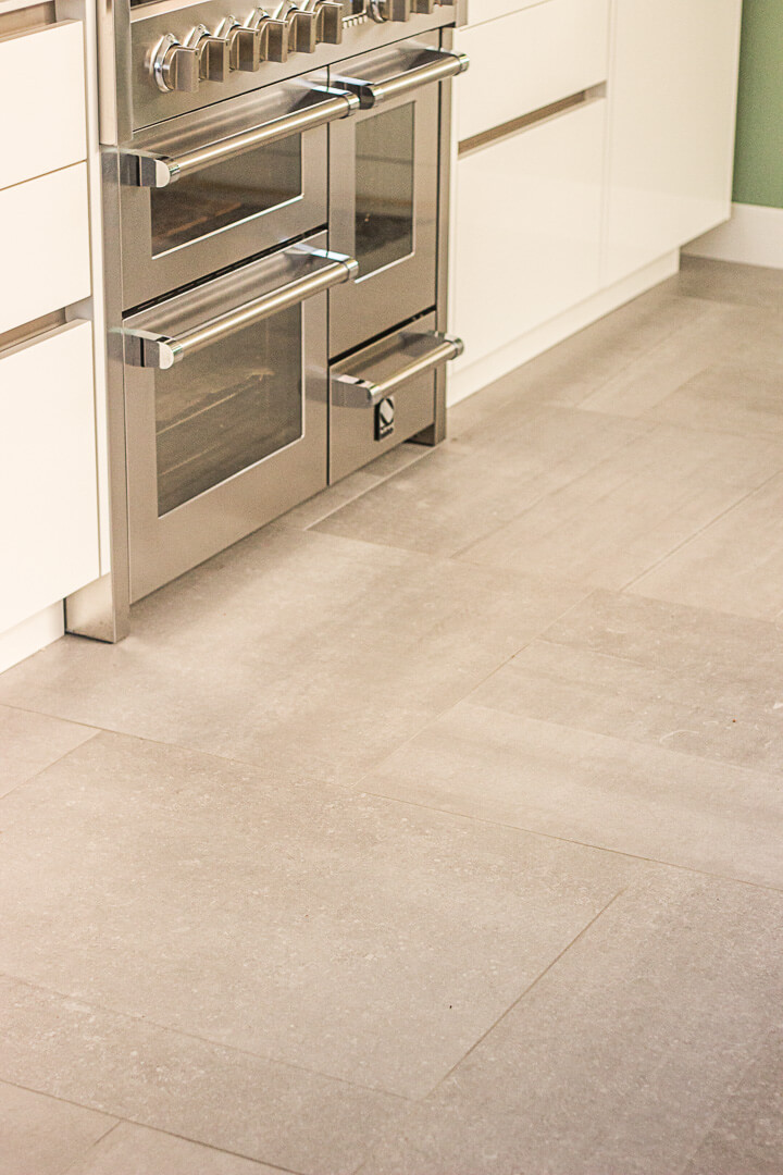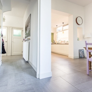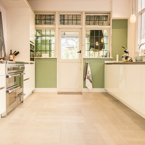 De familie Jue was op zoek naar een keramische tegel voor onder andere de keuken en eetkamer van hun woning. Na een bezoek aan onze showroom kozen ze voor de Belgisch Hardsteen Look Raamzaag Gezaagd Keramiek Grijs.