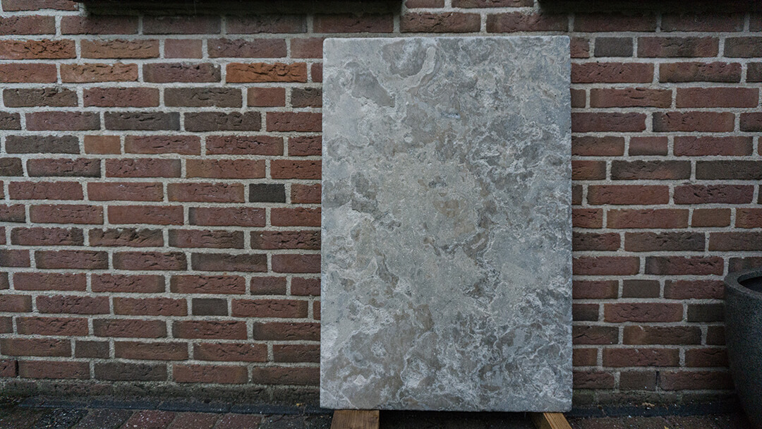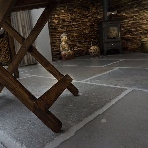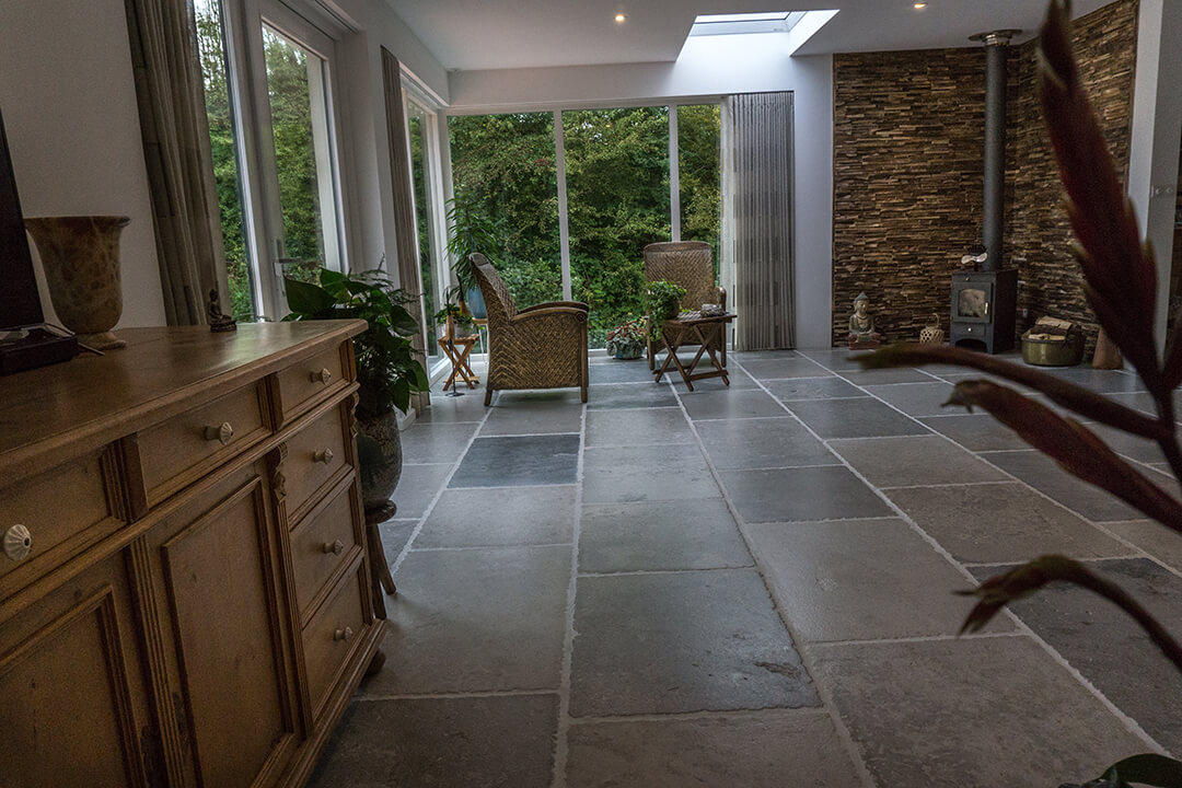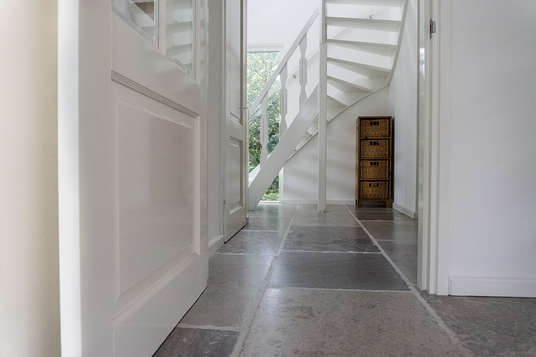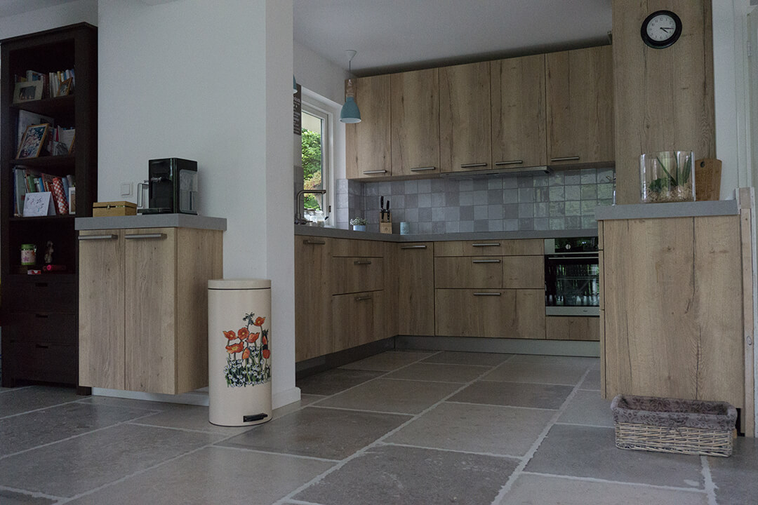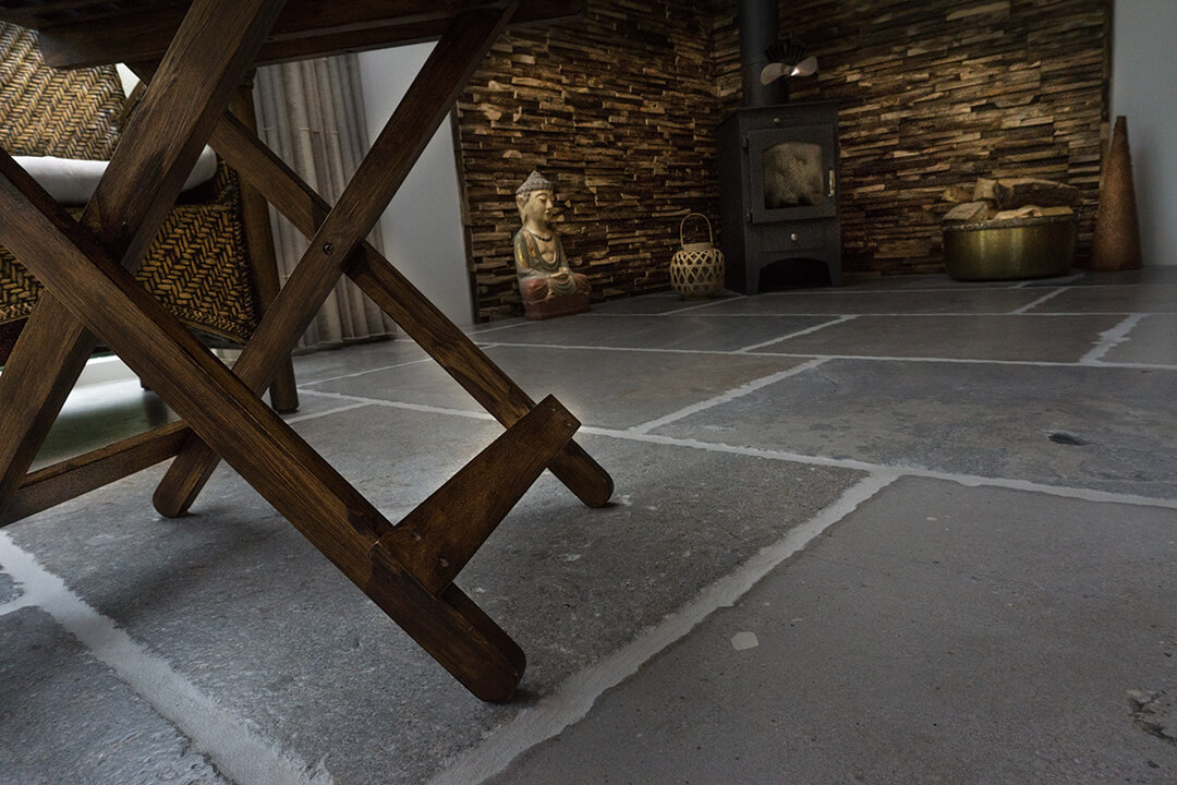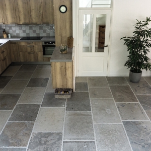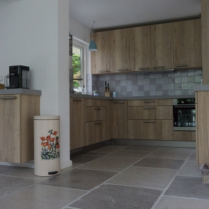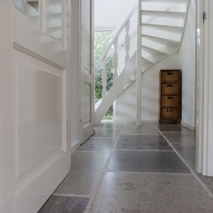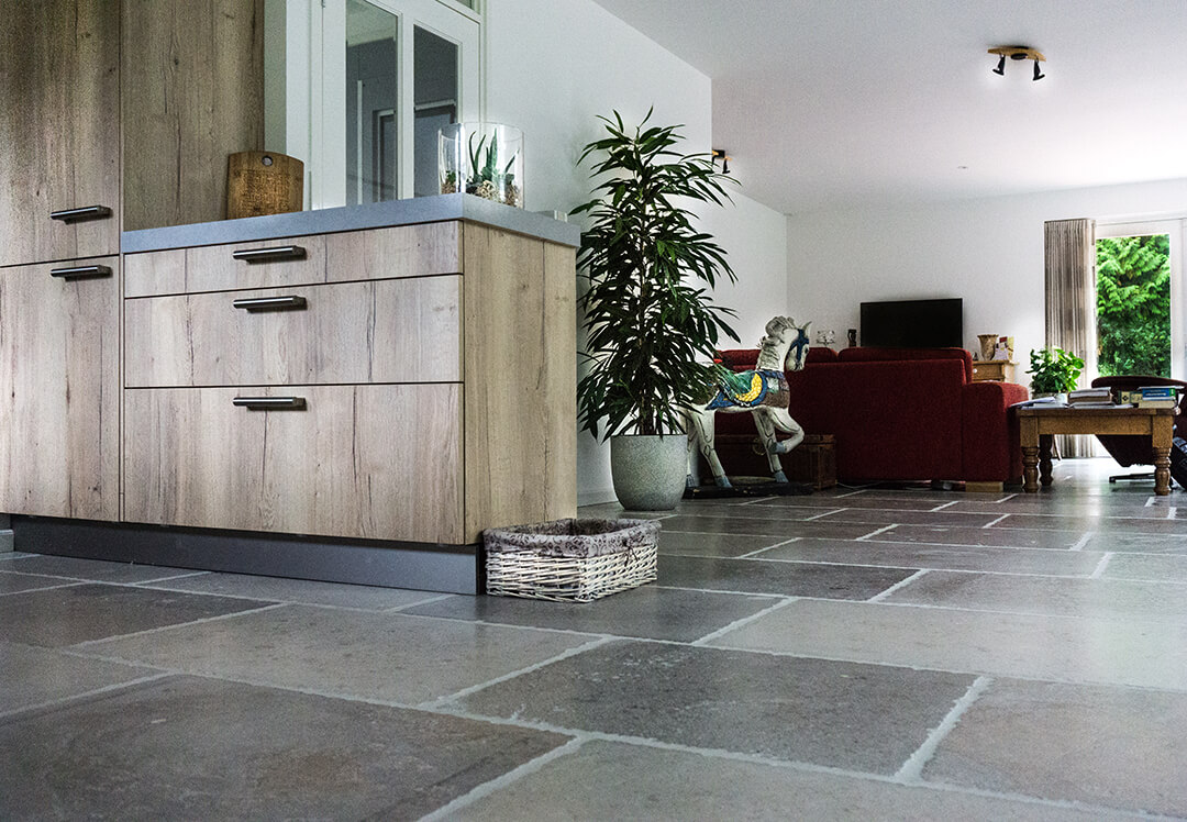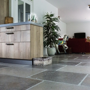 De verouderde zijdes en de robuustheid van deze Franse kalksteen zorgt voor een landelijk karakter in de woning van de familie Kleinbekman. Daarnaast zorgt het fijn geschuurde oppervlak voor een mooie matte uitstraling.