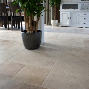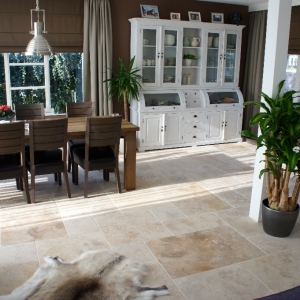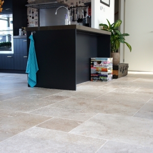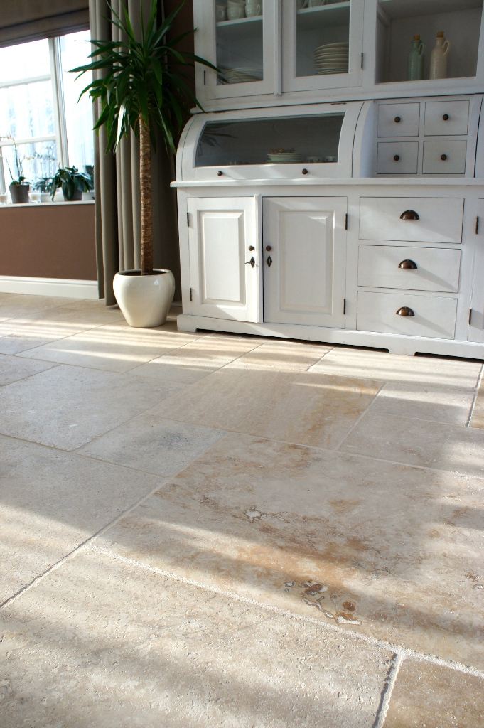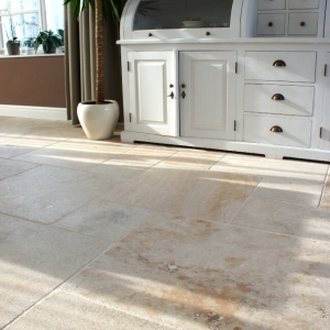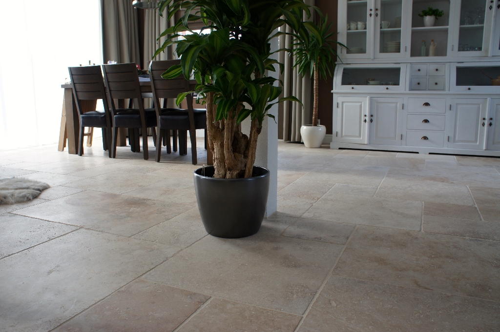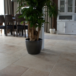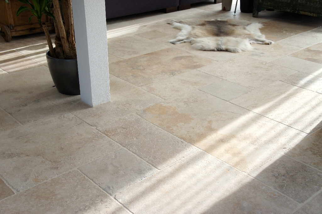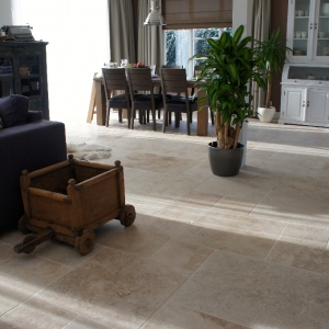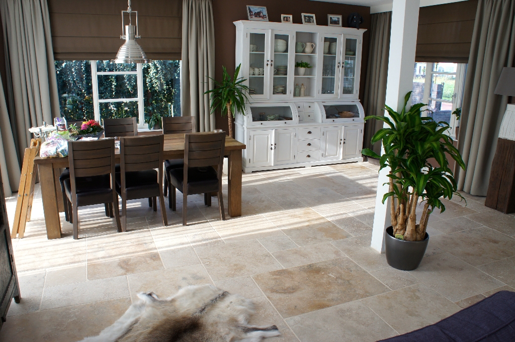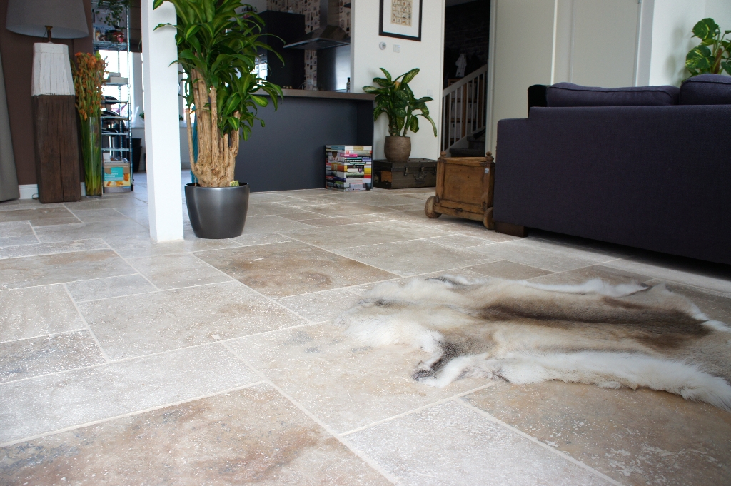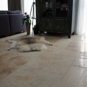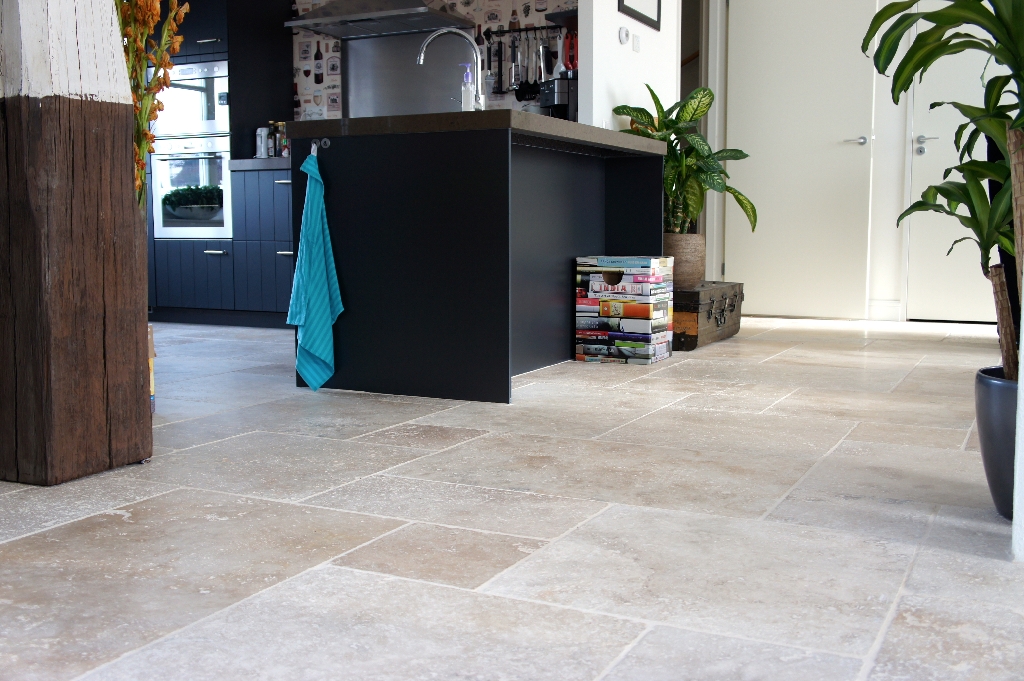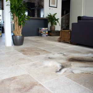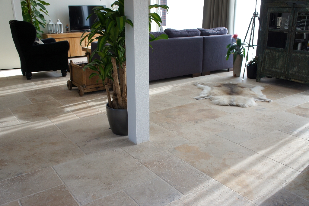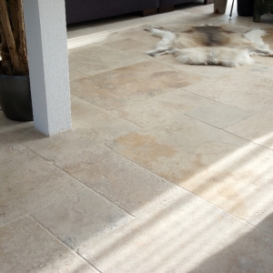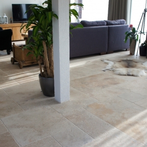 De familie Salome zocht een sfeervolle en warme vloer. Deze werd vervolgens gevonden in de Apulia Scabas “Anticato”. Deze steen is een travertin en hij past dan ook precies in de stijl van het huis. De tegels zijn gelegd volgens groot Romaans verband voor nog meer sfeer.