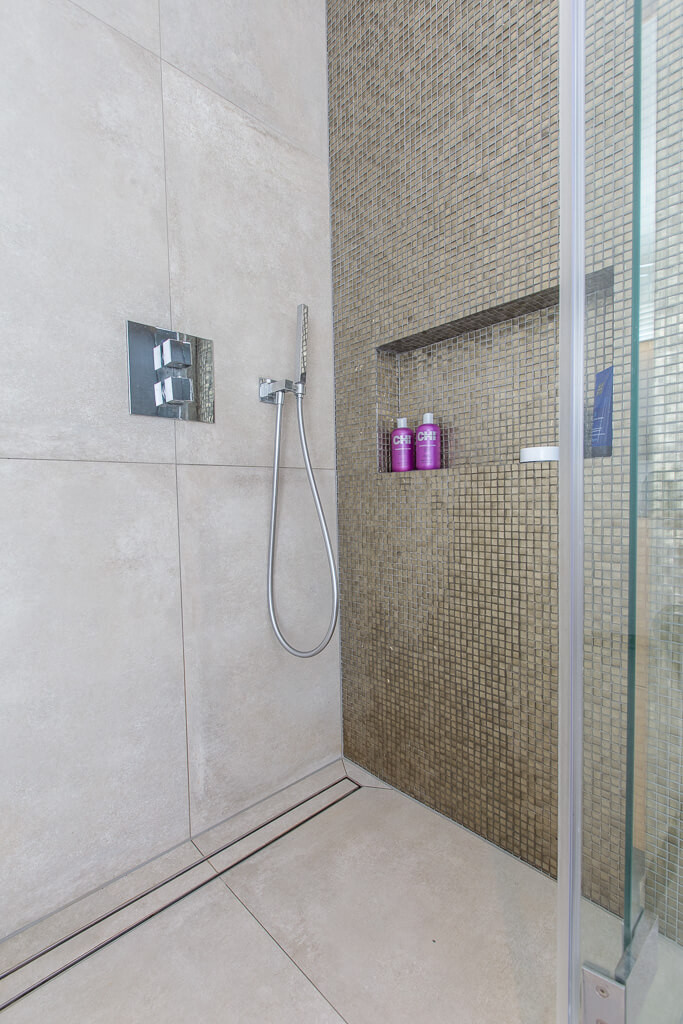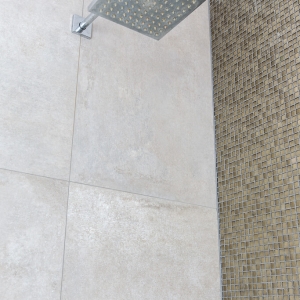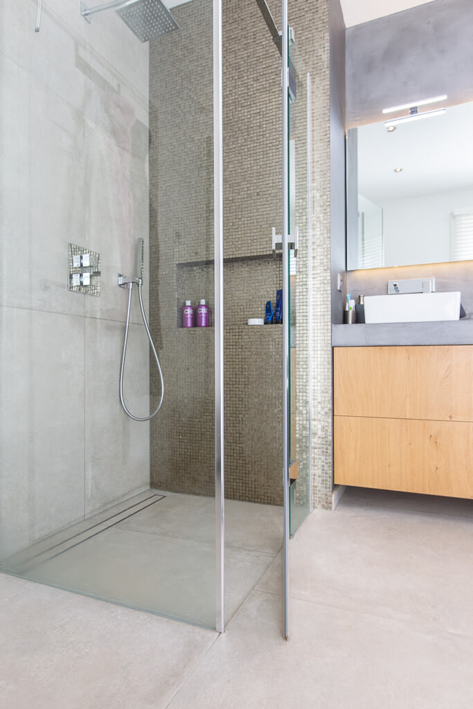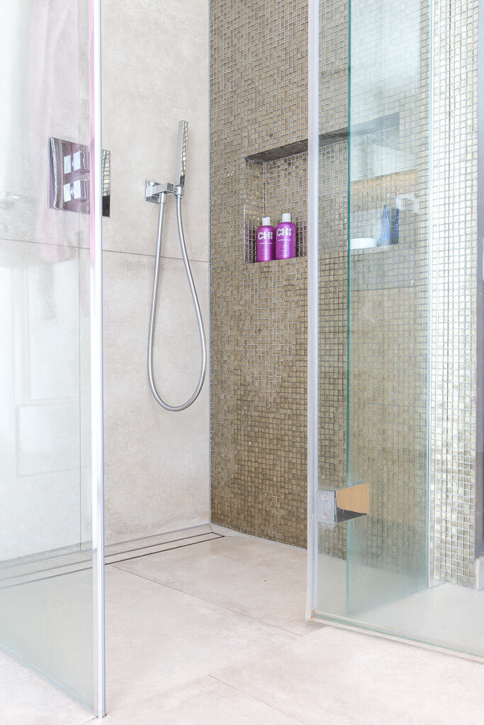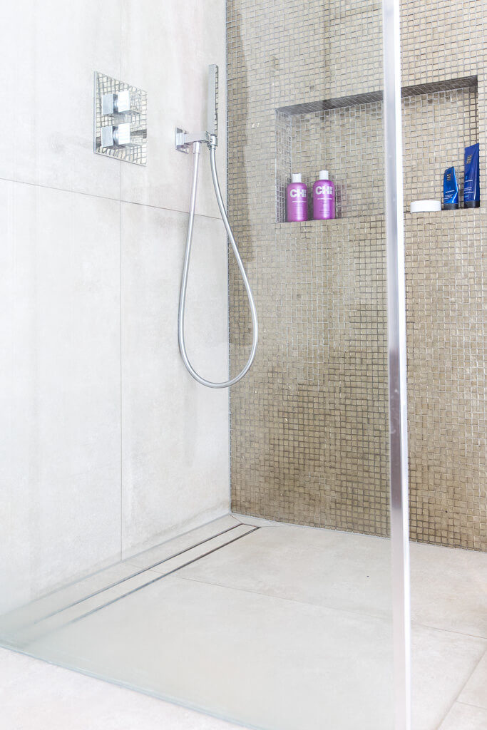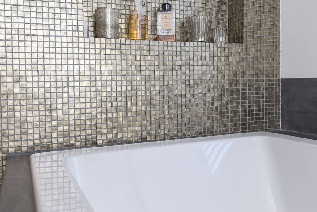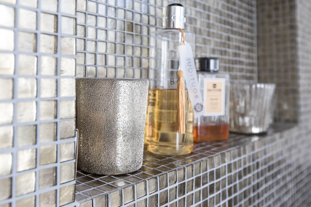 Na het bekijken van diverse soorten tegels in onze showroom is er gekozen voor de Cimento Piano “Grigio” en de Glass Mosaics San Marco Champagne. Wij hebben deze tegels dan ook mogen leveren. Bekijk hieronder het resultaat.